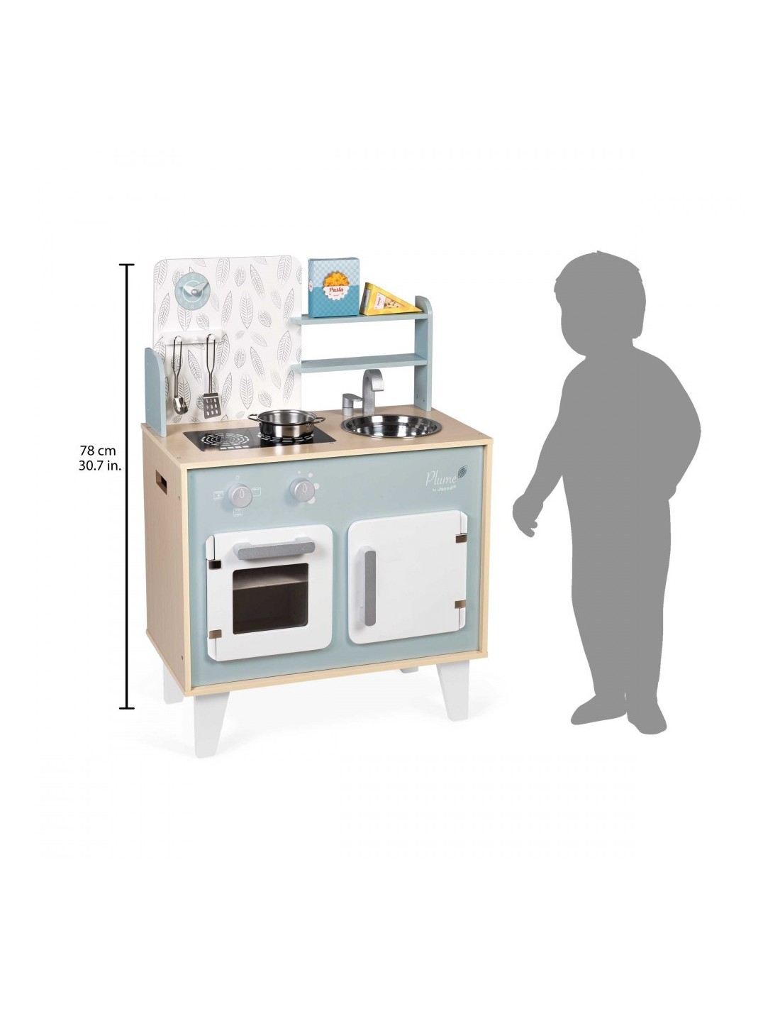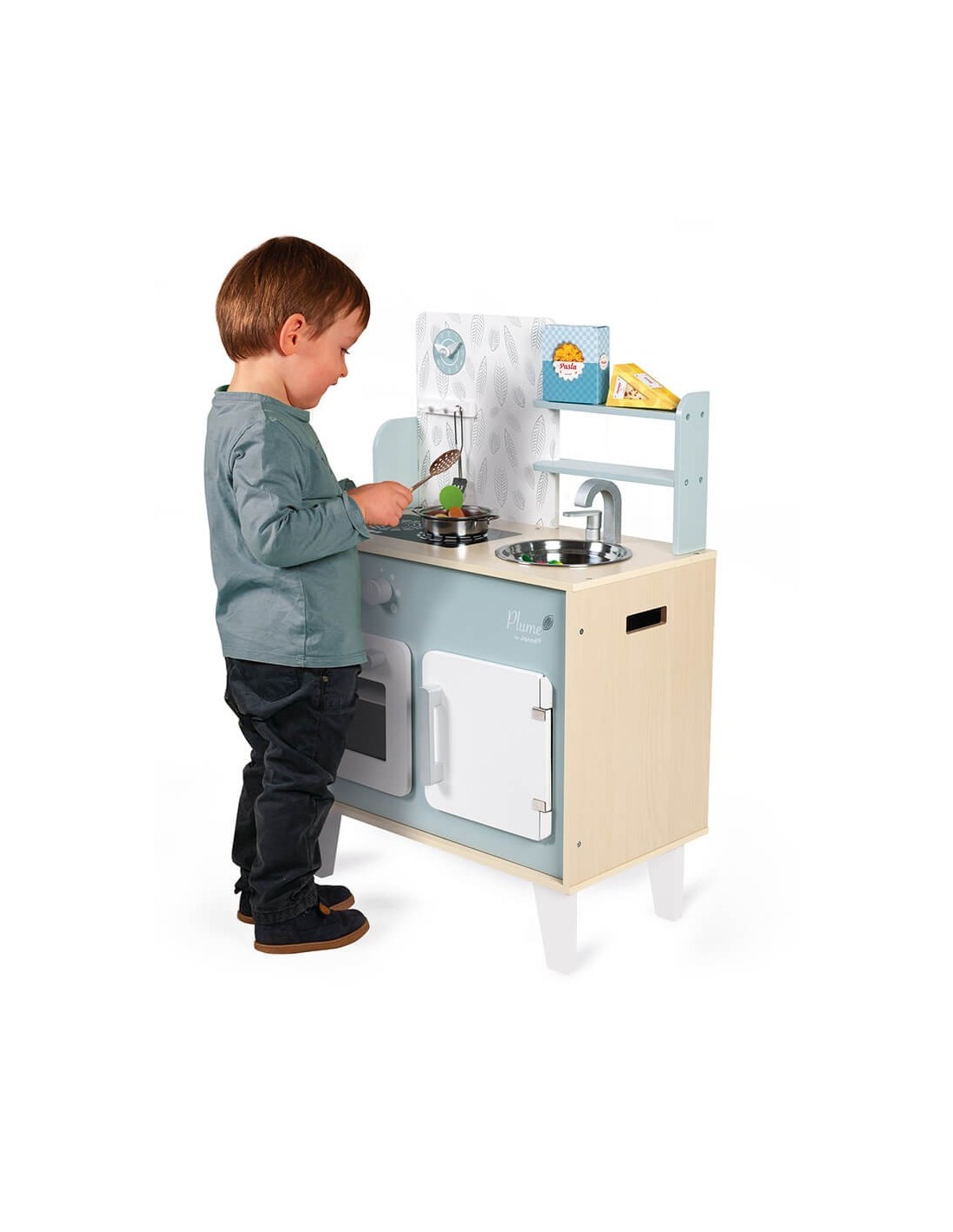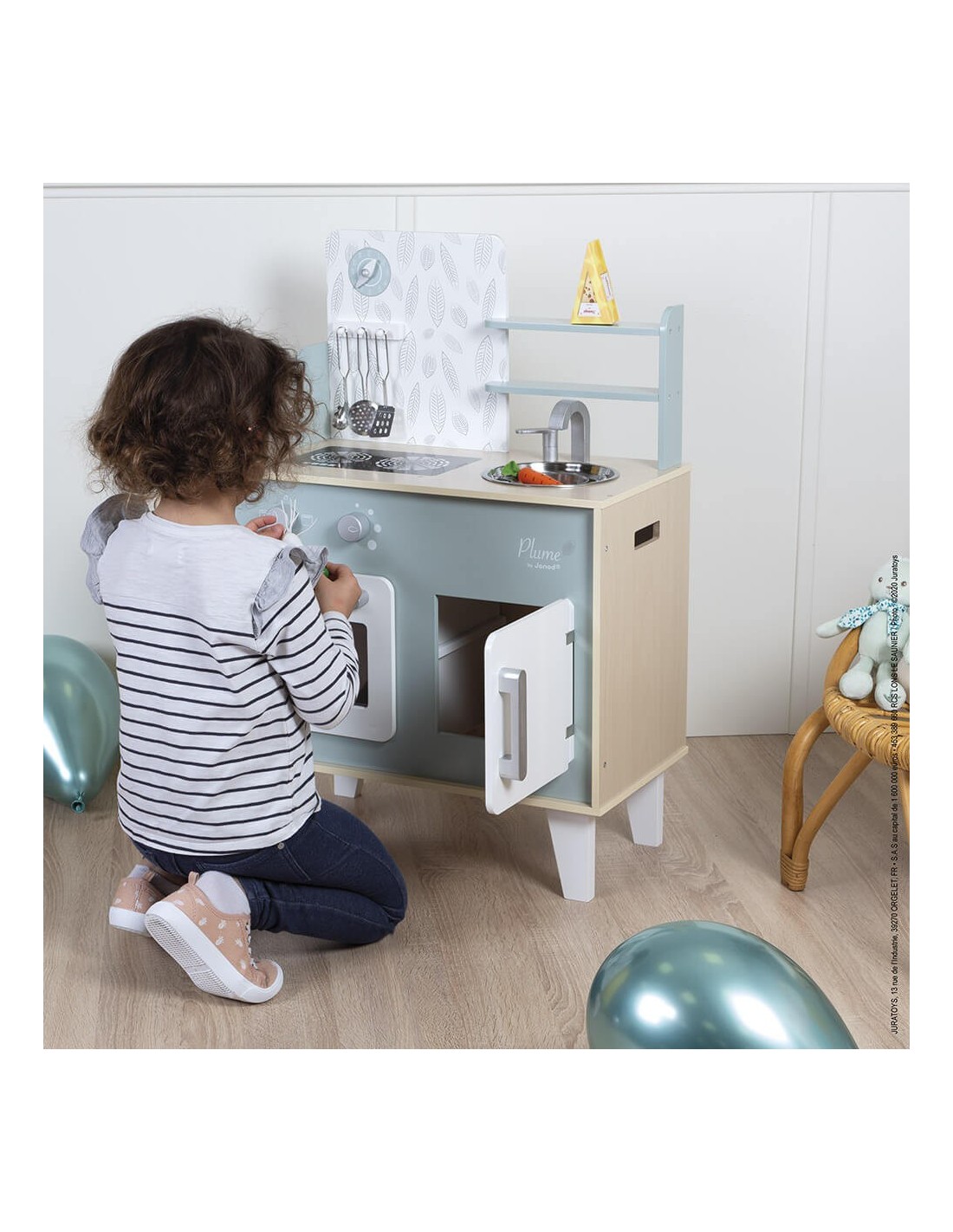 ¡Rápido, la cocina echa humo! ¡Hay que preparar la mejor comida para mamá y papá! Con la preciosa cocina Plume, hacer los platos más deliciosos es una auténtica delicia para los peques. Para convertirse en un gran chef, esta cocina de madera natural y tonos grises y azules tiene un montón de accesorios.