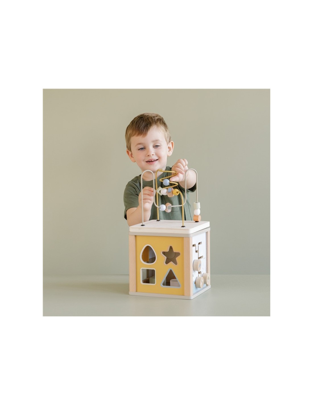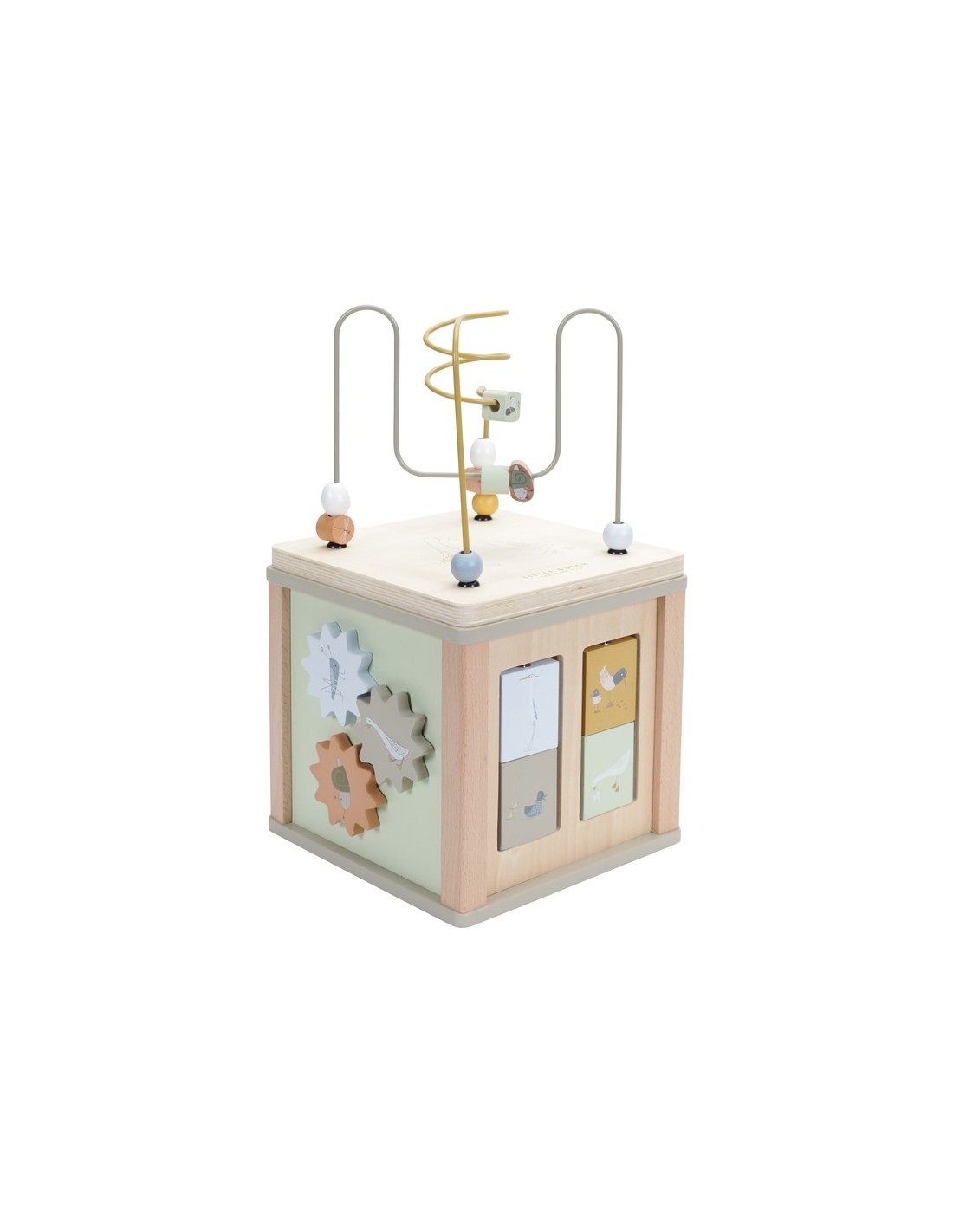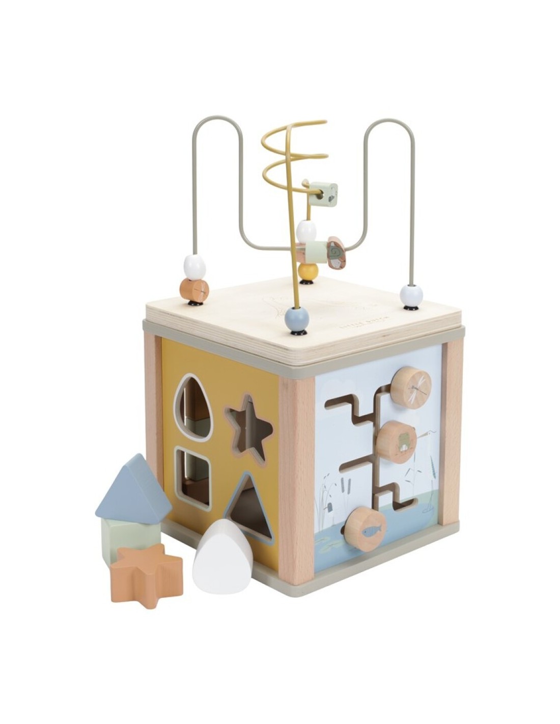 Este cubo de actividades de madera ofrece muchos desafíos para los niños. Cada lado cuenta con maravillosas ilustraciones de ocas y sus amigos y ofrece una actividad educativa diferente, que incluye un clasificador de formas, engranajes giratorios, rompecabezas y una divertida espiral de cuentas en la parte superior.