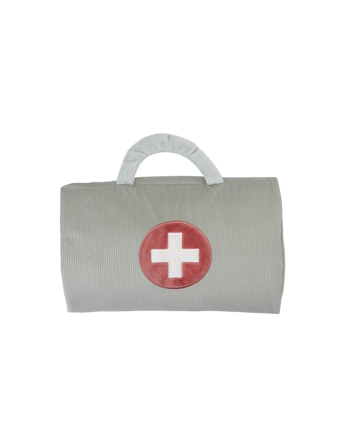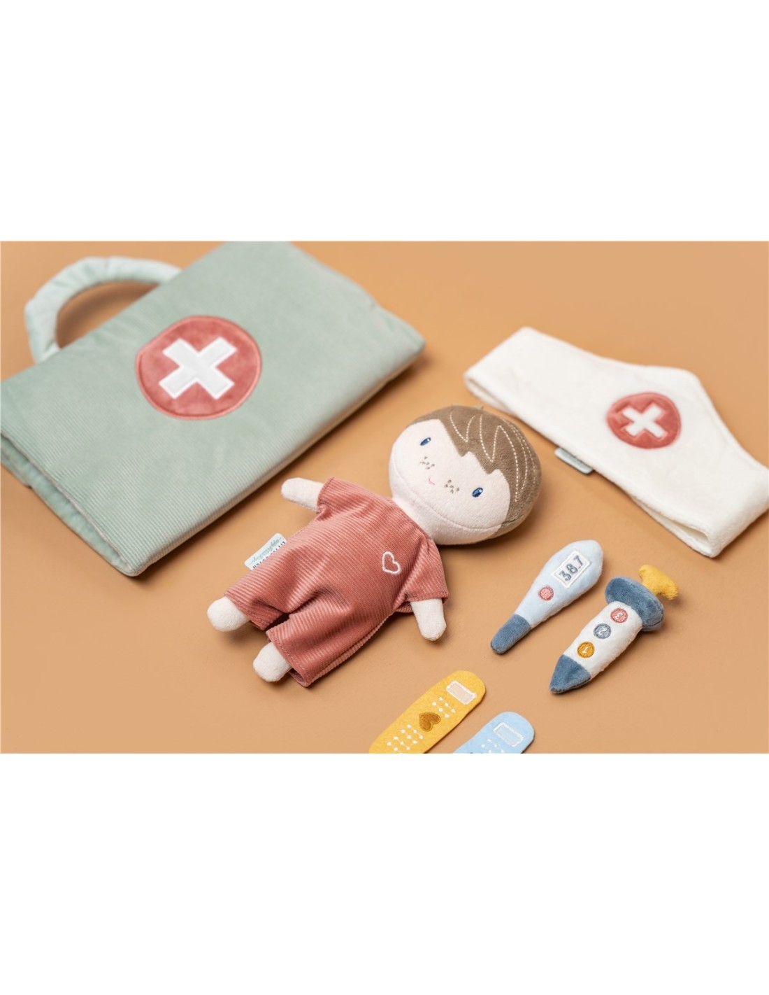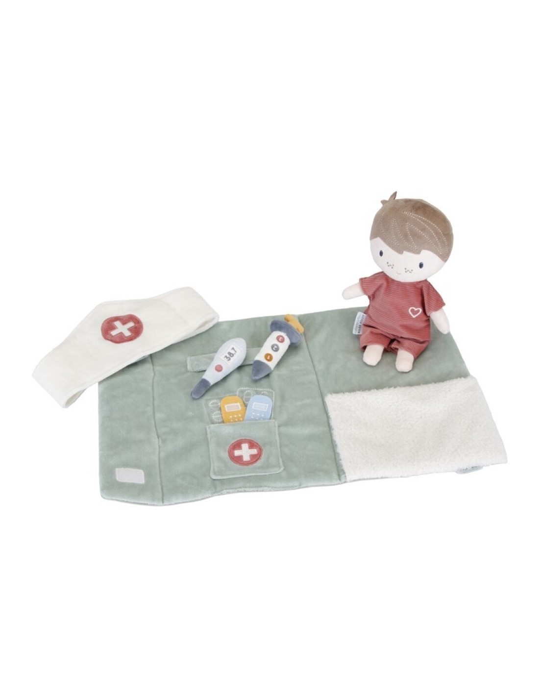 ¡Doctor, Jim necesita su atención! Mírelo en pijama, no puede esperar para jugar a la enfermera juntos. Puede encontrar todo lo que necesita para cuidarlo en su maleta. La suave maleta verde oliva se abre y se convierte en una cama de hospital y lleva lo esencial para tratar a un paciente.