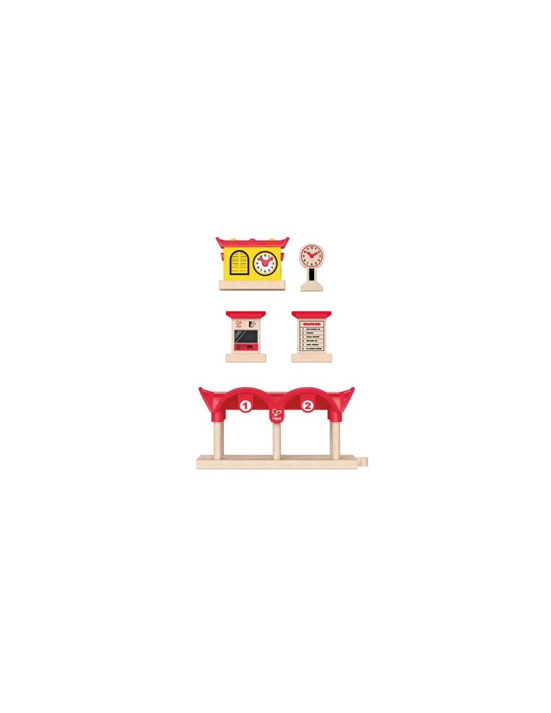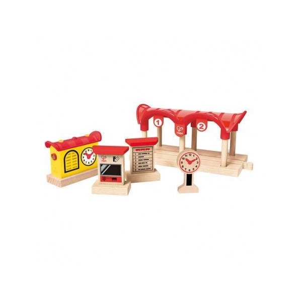 - Incluye: 1 caseta de la estación de color amarillo con luces y grabadora de voz, 1 parada de tren con el techo rojo, 1 ventanilla de pagos, 1 tablón de horarios y 1 reloj de pie.