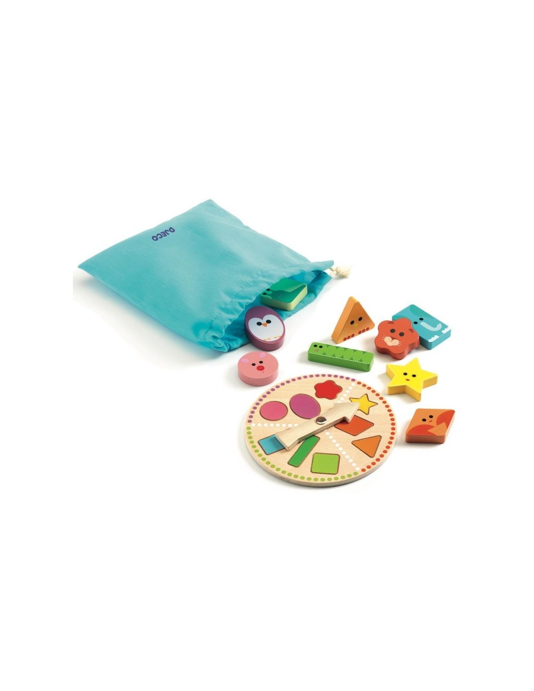 Incluye: 1 ruleta de madera, 1 bolsa de tela y 9 formas geométricas ilustradas de madera.