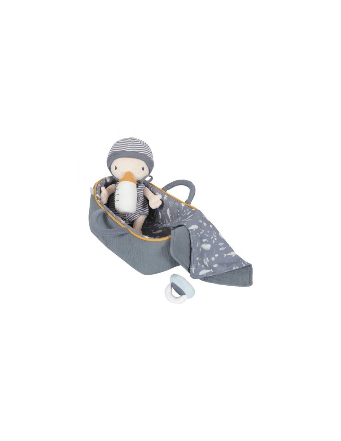 - Incluye: bebé, cesta, pañal, vestido, chupete, biberón. saco y mantita.