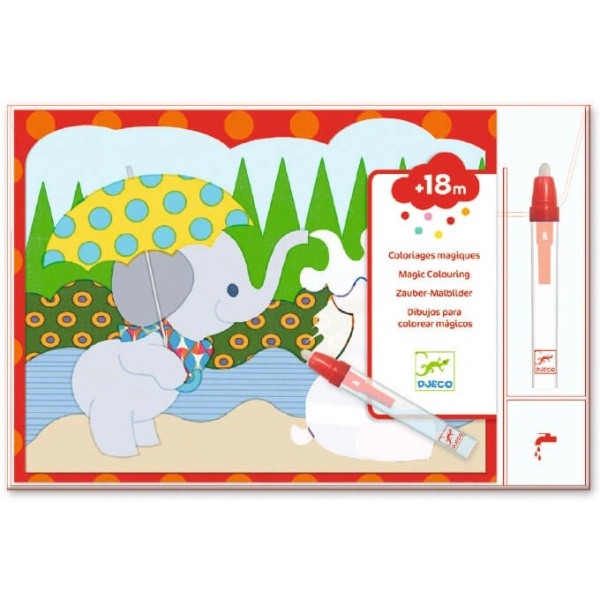 Un pack de acuarelas adecuado para niños a partir de 18 meses. El niño colorea las partes blancas con el lápiz de agua para descubrir lo que se esconde en el cielo. Es mágico: los dibujos aparecen y cambian de color. Las tablas se secan y el niño vuelve a empezar. ¡Efecto mágico! Un lápiz grande adecuado para manos pequeñas.