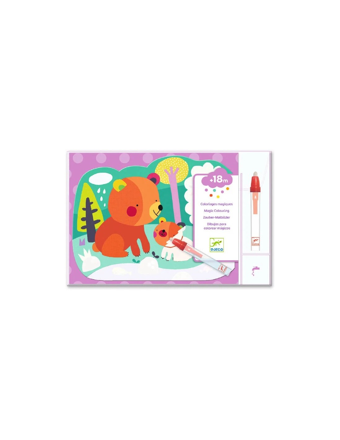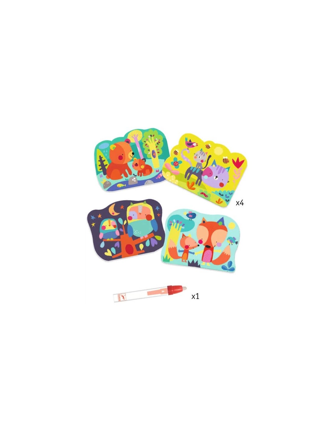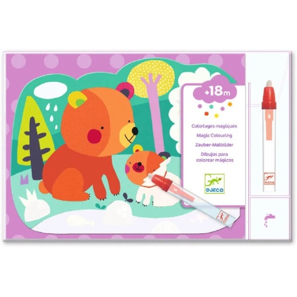 Un pack de acuarelas adecuado para niños a partir de 18 meses. El niño colorea las partes blancas con el lápiz de agua para descubrir lo que se esconde en el cielo. Es mágico: los dibujos aparecen y cambian de color. Las tablas se secan y el niño vuelve a empezar. ¡Efecto mágico! Un lápiz grande adecuado para manos pequeñas.