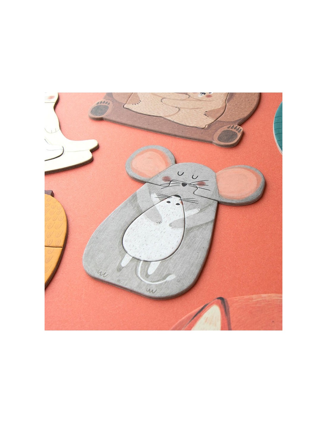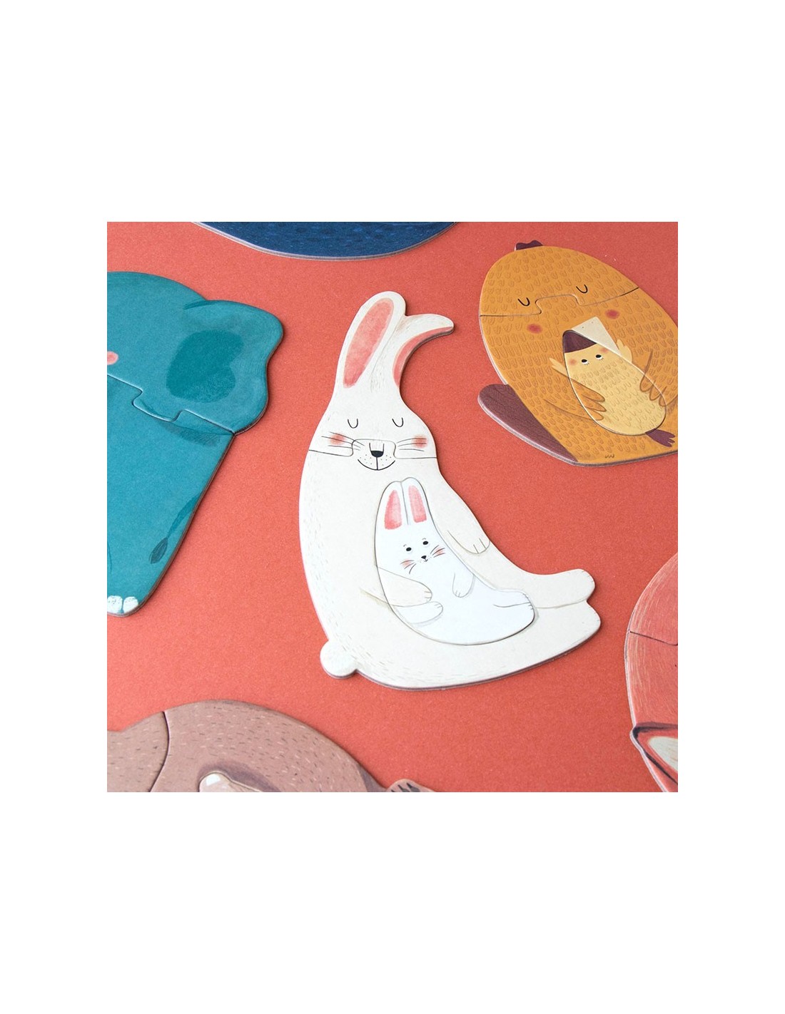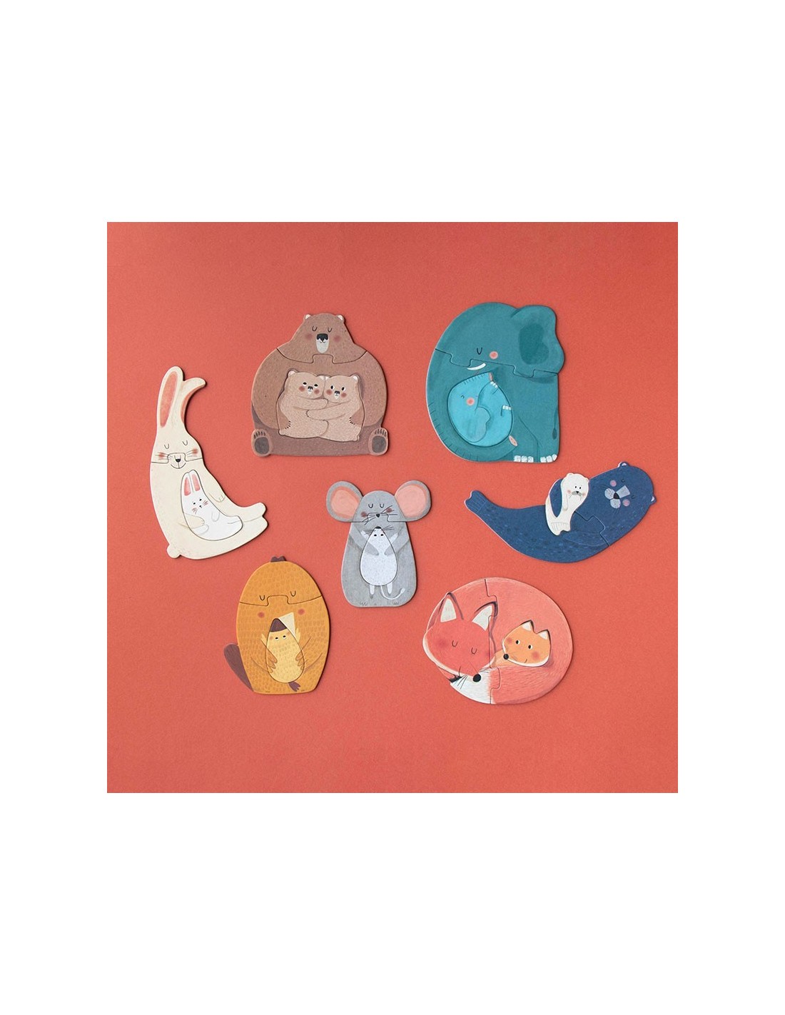 7 puzzles de 3 piezas grandes de ilustraciones de distintos animales abrazando a sus crías.