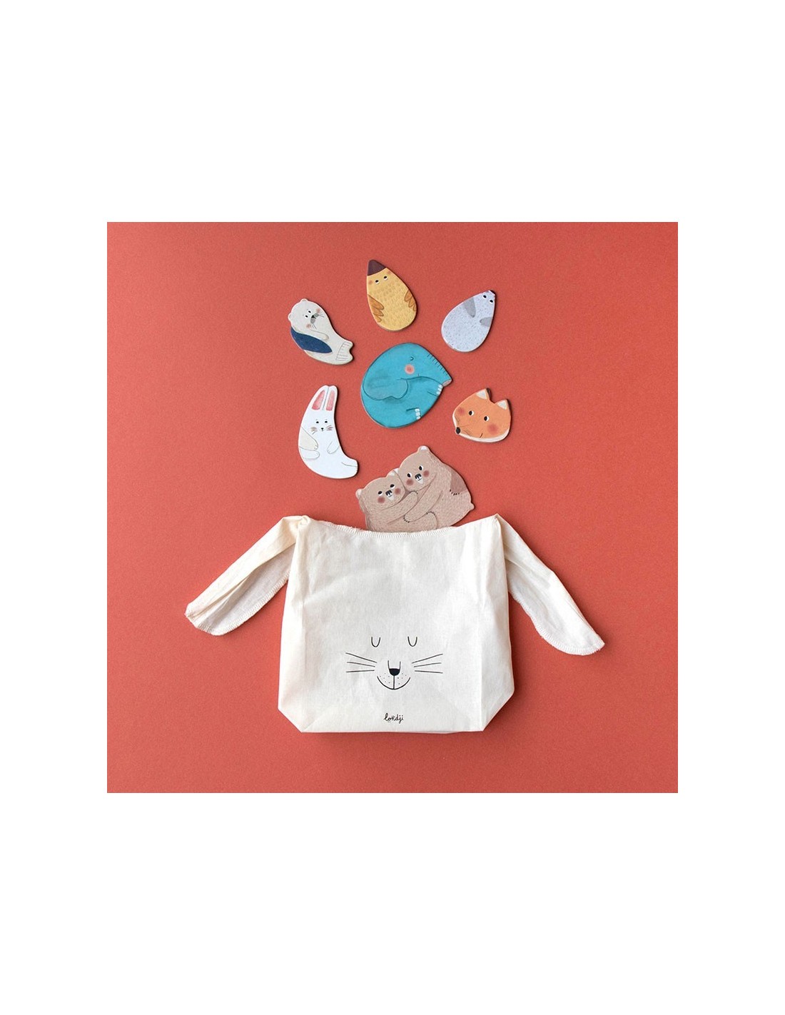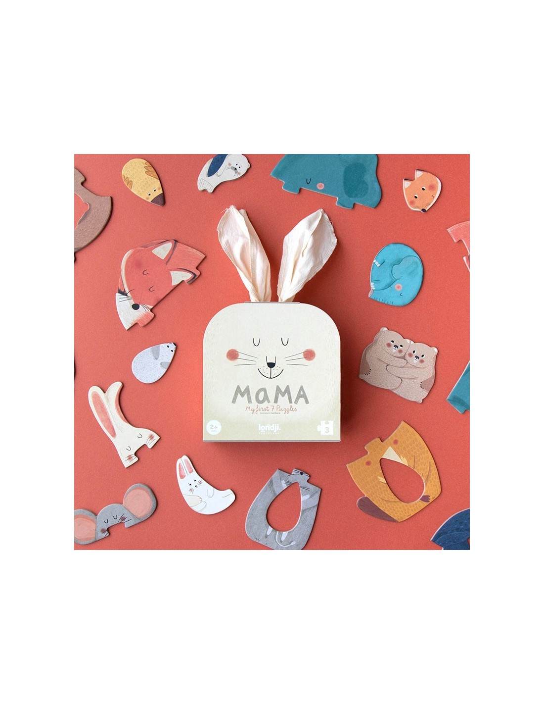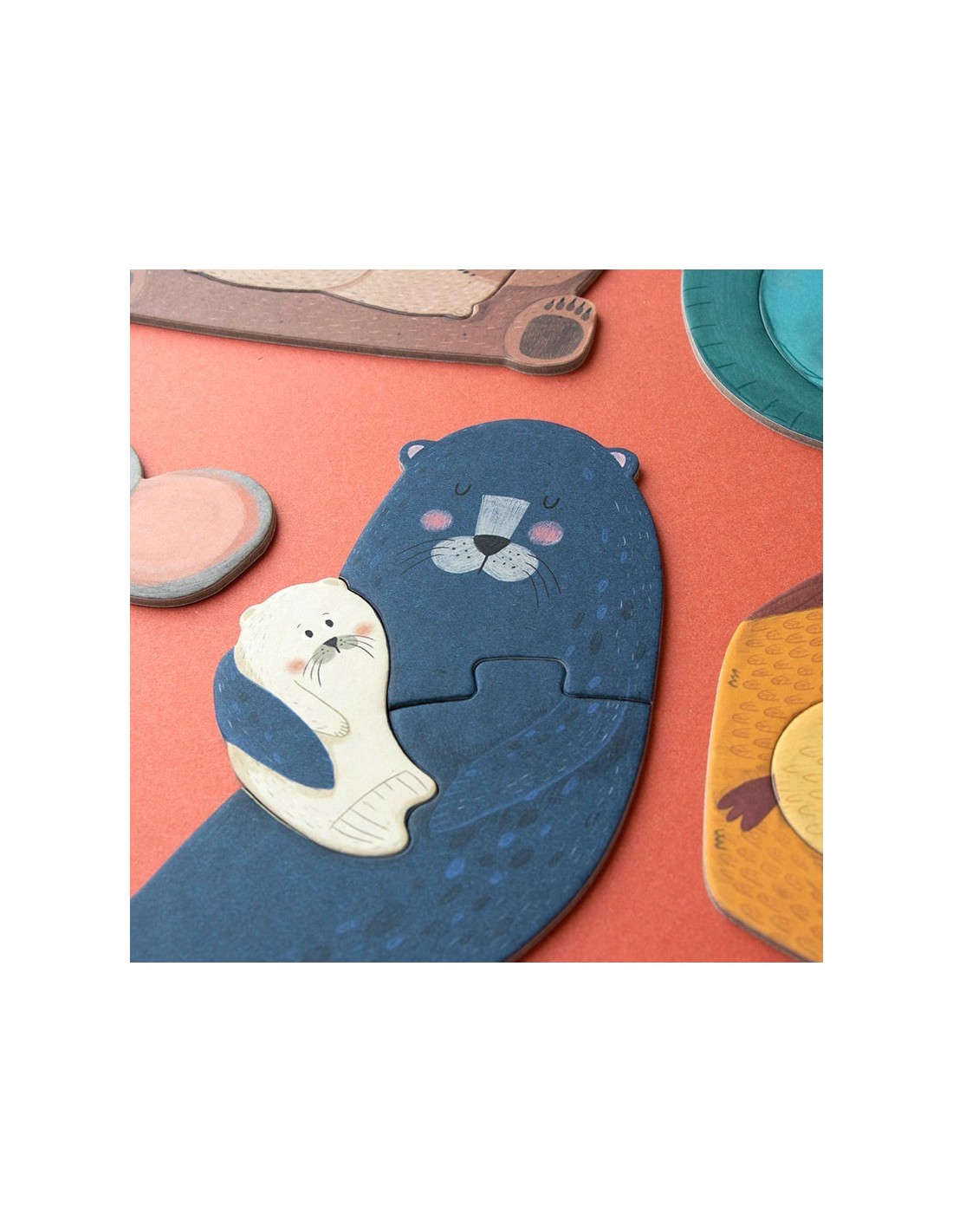 7 puzzles de 3 piezas grandes de ilustraciones de distintos animales abrazando a sus crías.