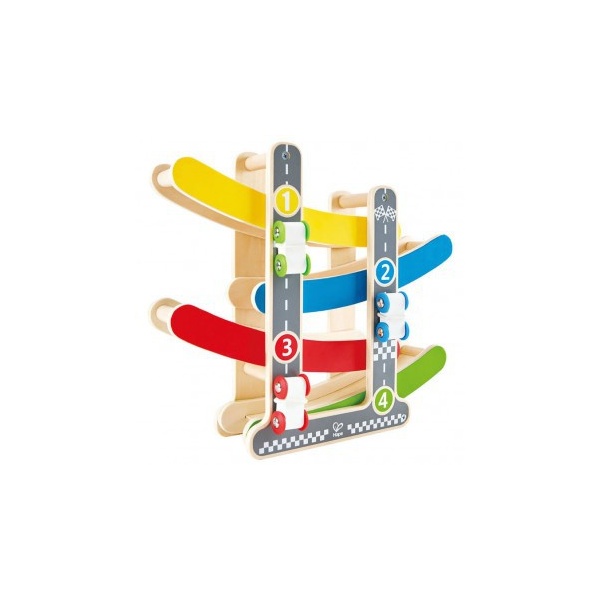 ¡Mira cómo giran tus coches de carreras unos sobre otros mientras bajan por el circuito de coche de carreras de HAPE! ¿Qué coche de carreras crees que ganará? ¡Haz una competición con todos ellos y apunta los resultados! Edad: +18m