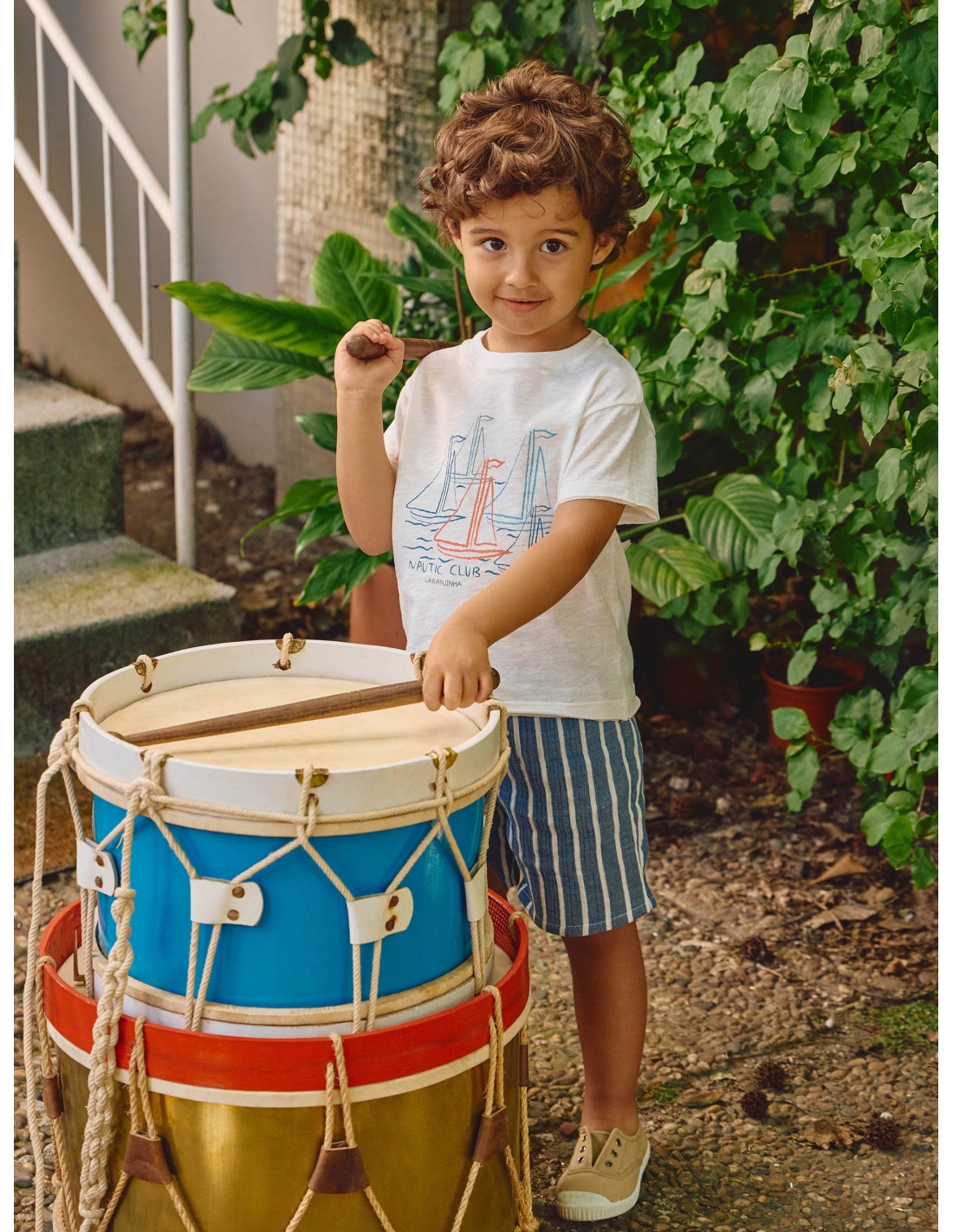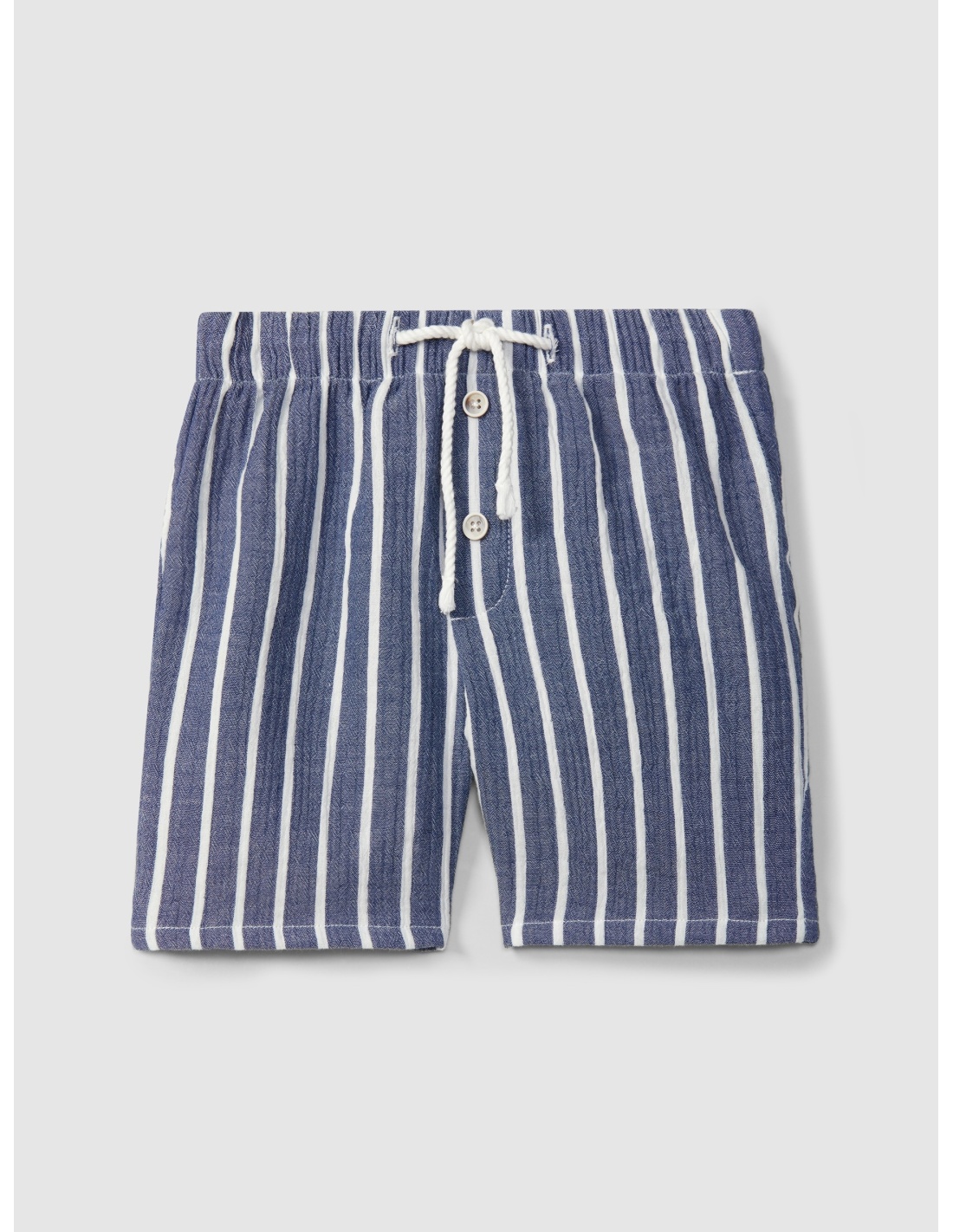 Pantalón corto pull-up confeccionado en gasa 100% algodón, ligero y suave al tacto, ideal para los días más cálidos. Su delicado estampado a rayas aporta un aire fresco y atemporal, mientras que su diseño cómodo y relajado permite total libertad de movimiento. Una prenda versátil y fácil de combinar, perfecta para looks veraniegos llenos de naturalidad y estilo.