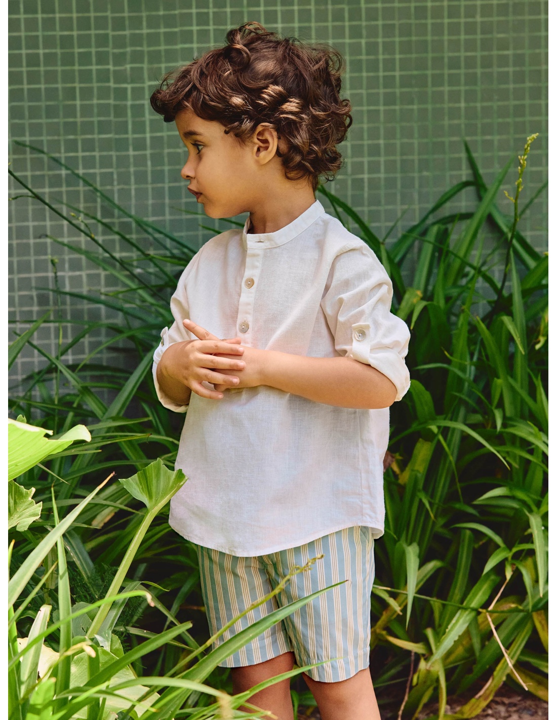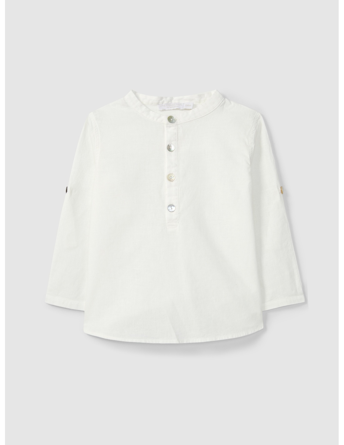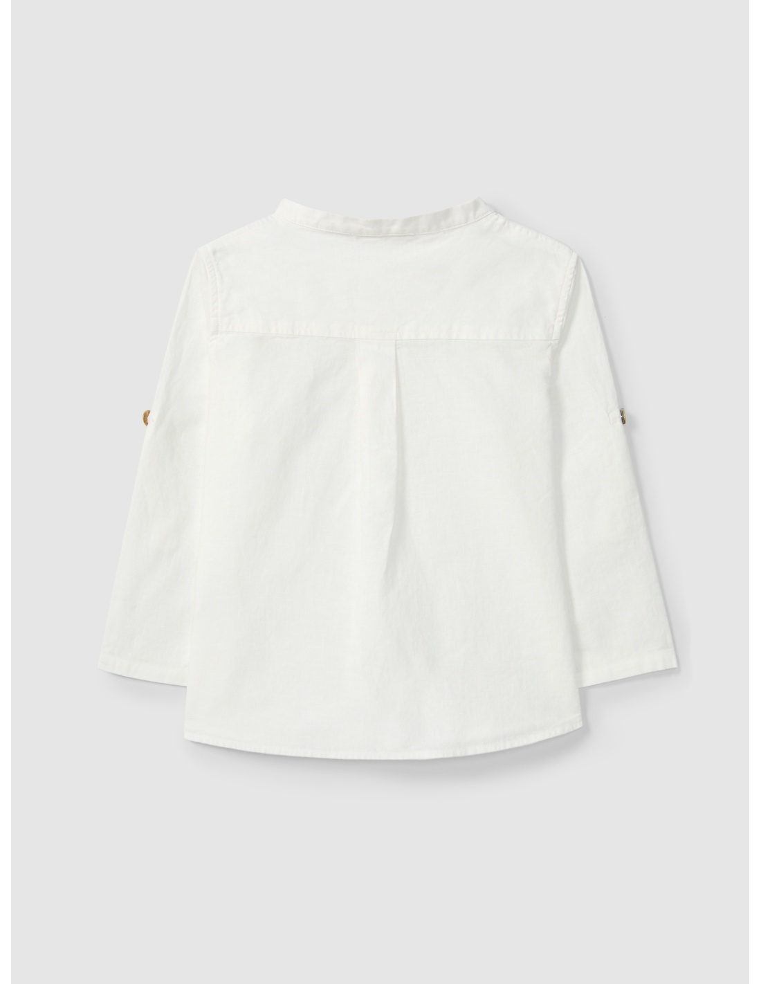 Camisa de lino con elegante cuello mandarín y manga con trabilla que permite lucirla también como opción de manga corta. Se abrocha al frente con delicados botones de nácar de Laranjinha, combinando estilo, comodidad y un toque sofisticado perfecto para cualquier ocasión.