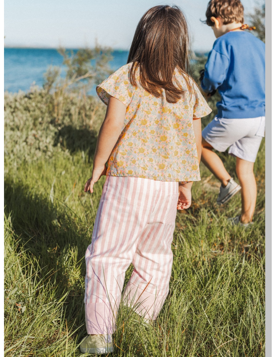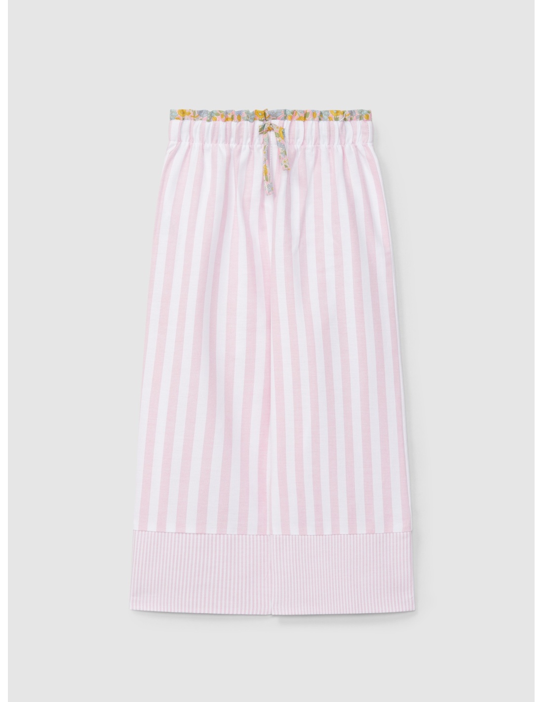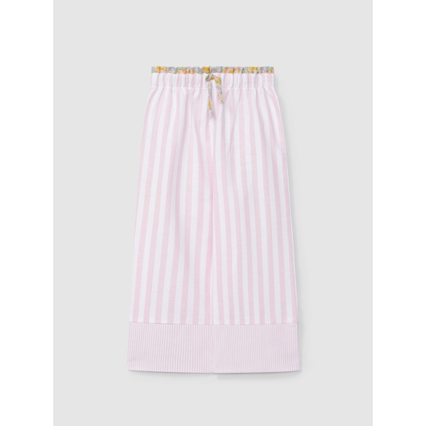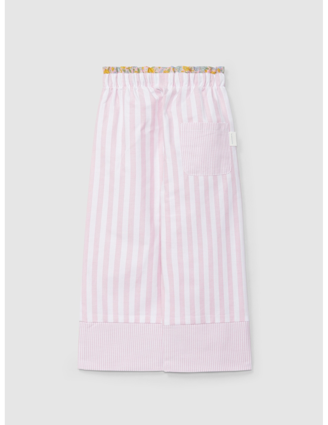 Pantalón ancho en tela oxford en combinación de rayas anchas y finas. Detalle de tejido Liberty en la cintura y bolsillo trasero. Cordón funcional para mayor ajuste.