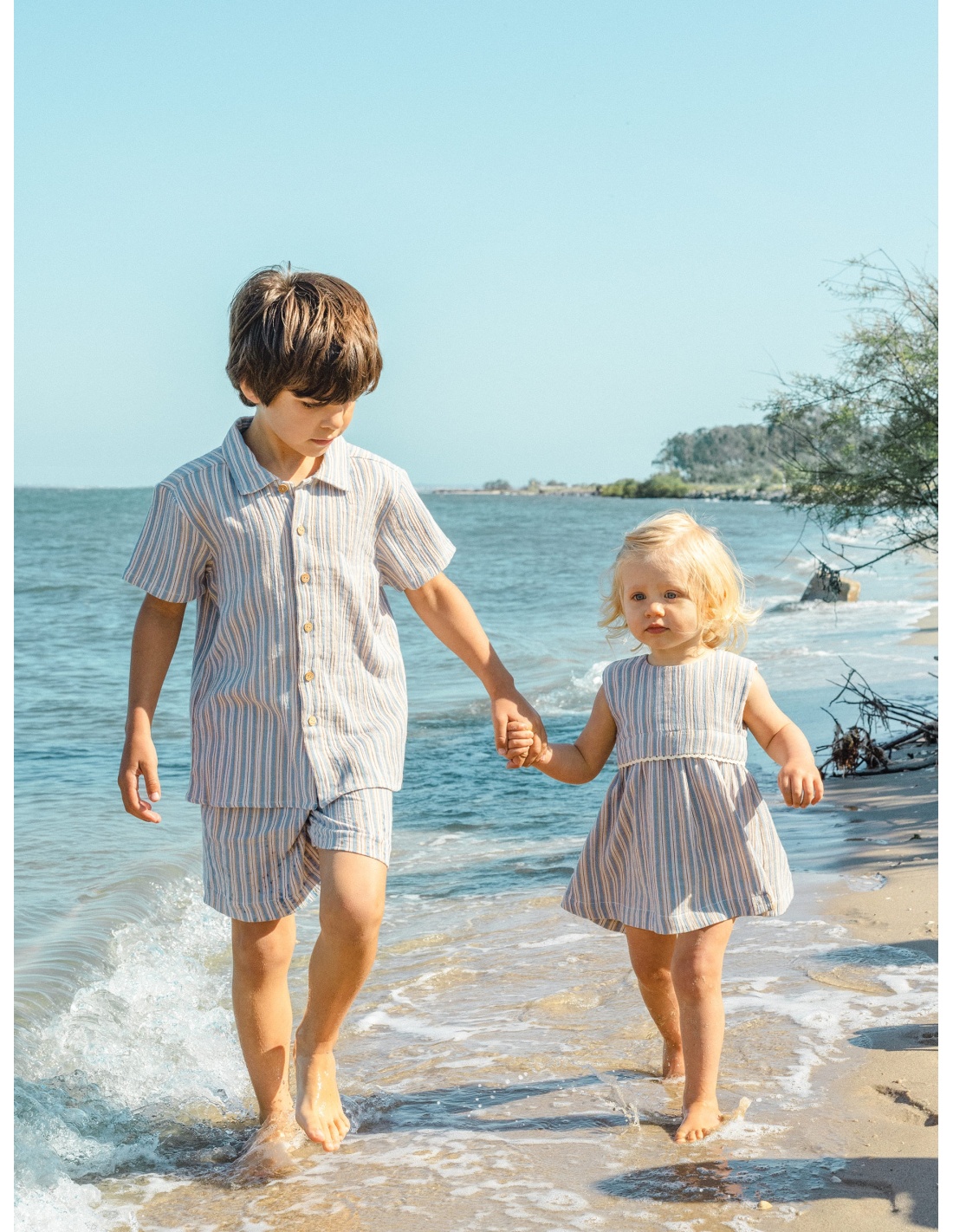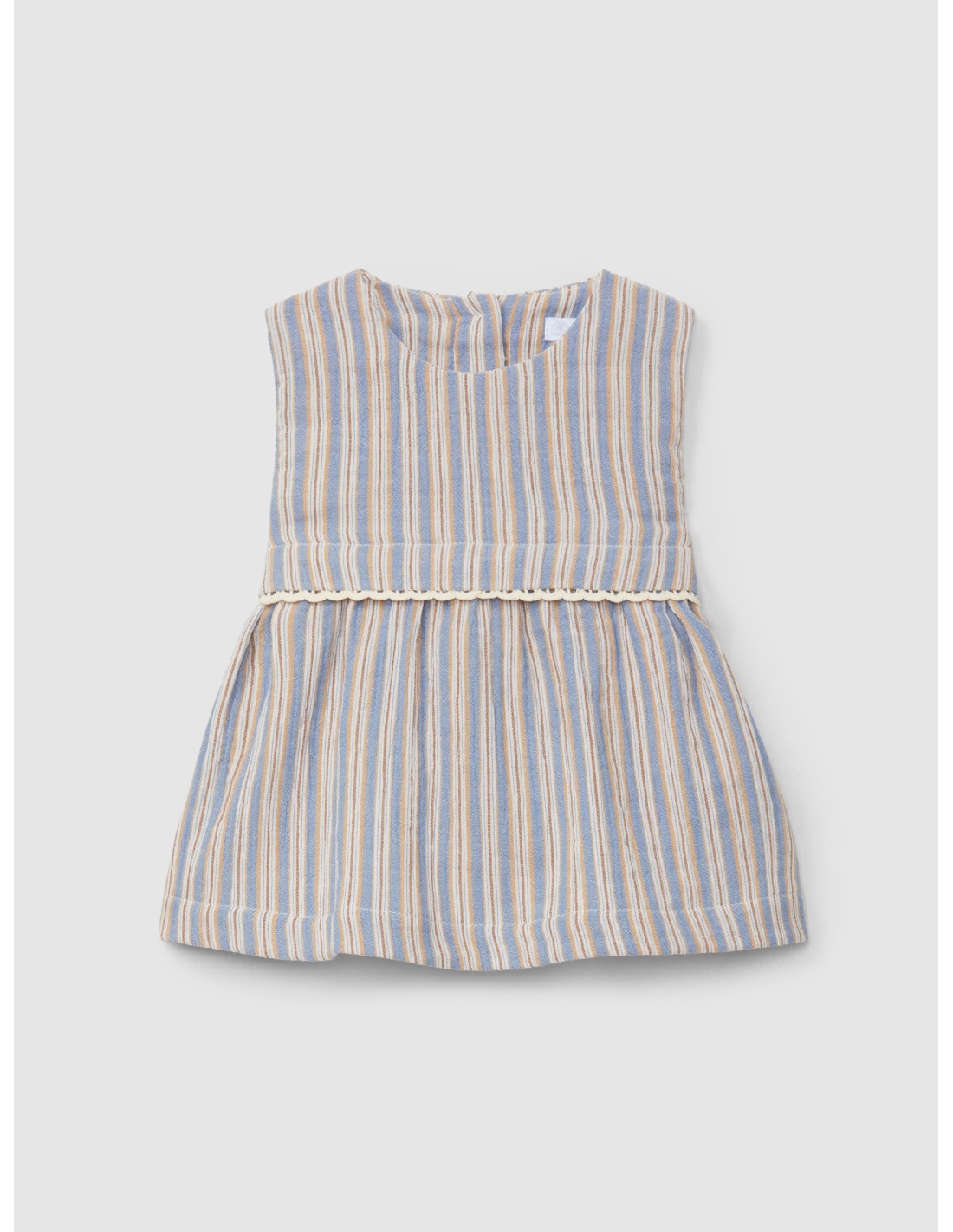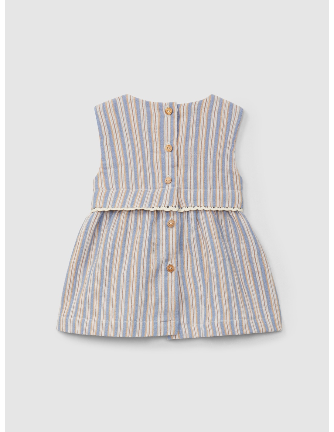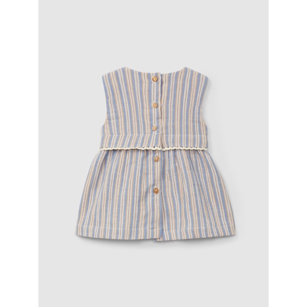 Vestido en tejido ligero a rayas multicolor 100% algodón. Aplicación de encaje en el contorno. Cierra con botones de madera Laranjinha en la espalda.