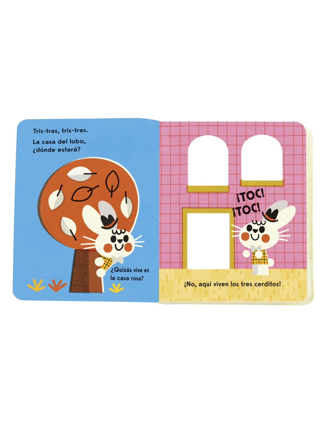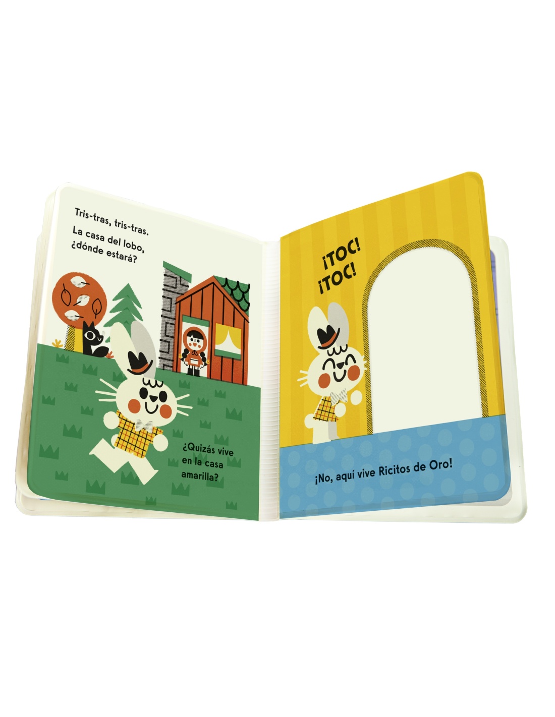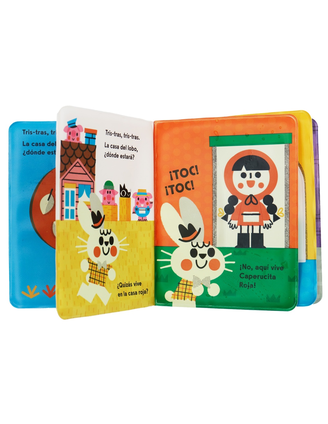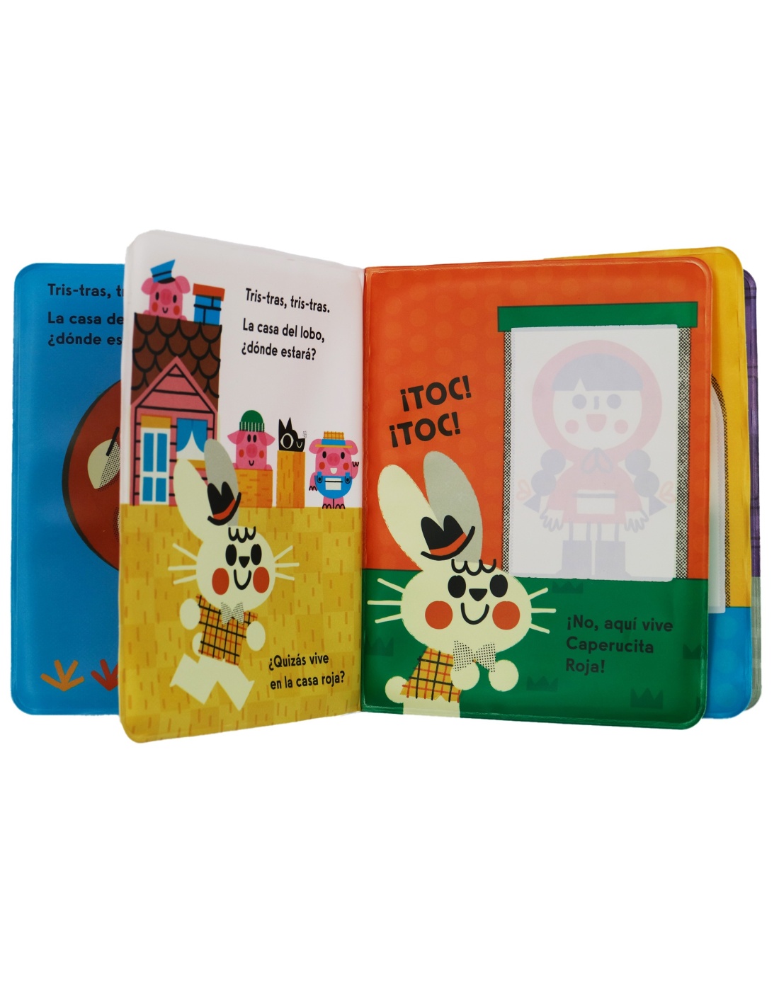 ¿Qué personaje de cuento se esconde detrás de cada puerta? Una divertida historia en un libro de baño con tinta mágica. Embarcaos en una divertida aventura con el intrépido conejito blanco, mientras salta por las páginas buscando al lobo feroz de los cuentos populares. Para encontrarlo, el conejito llama a la puerta de Ricitos de Oro, de los tres cerditos y de Caperucita Roja. Un libro de baño ilustrado por Pintachán, con elementos escondidos que quedan al descubierto cuando se mojan.