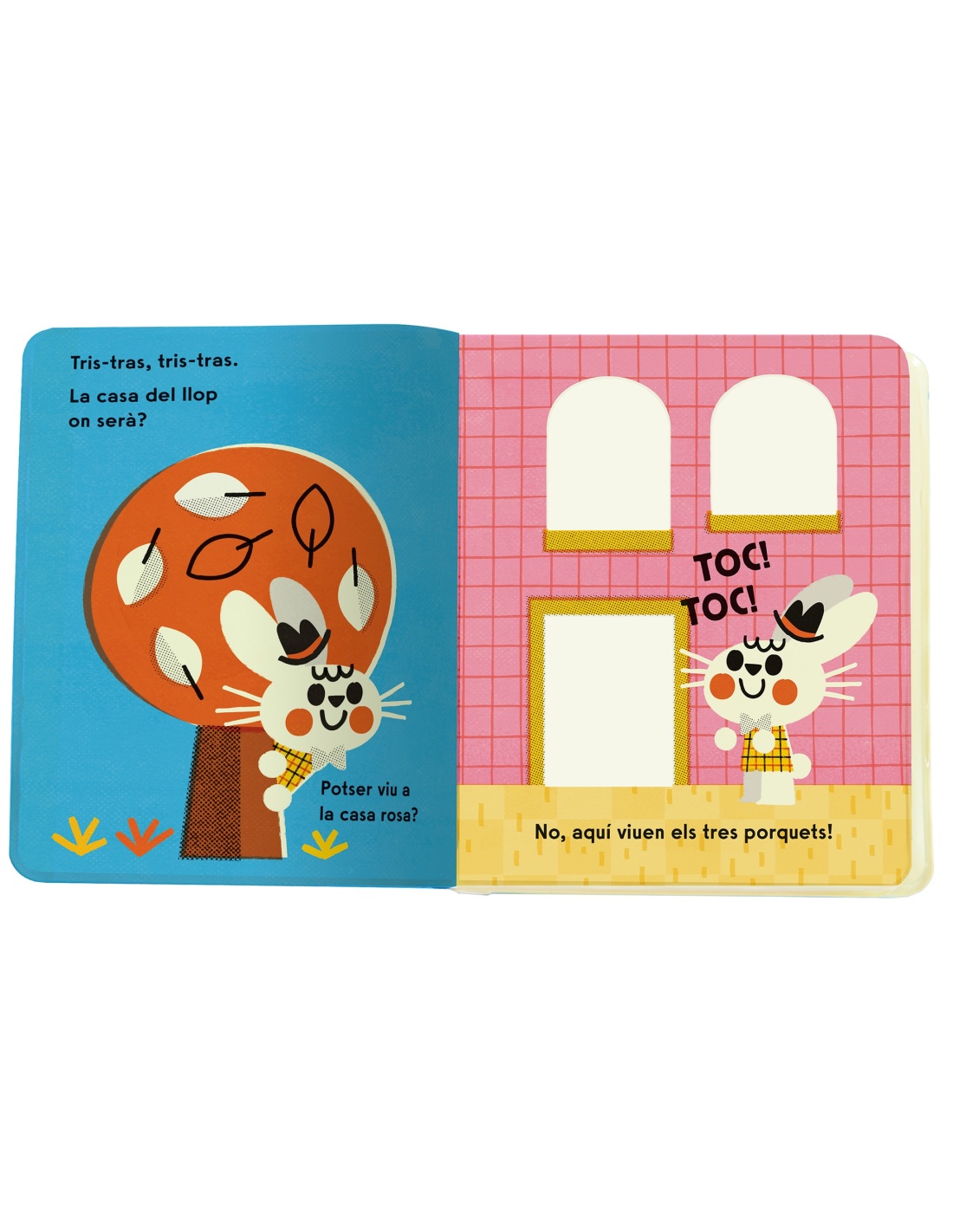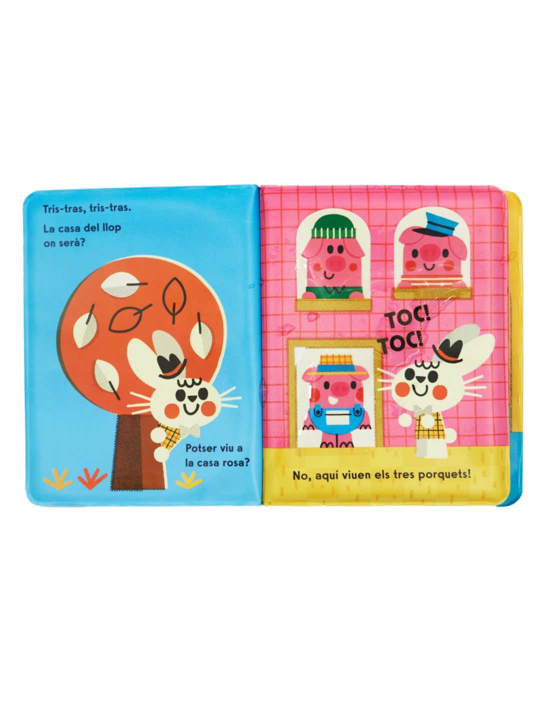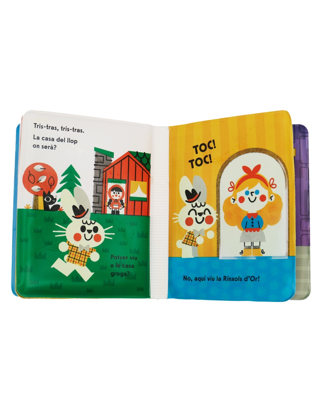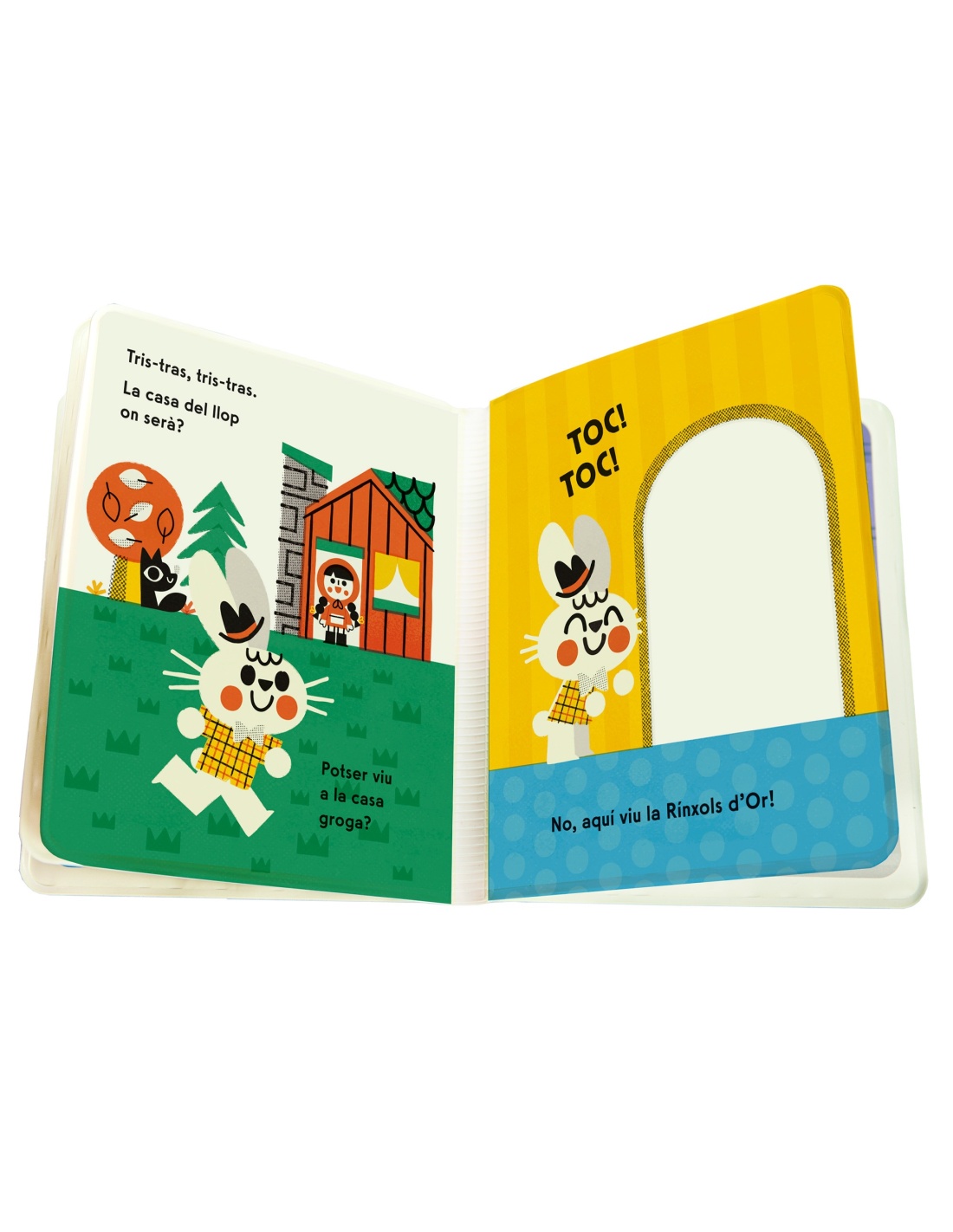 ¿Qué personaje de cuento se esconde detrás de cada puerta? Una divertida historia en un libro de baño con tinta mágica. Embarcaos en una divertida aventura con el intrépido conejito blanco, mientras salta por las páginas buscando al lobo feroz de los cuentos populares. Para encontrarlo, el conejito llama a la puerta de Ricitos de Oro, de los tres cerditos y de Caperucita Roja. Un libro de baño ilustrado por Pintachán, con elementos escondidos que quedan al descubierto cuando se mojan.