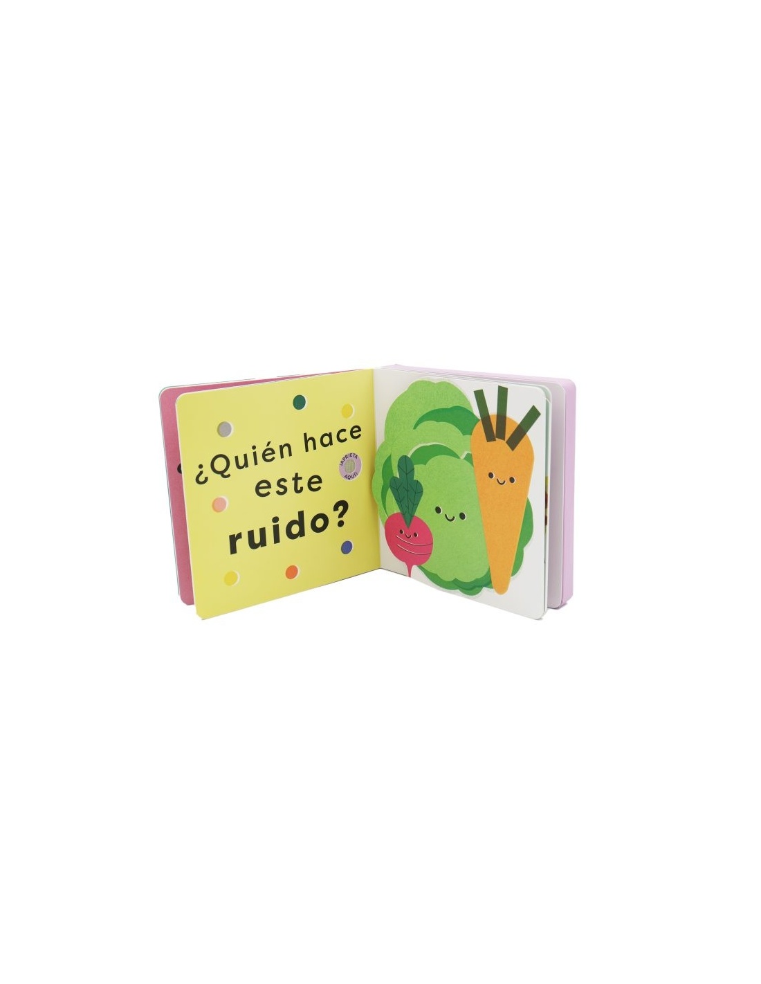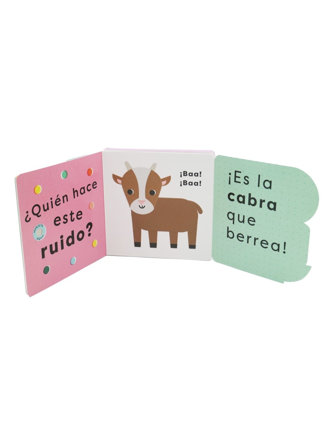 ¿Quién hace este ruido? con solapas y sonidos en todas las páginas, y un espejo como sorpresa final. Después de escuchar el sonido de cada página, los niños y niñas pueden jugar a adivinar qué animal se esconde bajo las solapas. ¡El patito, la cabra, el conejo y el pollito no tendrán secretos para los más pequeños de la casa!