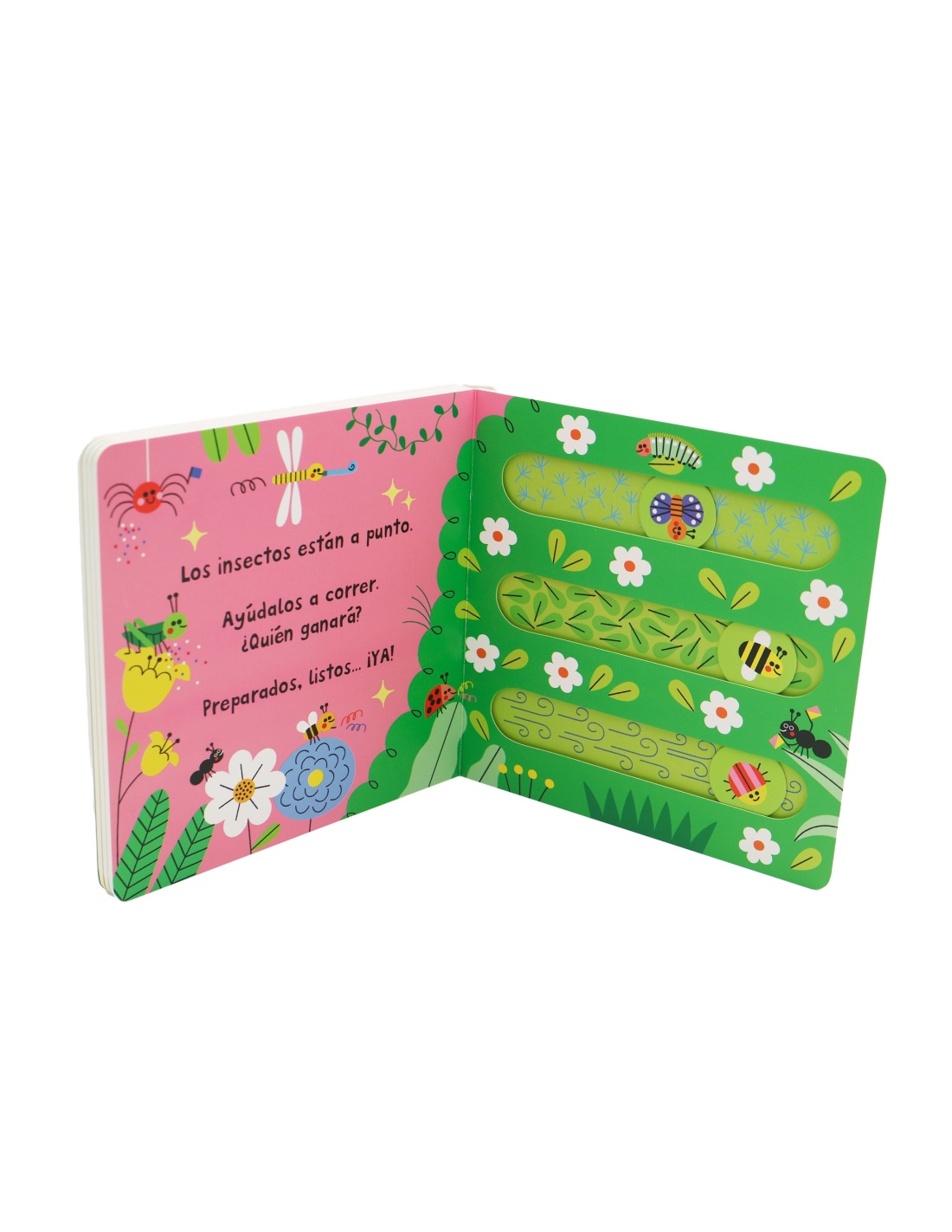 Este libro propone una experiencia divertida y participativa para los más pequeños. Cada página incluye un ingenioso mecanismo que, al inclinar el libro, hace que las piezas con forma de insectos cobren vida y se muevan. Los niños podrán seguir la carrera, animar a sus insectos favoritos y descubrir quién cruza primero la meta, convirtiendo la lectura en un juego lleno de emoción y movimiento.