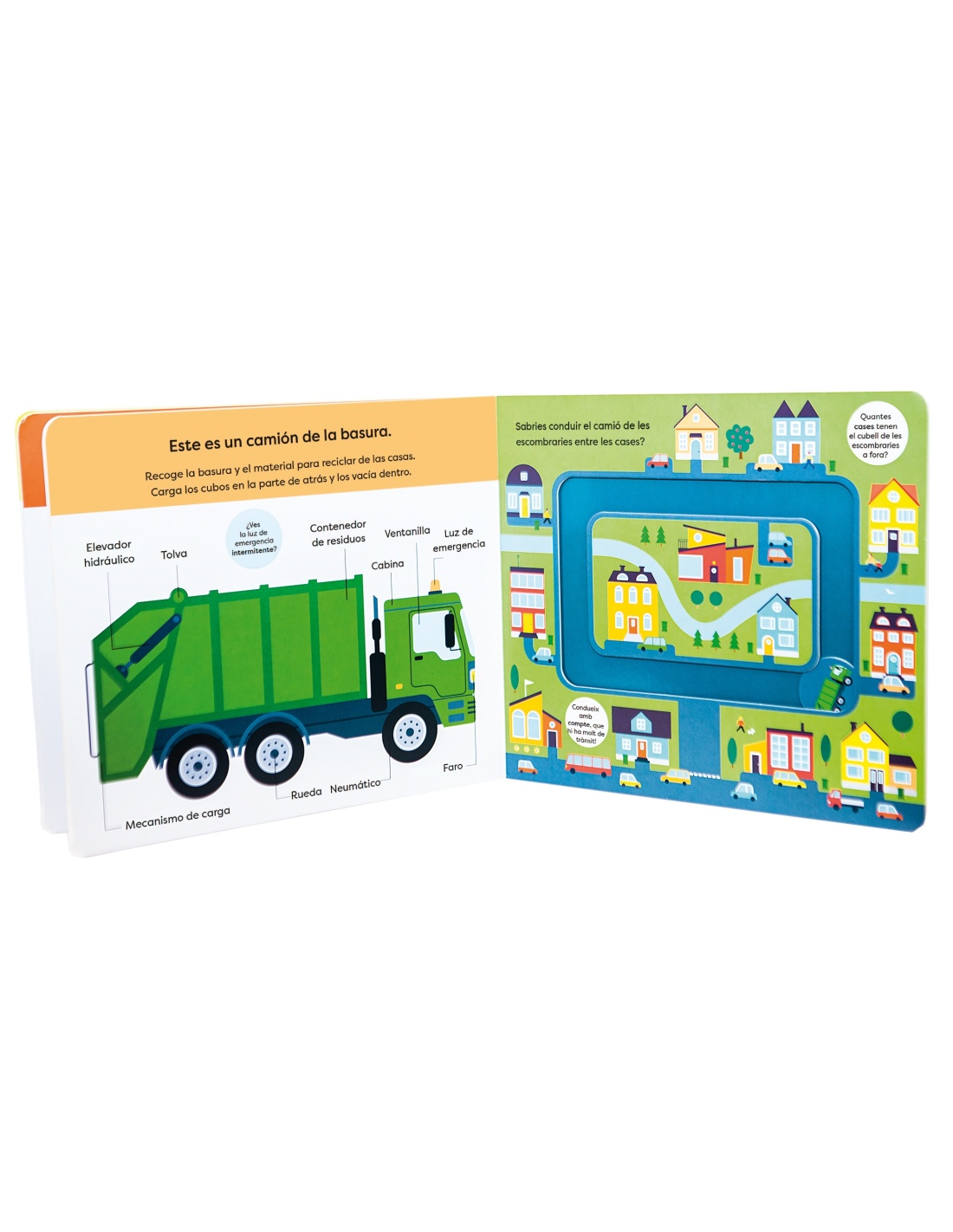 Un libro todo cartón que nos presenta cinco vehículos pesados con el vocabulario de las distintas partes de dichos vehículos y un circuito en cada doble página para recorrer los diversos escenarios con una ficha de cartón. ¡El regalo perfecto para las niñas y los niños a los que les gusta conducir y para entusiastas de los vehículos pesados!