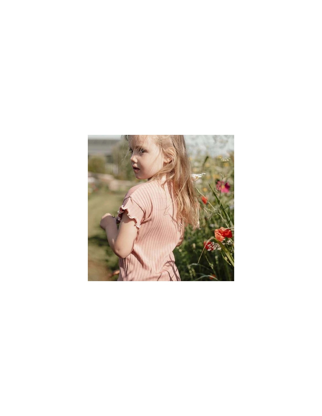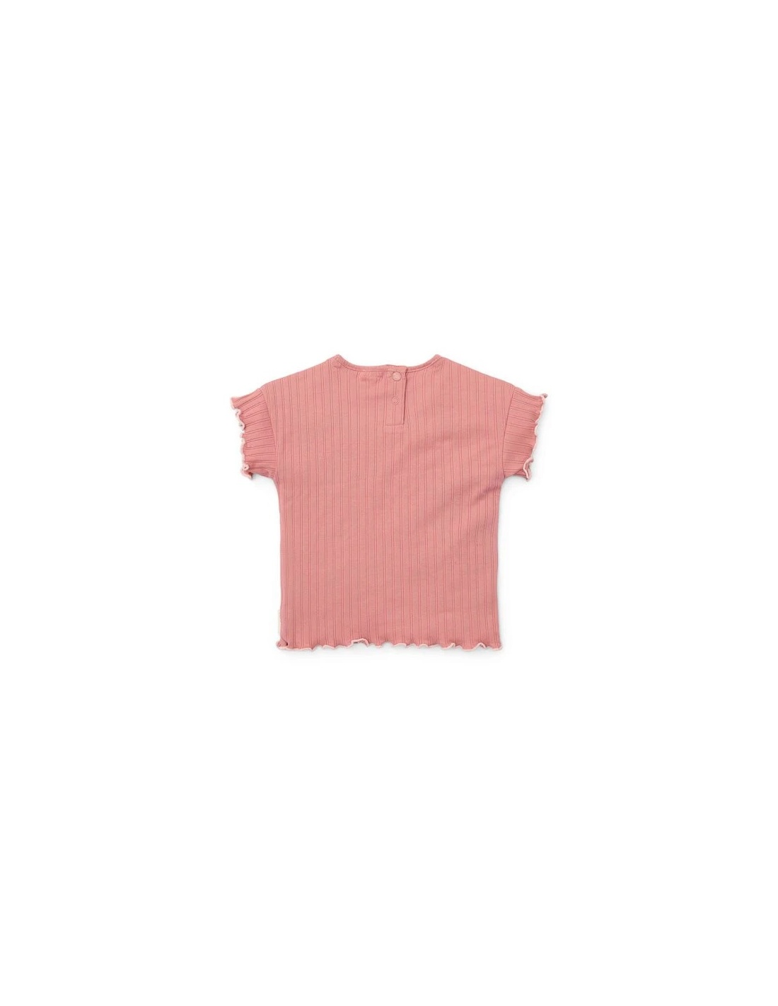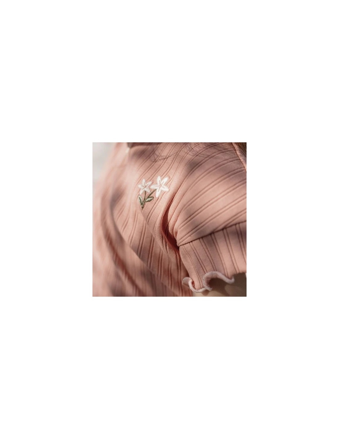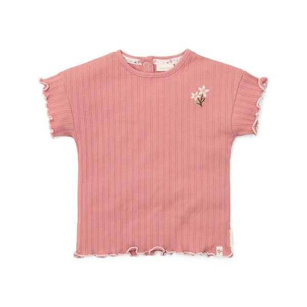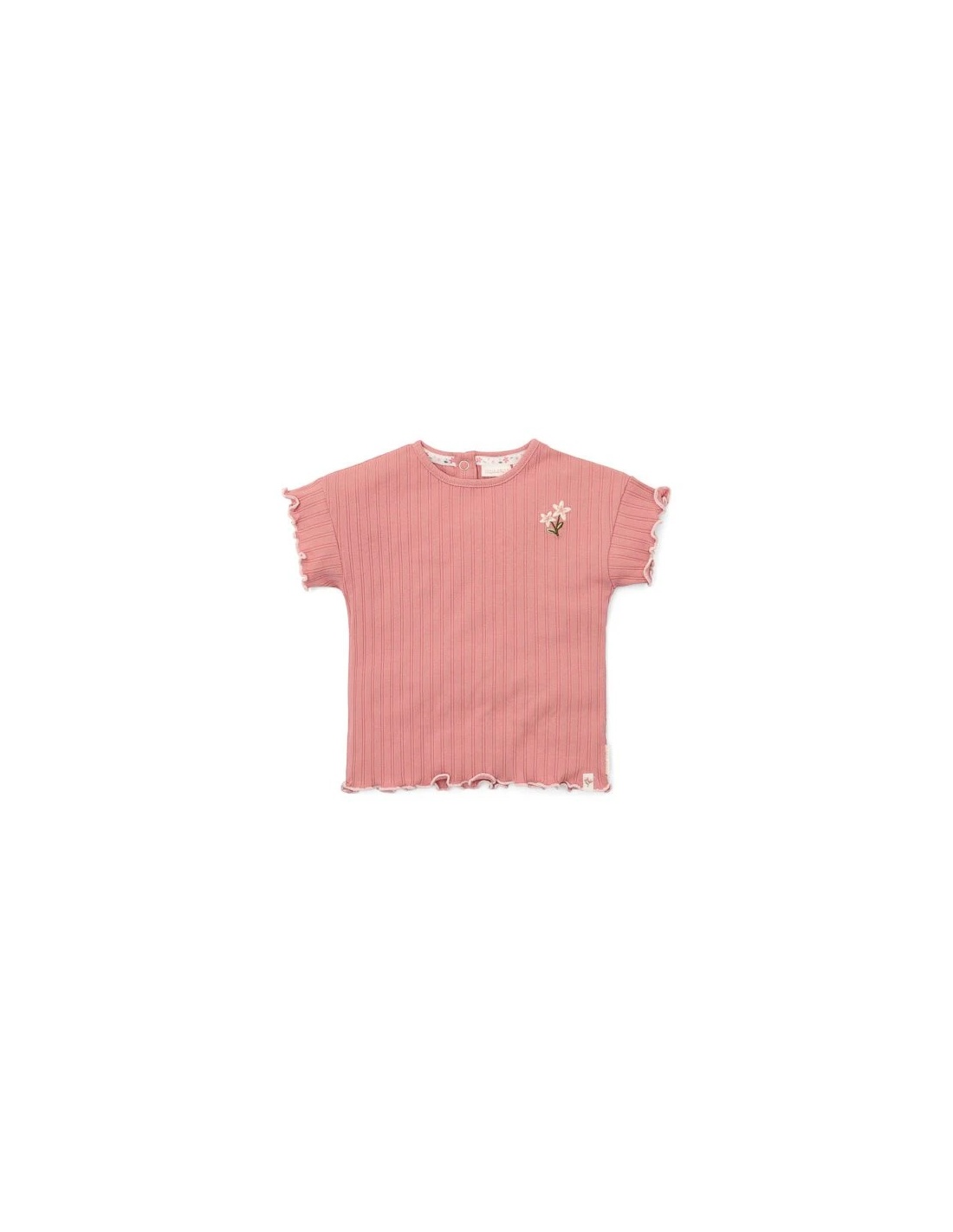 Camiseta con volantes en las mangas y en la costura de la parte inferior, de suave algodón orgánico con textura de canalé suave para un ajuste perfecto y un lindo cierre de botón en la parte trasera con dos pequeñas flores bordadas en el pecho representan las hermosas flores de un jardín exuberante.
