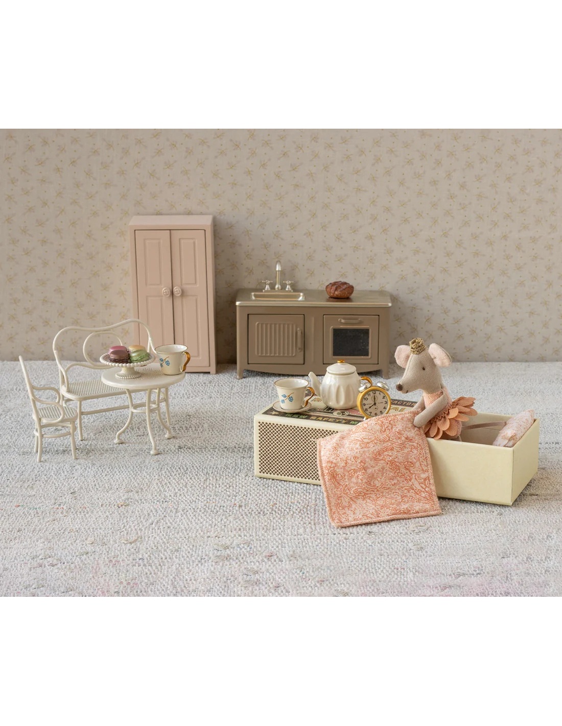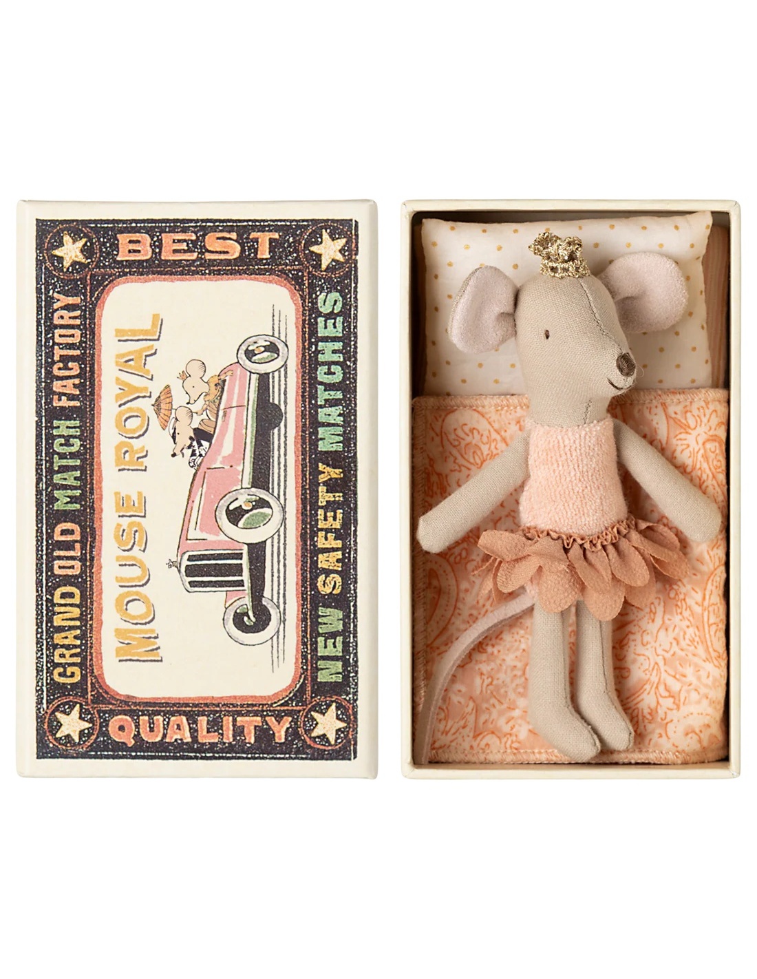 Un verdadero clásico de Maileg que roba corazones. Este adorable ratoncito está listo para vivir grandes aventuras durante el día y descansar cómodo por la noche en su cajita de fósforos. Su ropa y la suave ropa de cama tienen estampados únicos y colores encantadores que pueden variar, haciendo que cada pieza sea especial. Perfecto para estimular la imaginación y crear dulces momentos de juego.