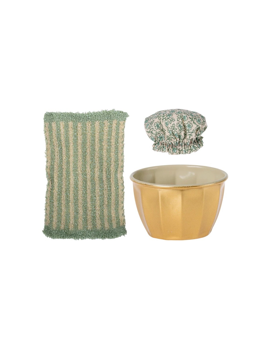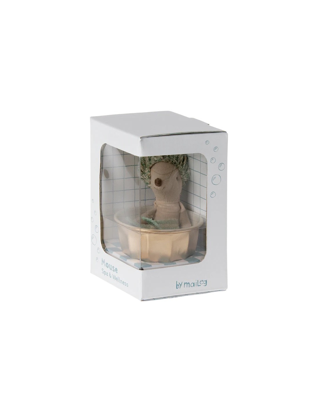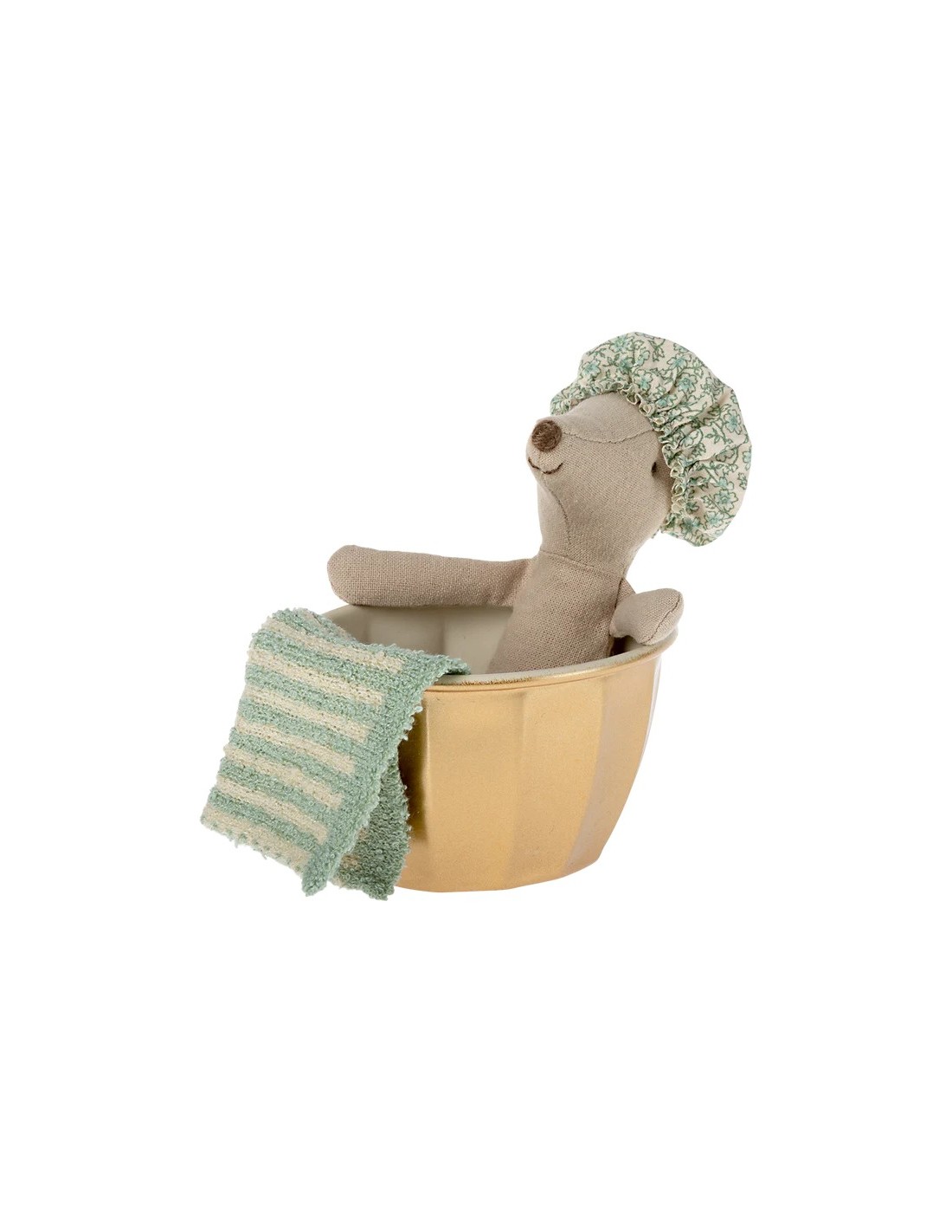 Esta ratona, la hermana mayor, adora los baños en bañera. Con una toalla y gorra de baño como accesorios, además de la bañera será ideal para las tardes de juego.