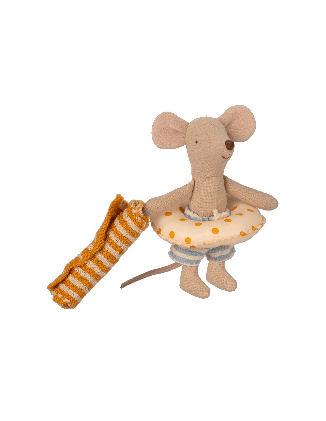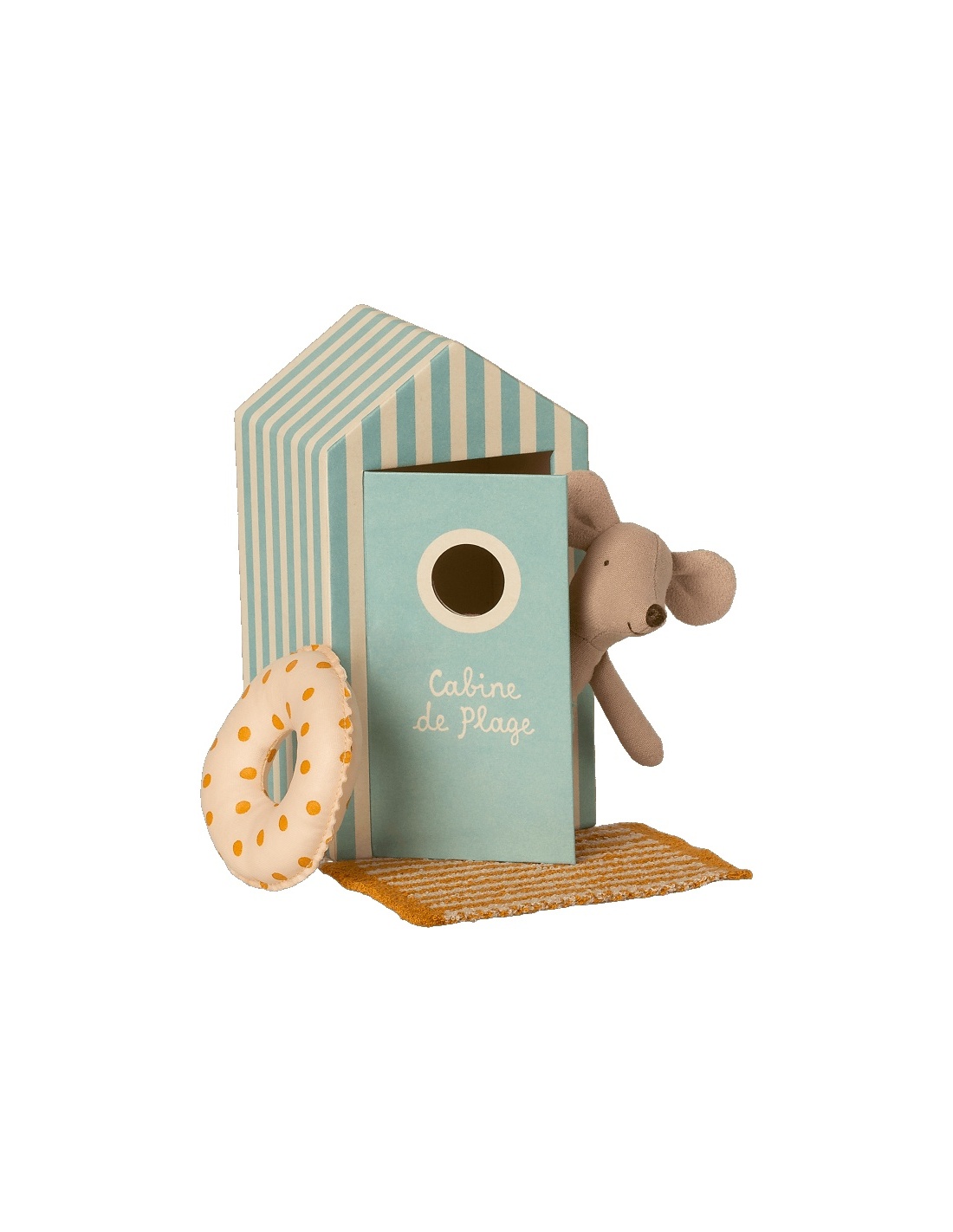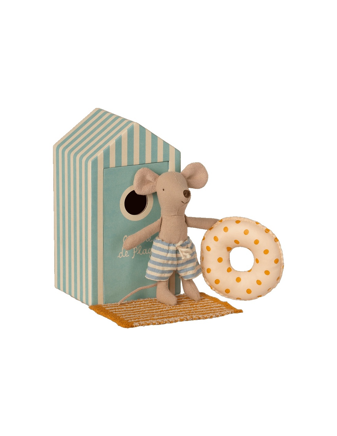¡Es tiempo de vacaciones! Este ratón está listo para disfrutar de un día en la playa, con todos los accesorios imprescindibles y una encantadora casa de playa a rayas. Siendo el miembro más pequeño de la familia, no podía faltar su flotador para mantenerlo seguro mientras se divierte.