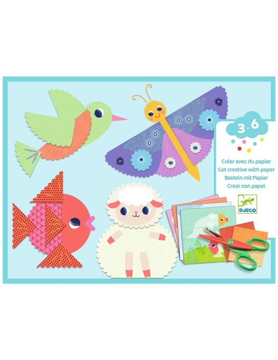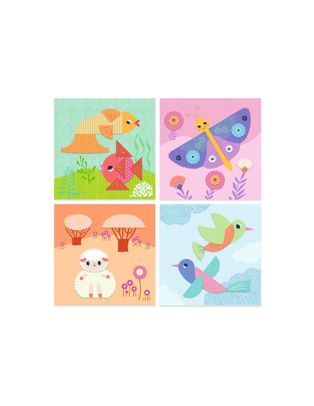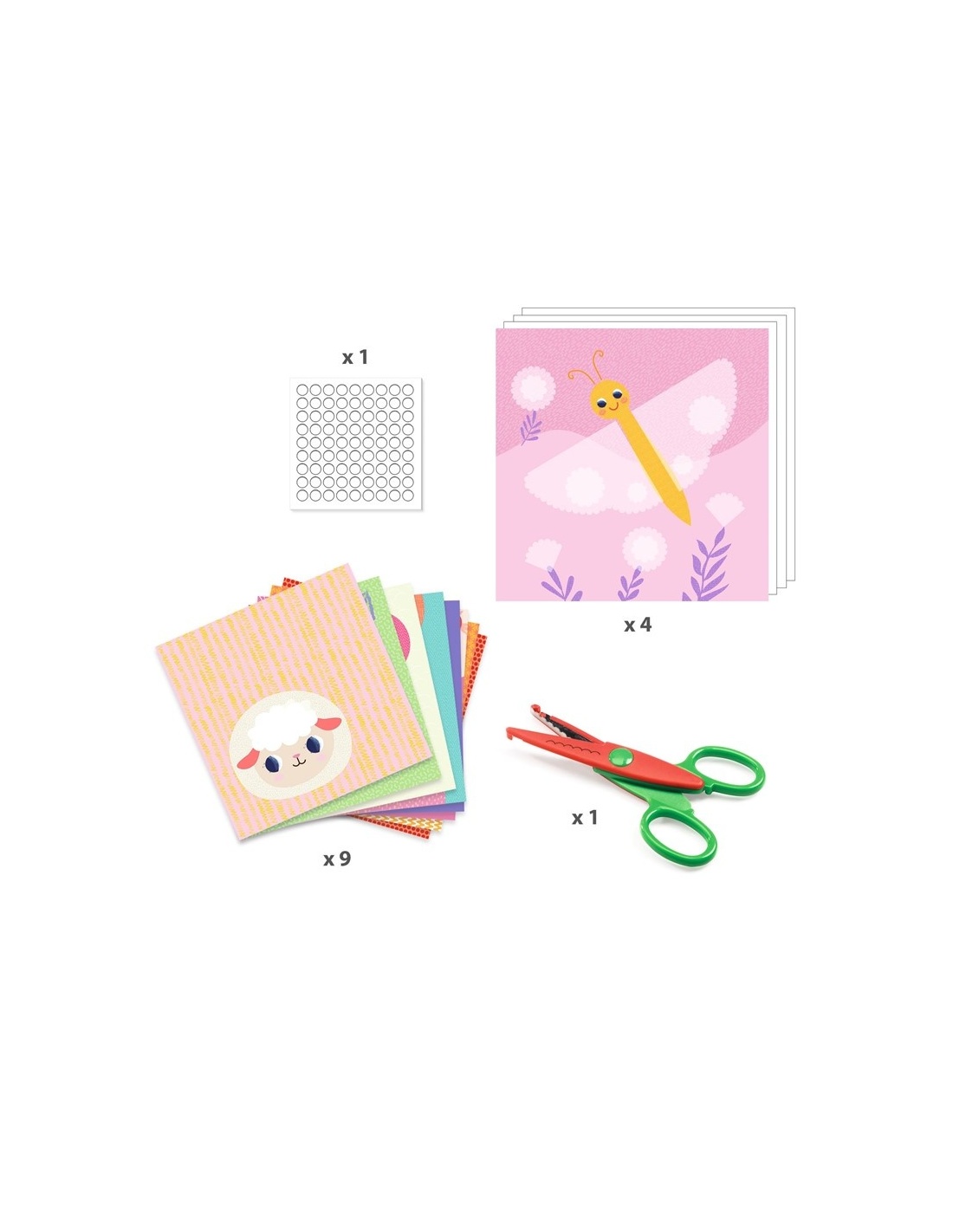 Contenido: 9 hojas ilustradas para recortar, 4 tarjetas ilustradas para decorar, 1 par de tijeras dentadas, 1 lámina de pegatinas de doble cara y 1 cuadernillo de explicaciones paso a paso.