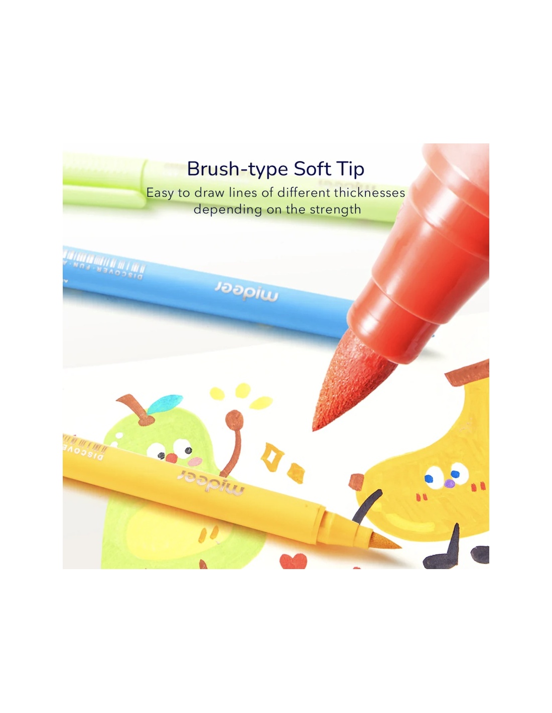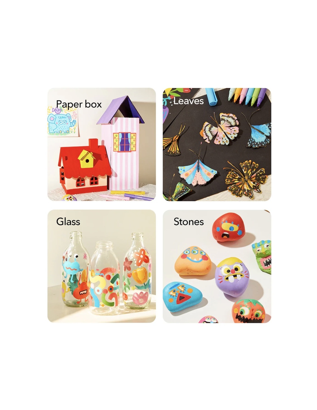 ¿Pintar con pinturas sin ensuciar como antes? ¡Es posible! Las puntas suaves de los rotuladores acrílicos, similares a pinceles, no solo son agradables al tacto, sino que también permiten a los niños explorar diversas técnicas de pintura. El rotulador imita la presión y la flexibilidad de un pincel, lo que permite trazos fáciles y precisos, desde líneas finas hasta rayas anchas. La amplia gama de colores permite crear obras extraordinarias, perfectas para decorar botellas de vidrio, por ejemplo. ¡Incluso puedes pintar el propio envase! Personalízalo como quieras, llévalo colgado al hombro con la correa y ¡a pintar! Se limpian fácilmente de diversas superficies con un paño húmedo.