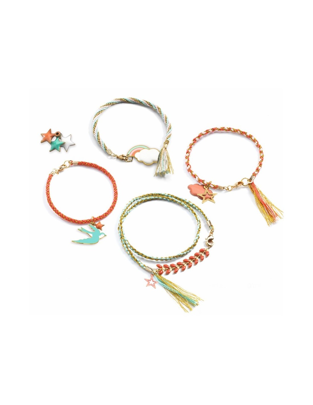 Incluye hilos de colores y un hilo dorado brillante. Con este kit se pueden hacer 4 pulseras.