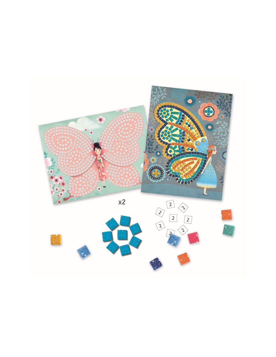 Una actividad de pegado para crear imágenes con mosaicos. Para que las alas de las hadas mariposa resplandezcan, el niño completa los cuadros con los cuadraditos de espuma adhesiva con purpurina siguiendo paso a paso las instrucciones del cuadernillo.