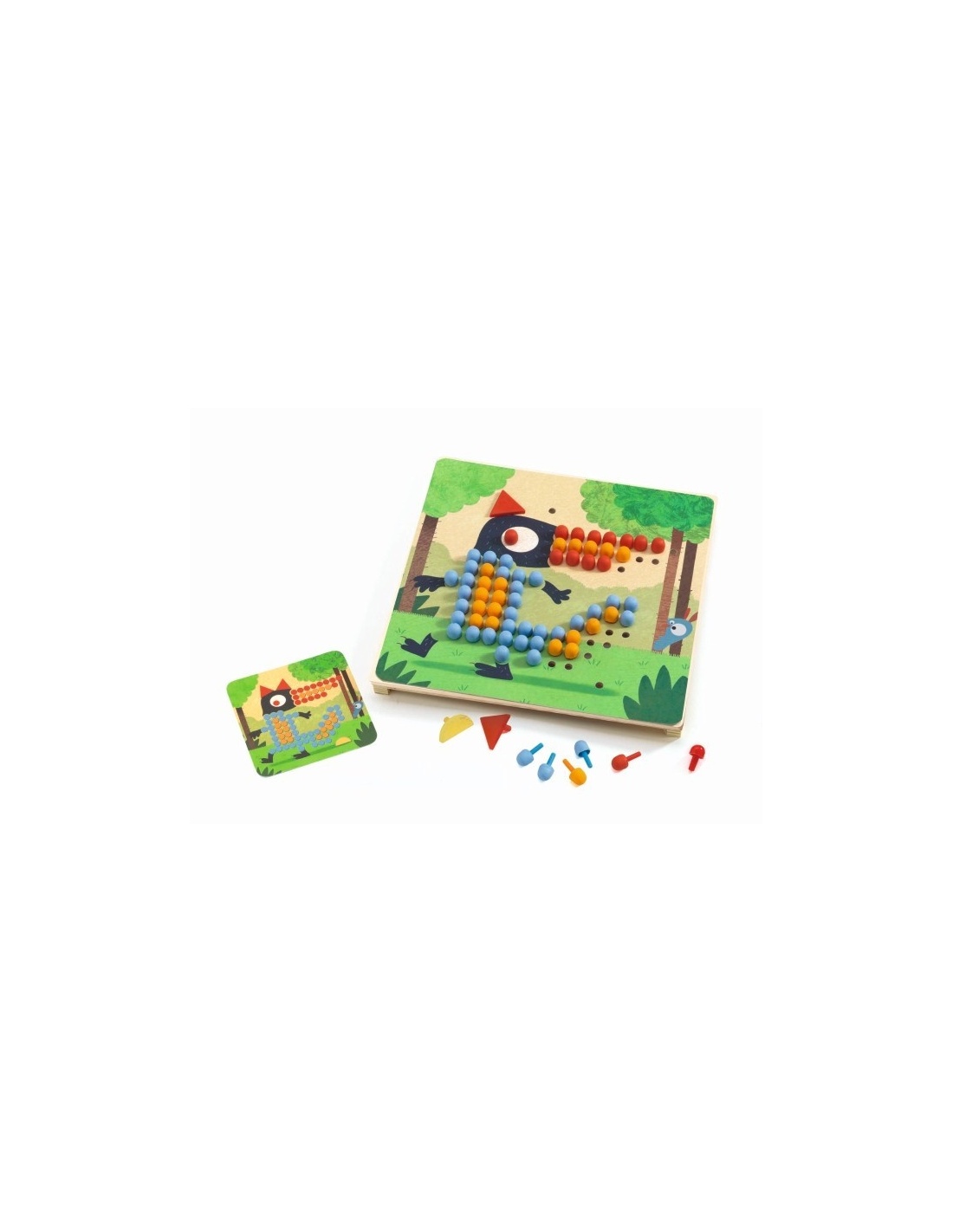 Contenido: 1 tablero de madera, 8 tableros de animales, 8 modelos (4 tarjetas de doble cara), 230 chinchetas de colores.