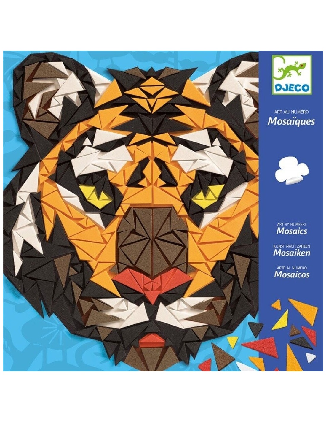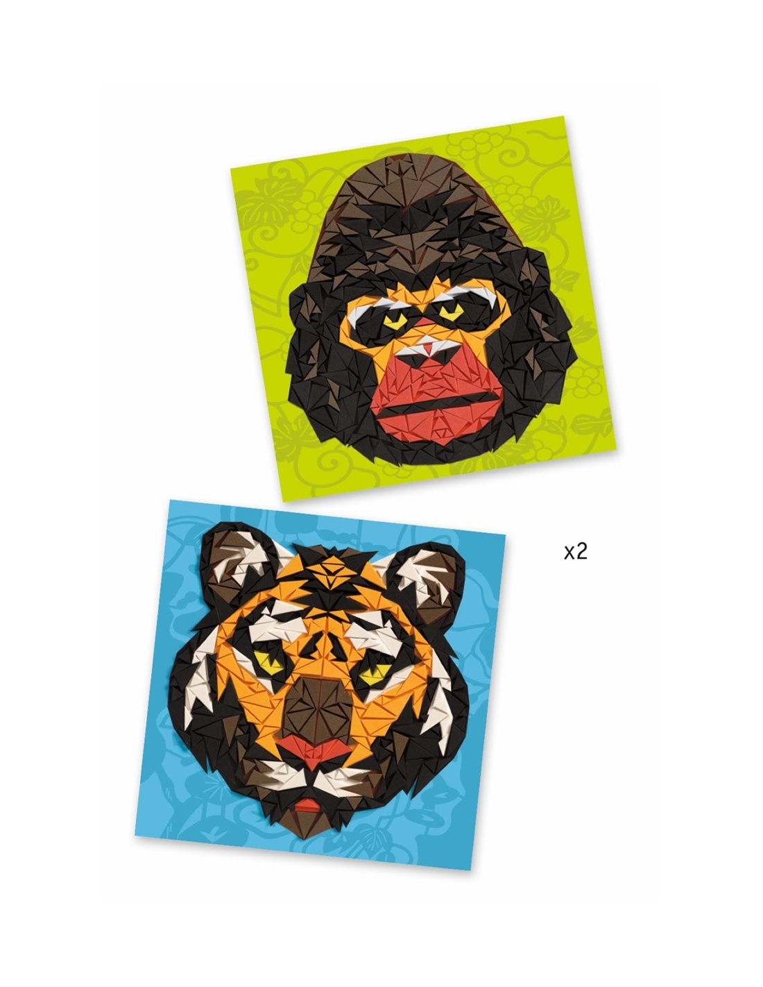 Una original actividad de pegado de mosaicos que invita al niño a trabajar con piezas triangulares. Siguiendo paso a paso las instrucciones del cuadernillo, el objetivo es pegar minuciosamente los triángulos de espuma adhesiva en las láminas para componer las cabezas del tigre y del gorila.