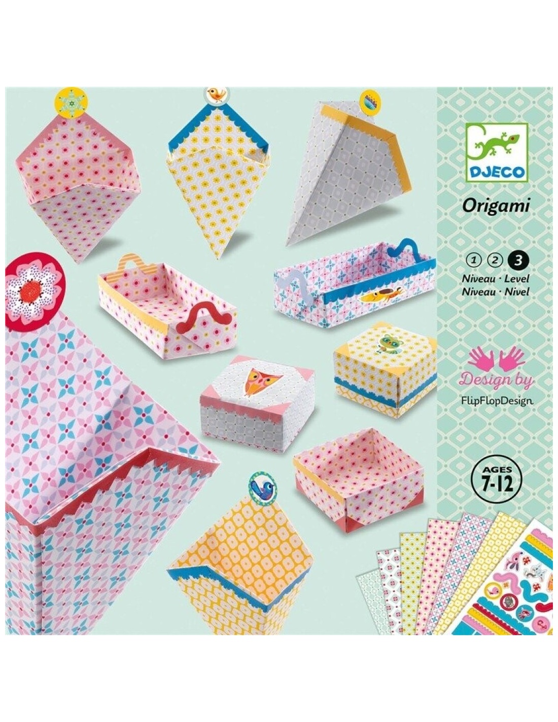 Un estuche de origami con papeles de refinados estampados de moda para crear 24 cajitas y decorarlas. Siguiendo las explicaciones del cuadernillo, el niño pliega las hojas hasta realizar 3 modelos de cajas distintos. Luego los puede personalizar con las pegatinas.