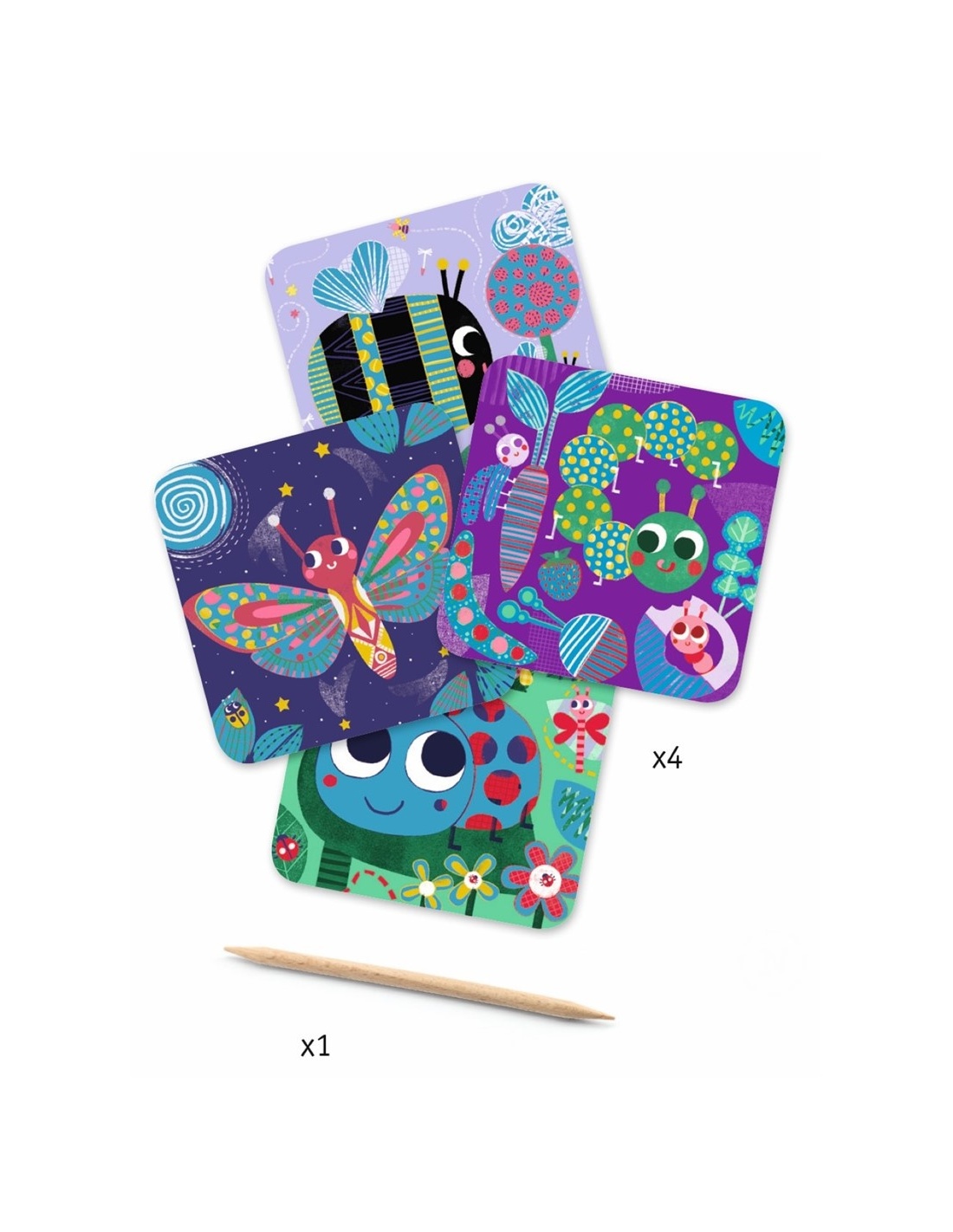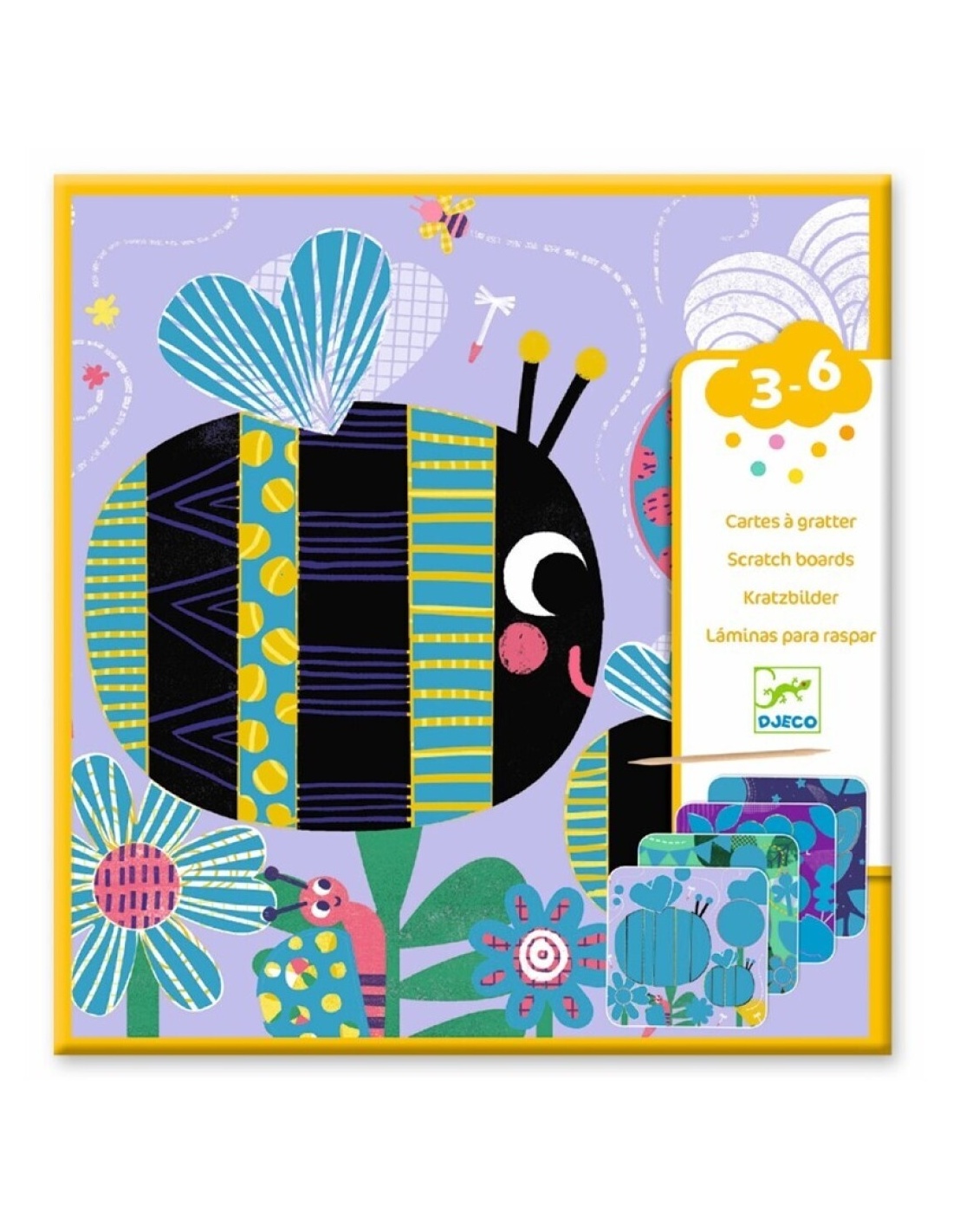 4 tableros para rascar con un palo de punta redondeada, adecuados para los niños pequeños. Con el palo de madera y el folleto explicativo, el peque rasca la superficie de la tarjeta para hacer dibujos o descubrir sorpresas. Y aunque, llevado por su impulso, quiera rayarlo todo, el resultado también será bonito.