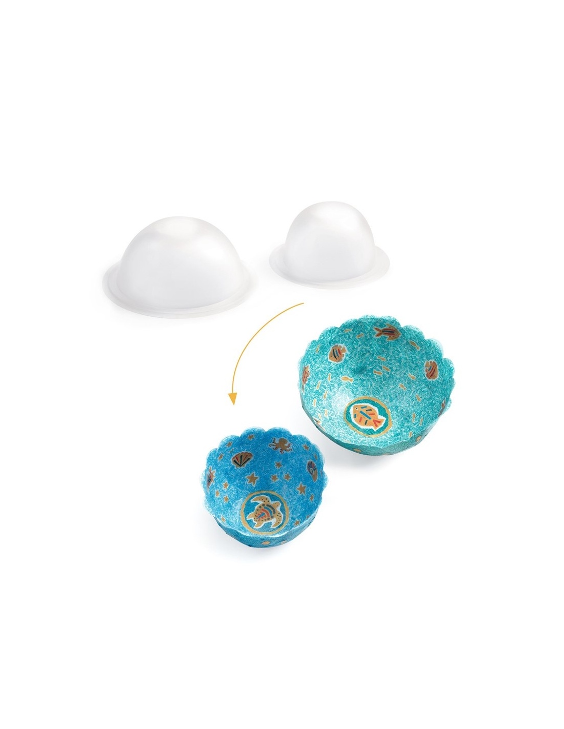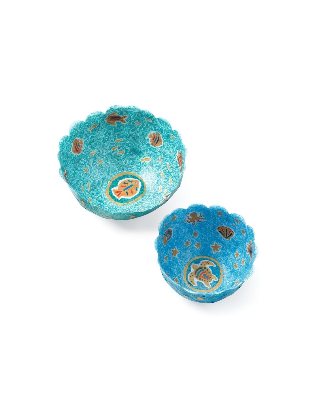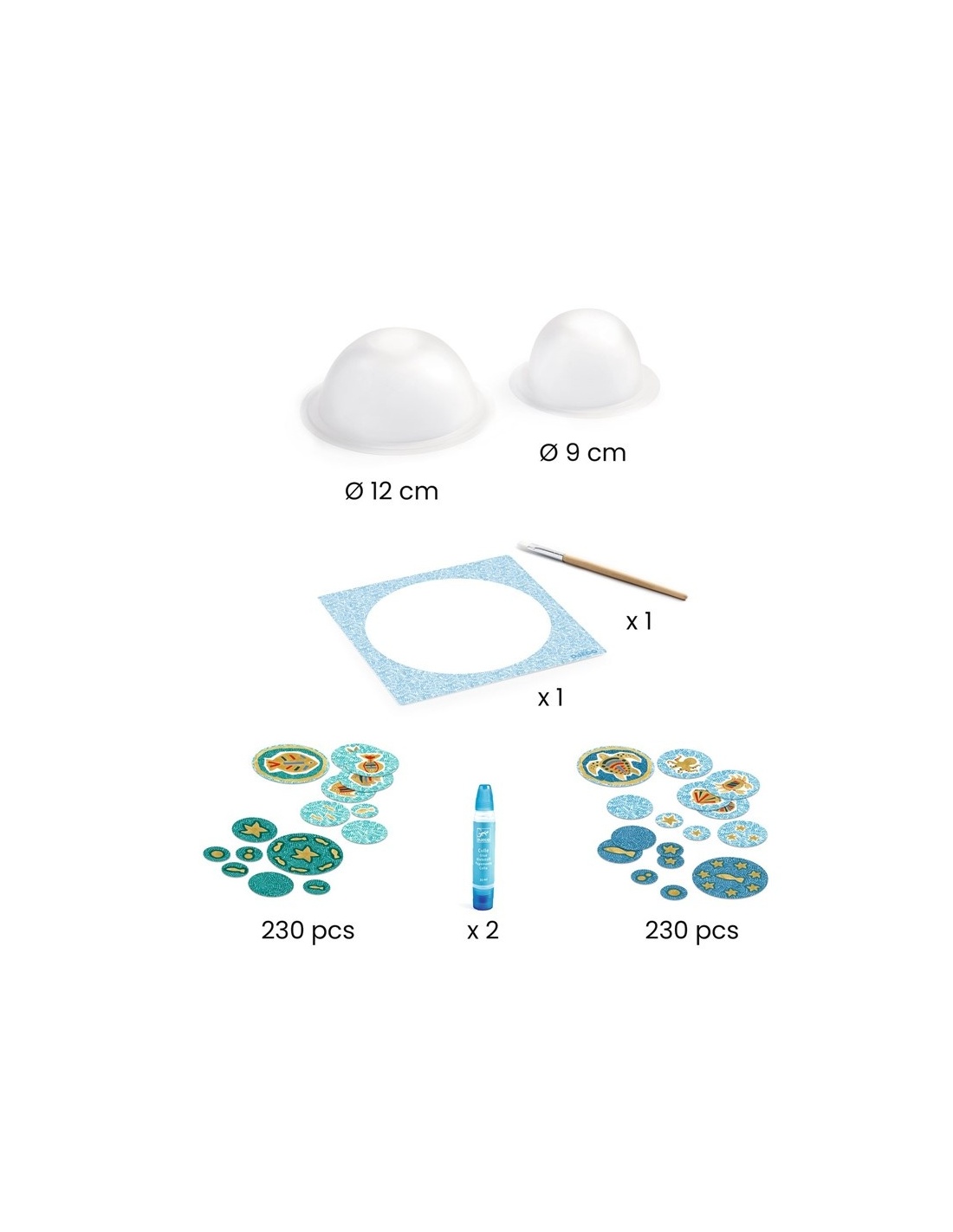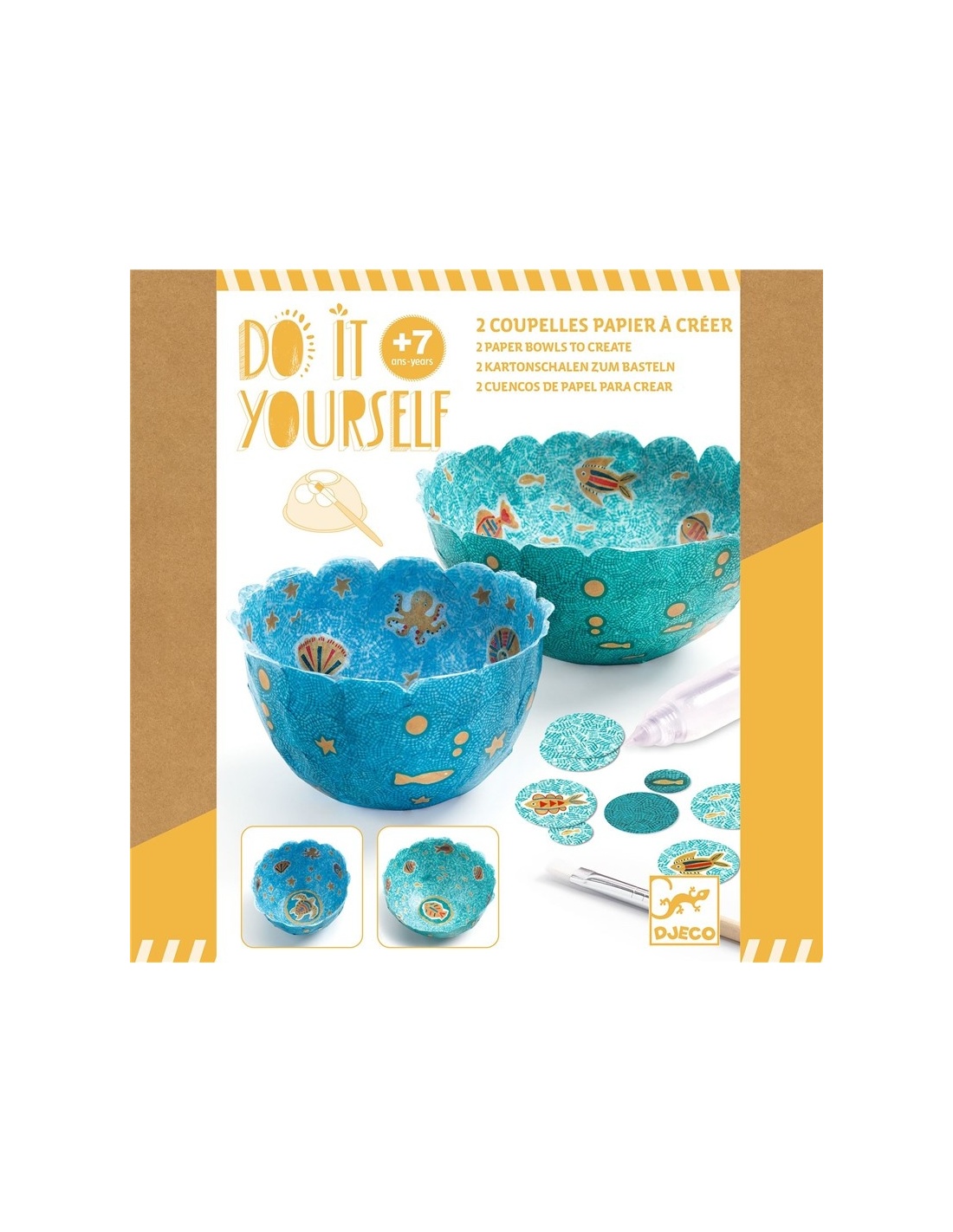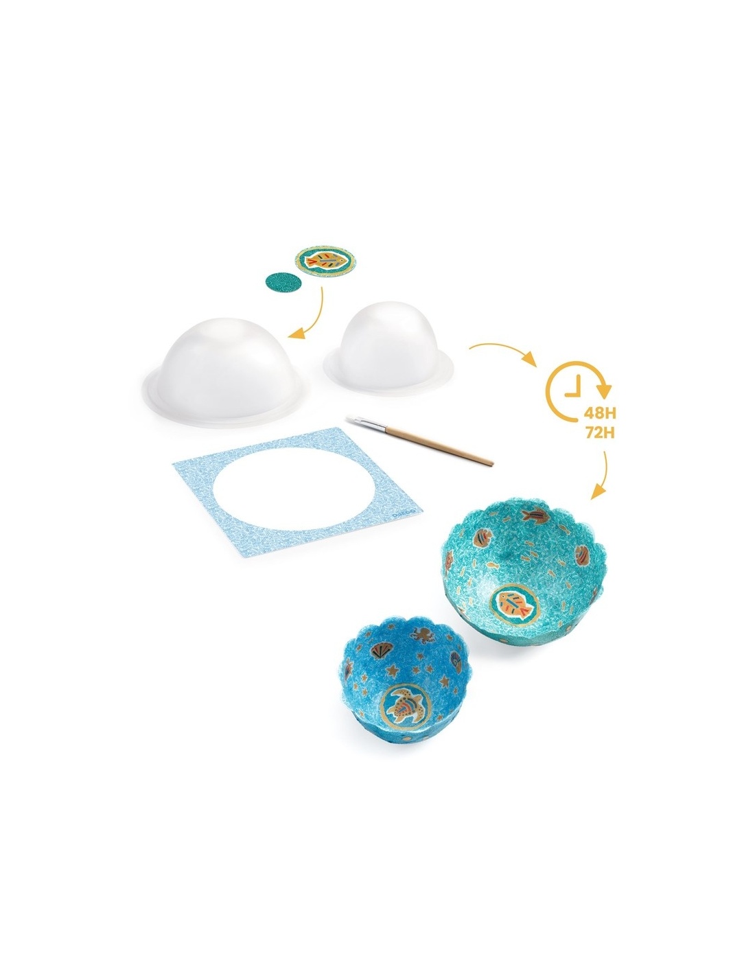Contenido: dos cuencos (dos tamaños: Ø 9 x 5,5 cm / Ø 12 x 6 cm), dos tubos de cola líquida, una paleta, una brocha, confeti de papel ilustrado grande, una hoja con las instrucciones paso a paso.