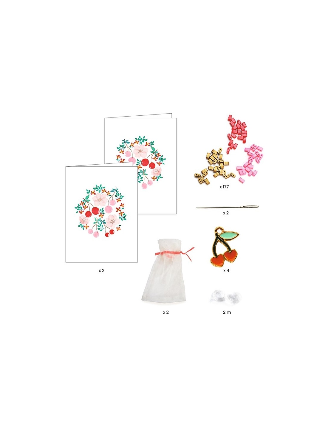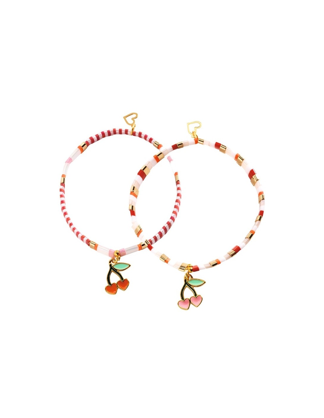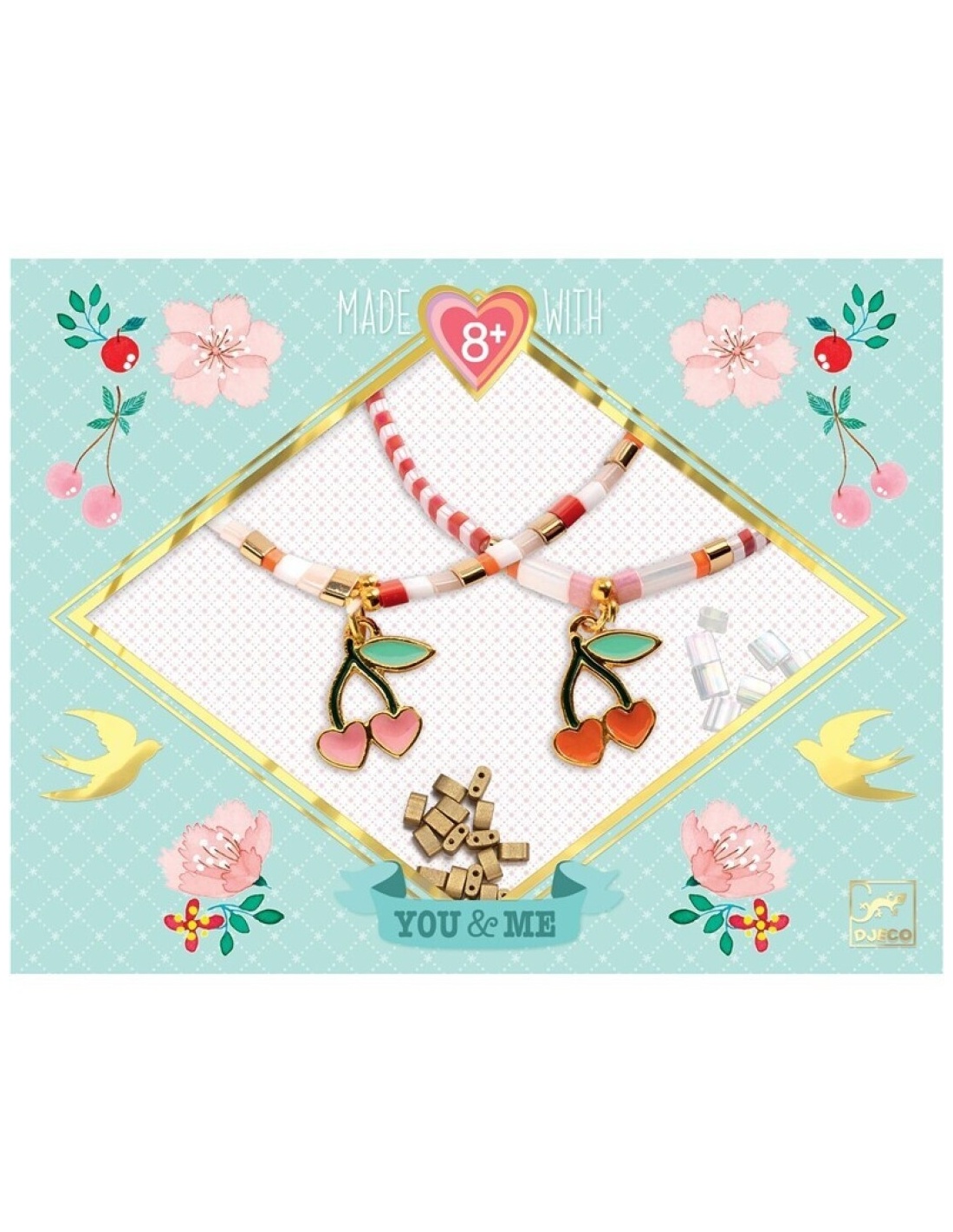 Dentro de una bonita caja brillante, encontrarás una variedad de cuentas y amuletos de cerezas perfectos para crear dos pulseras con los colores vibrantes del verano. Incluye dos joyas listas para guardar o regalar, acompañadas de una delicada bolsa de organza. Además, para hacer aún más especial el momento, se incluyen dos tarjetas con imágenes, ideales para escribir un mensaje personalizado y lleno de cariño. Una propuesta perfecta para compartir recuerdos únicos.