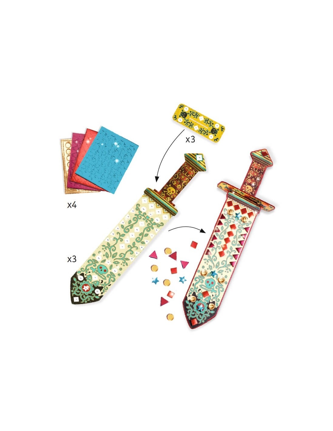 Contenido: 3 sables de cartón grueso, 4 hojas de pegatinas de espuma de mosaico metalizadas, 1 folleto explicativo.