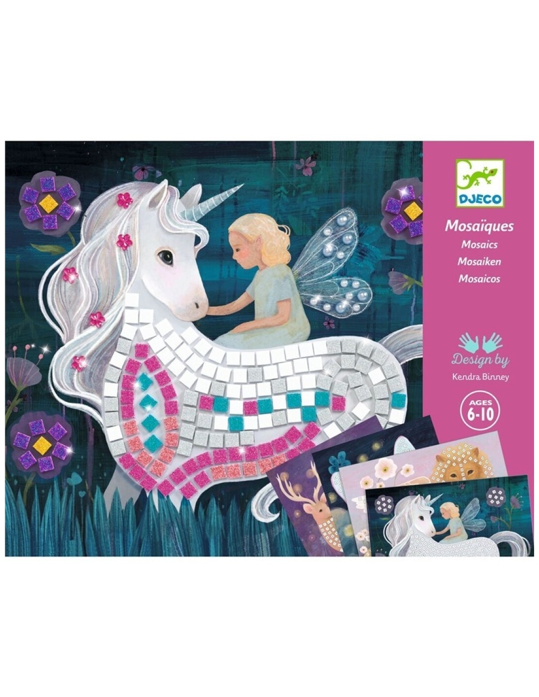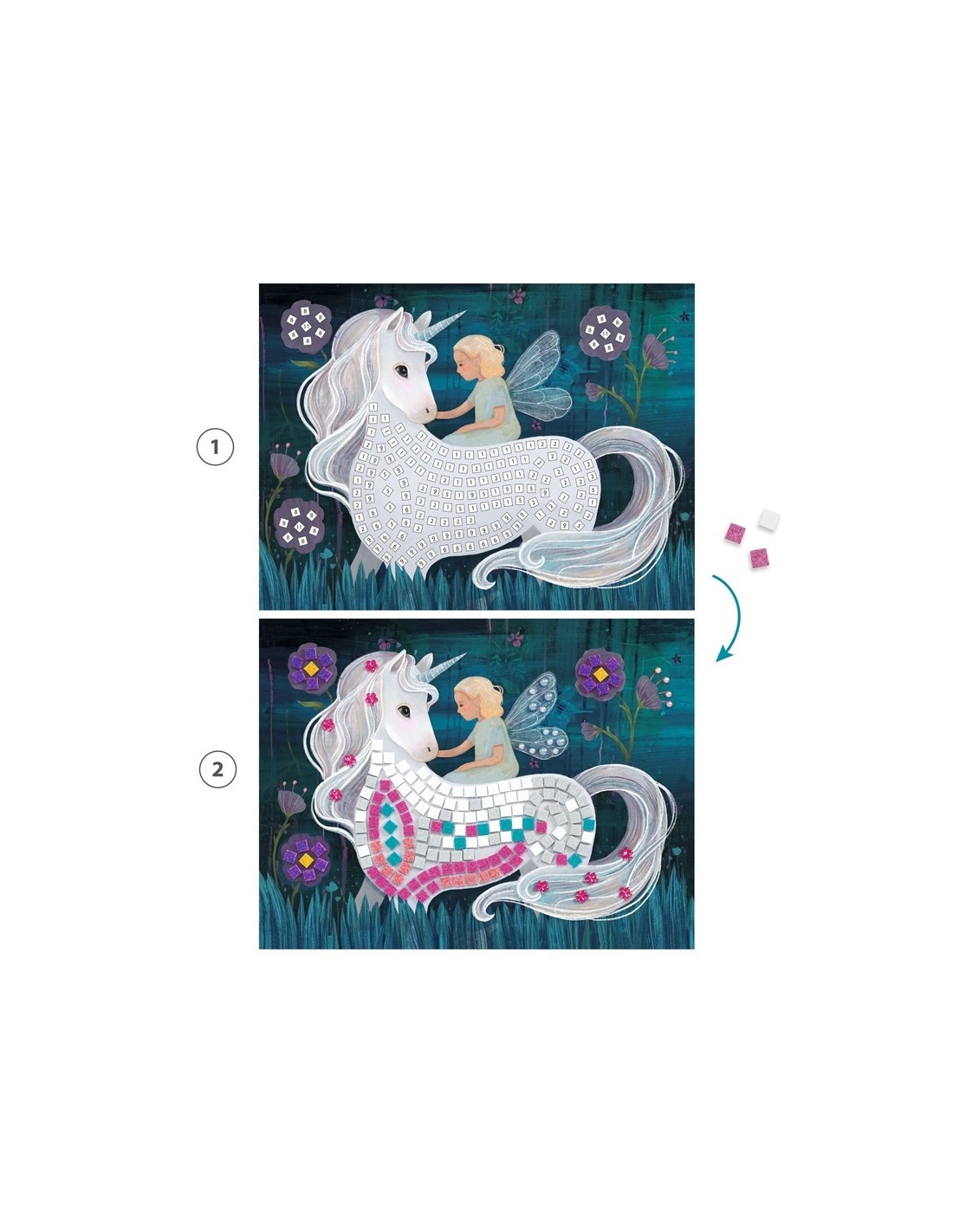 Un cofre para aprender el arte del mosaico. 4 cuadros para decorar pegando pequeños cuadrados de espuma con purpurina y strass. El peque localiza los números y luego pega las piezas correspondientes en el lugar designado. Los cuadros se completan y el mundo encantado se adorna con rayos brillantes.