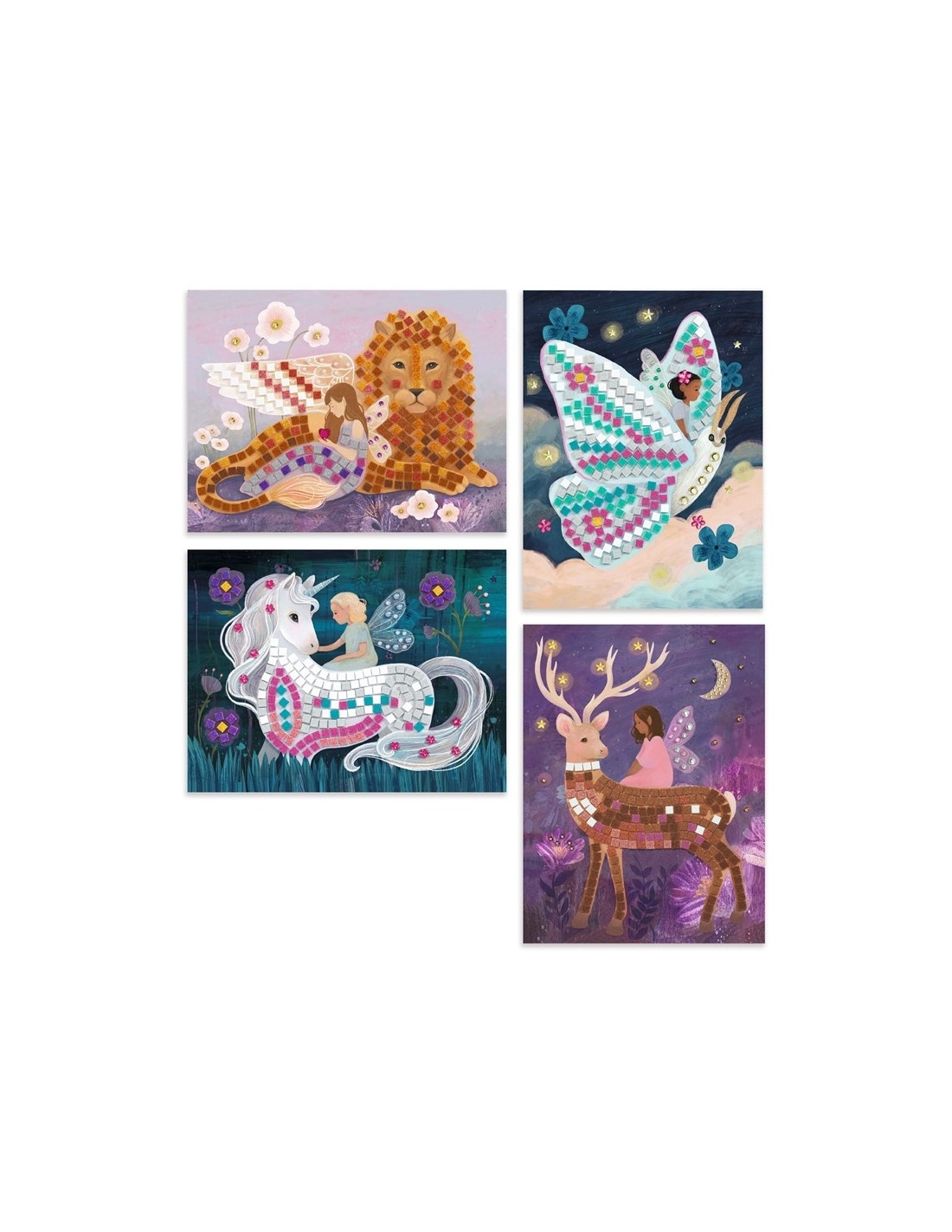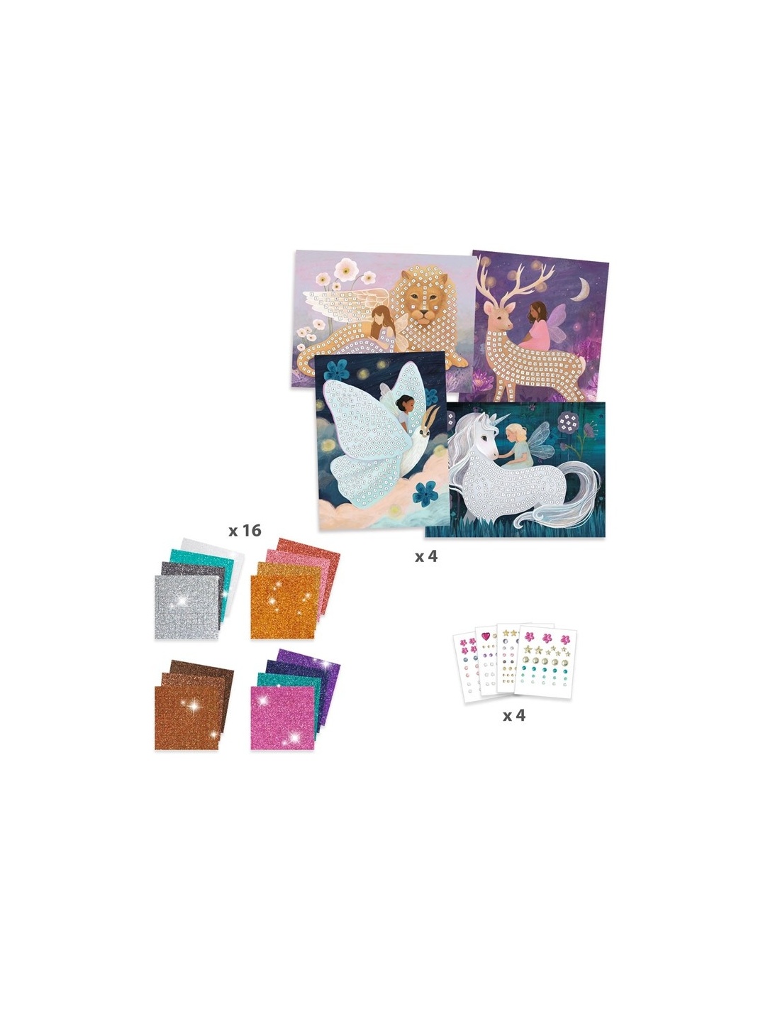 Contenido: 4 tarjetas ilustradas, 16 hojas de cuadrados de espuma autoadhesiva con purpurina, 4 hojas de strass autoadhesivas, 1 folleto explicativo paso a paso a color.