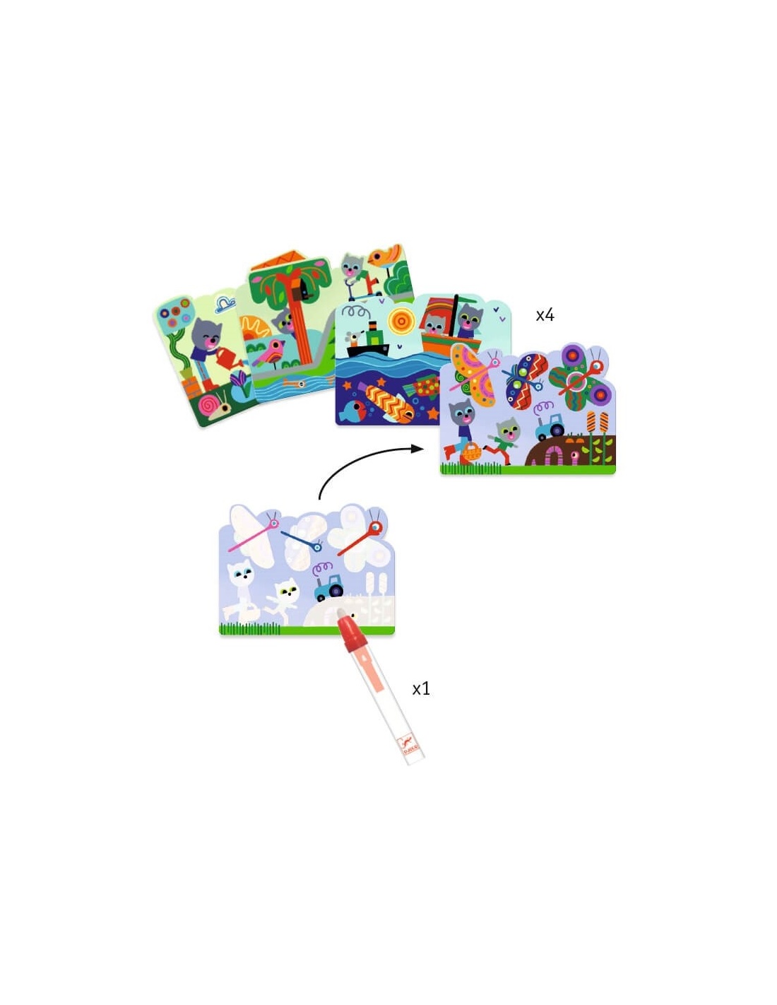 Un pack de coloreado al agua adecuado para niños a partir de 18 meses. El niño colorea las partes blancas con el lápiz de agua para descubrir lo que se esconde en el cielo. Es mágico: los dibujos aparecen y cambian de color. Las tablas se secan y el niño vuelve a empezar.