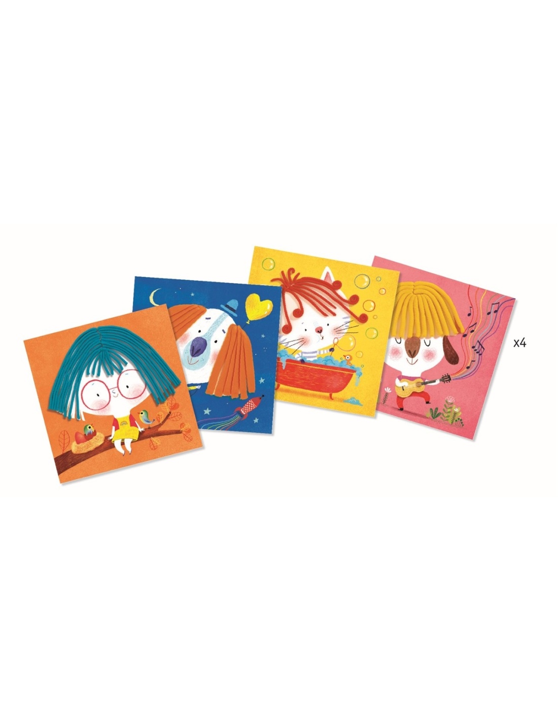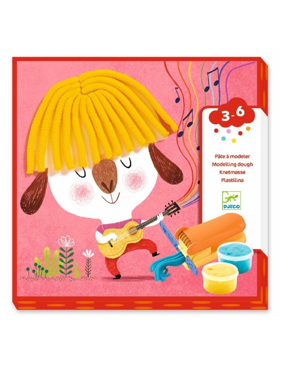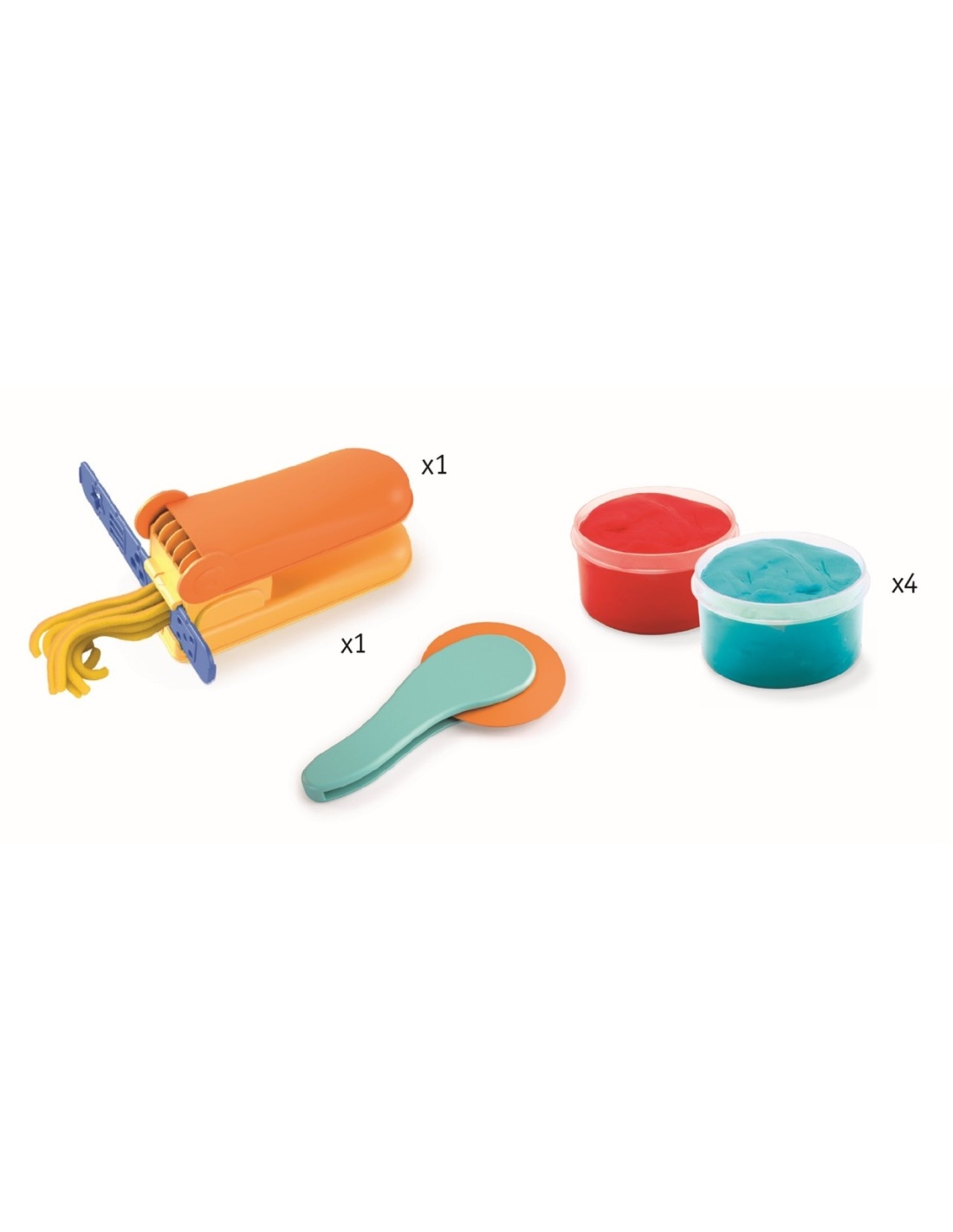 Contenido: 4 botes de 80gr de arcilla - 4 tablas de plástico ilustradas (20x20 cm) para decorar con la arcilla - 1 prensa, y 2 pinzas para el pelo - 1 rueda para cortar el pelo.