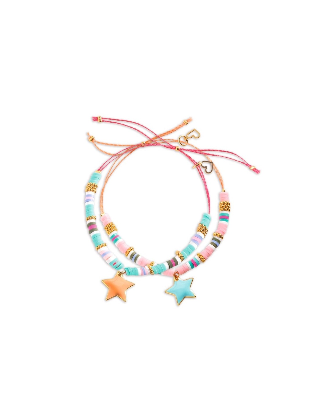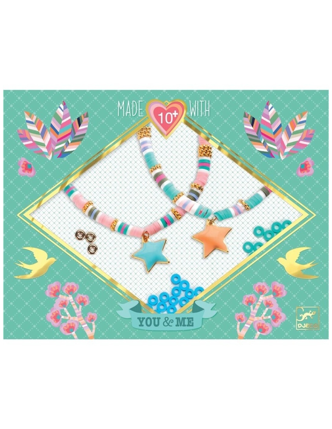En una encantadora caja brillante, encontrarás una variedad de cuentas y amuletos exclusivos para diseñar dos pulseras inspiradas en las estrellas. Vienen acompañadas de dos hermosas joyas que puedes guardar o regalar en una delicada bolsa de organza. Además, para hacer aún más especiales los recuerdos, se incluyen dos tarjetas con ilustraciones donde puedes escribir un mensaje bonito.