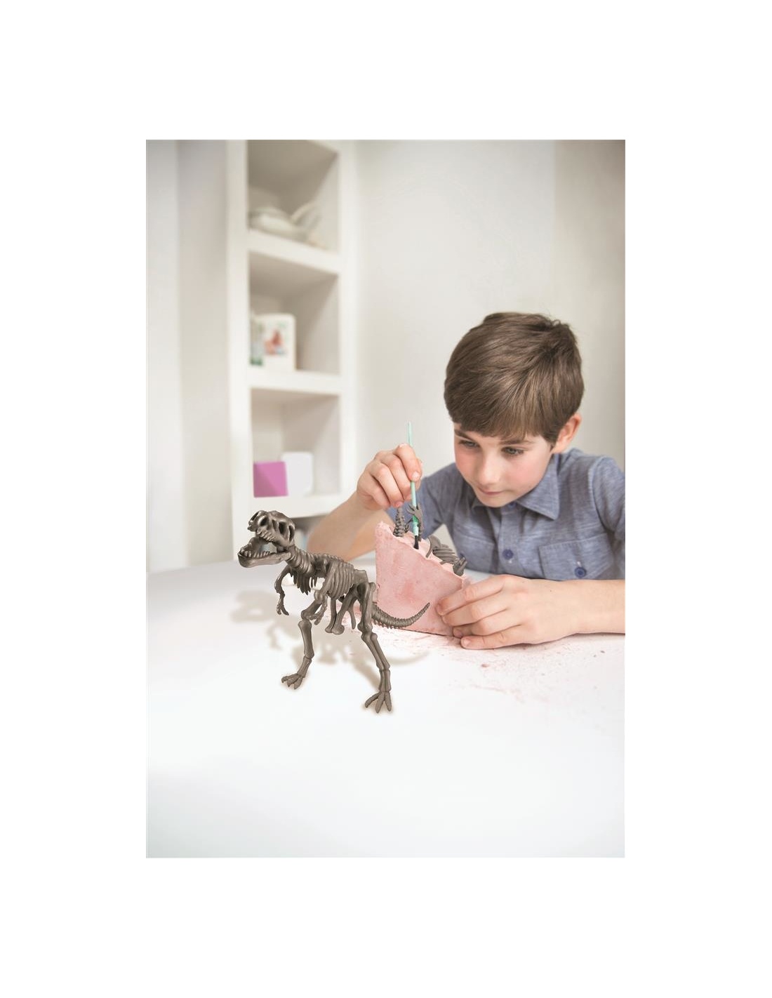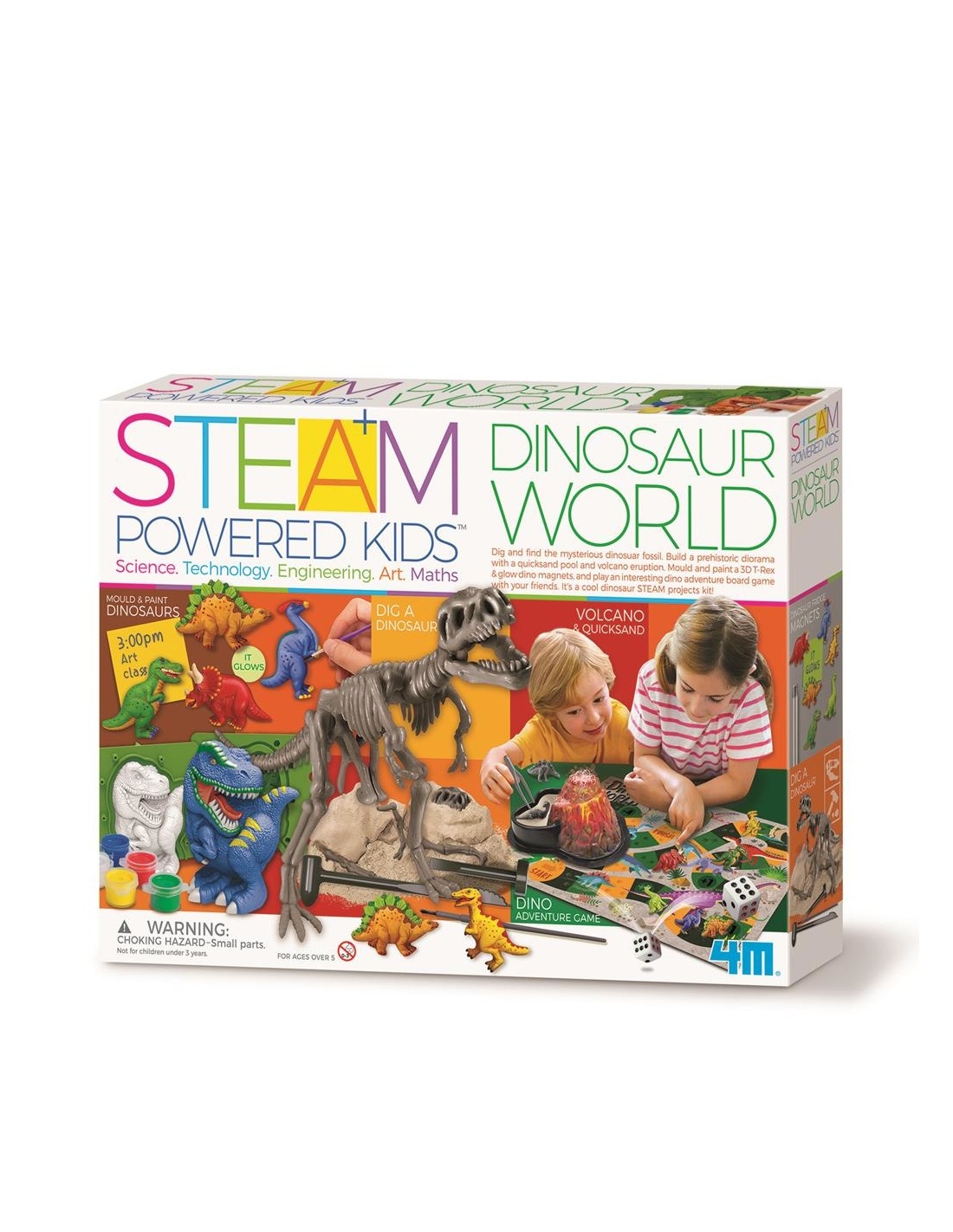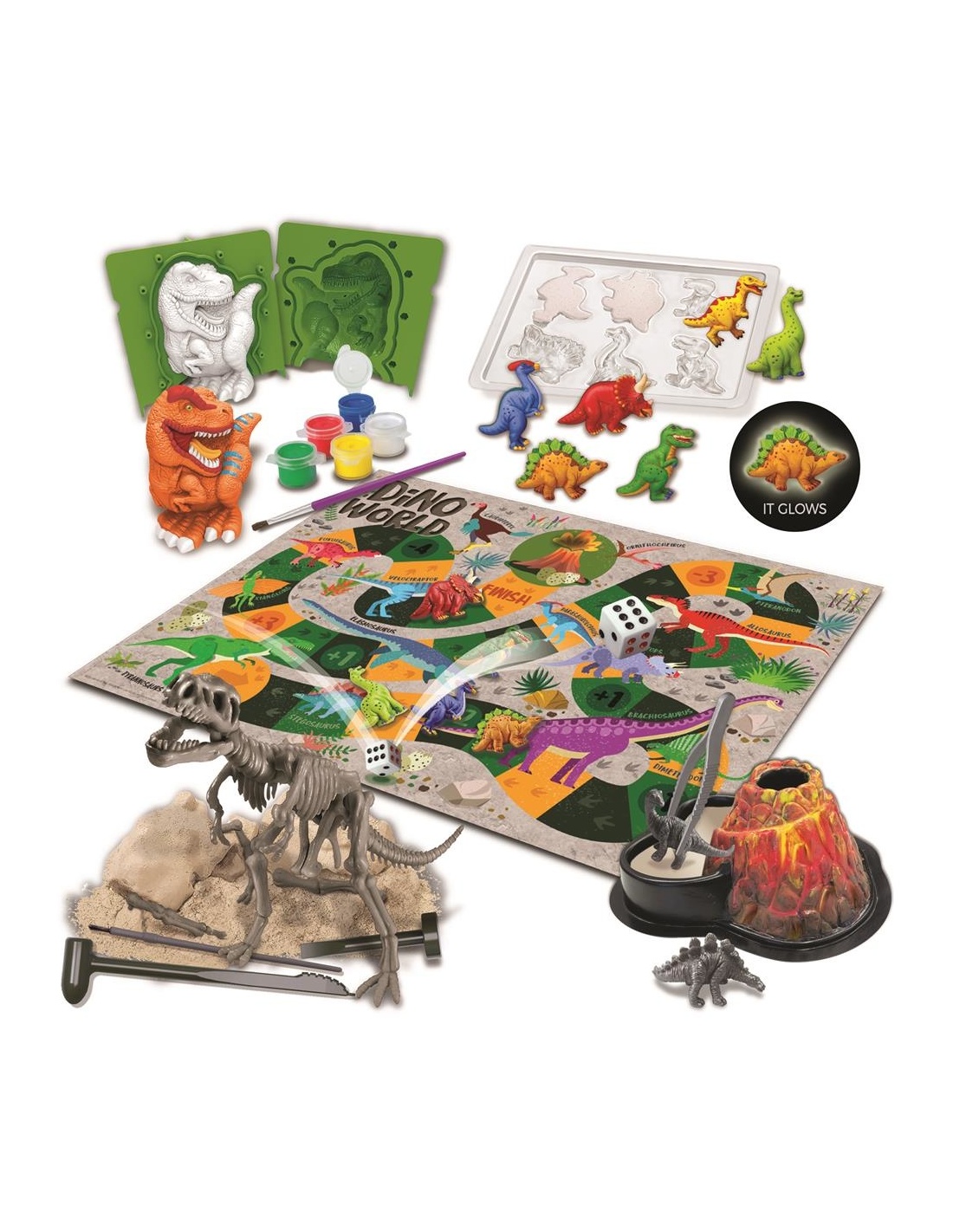 Excava y encuentra el misterioso fósil de dinosaurio. Construye un diorama prehistórico con una piscina de arenas movedizas y la erupción de un volcán. Moldea y pinta un T-Rex en 3D y los imanes de los dinosaurios brillantes, y juega con tus amigos a un interesante juego de mesa de aventuras con dinosaurios. ¡Es un kit genial de proyectos STEAM de dinosaurios!