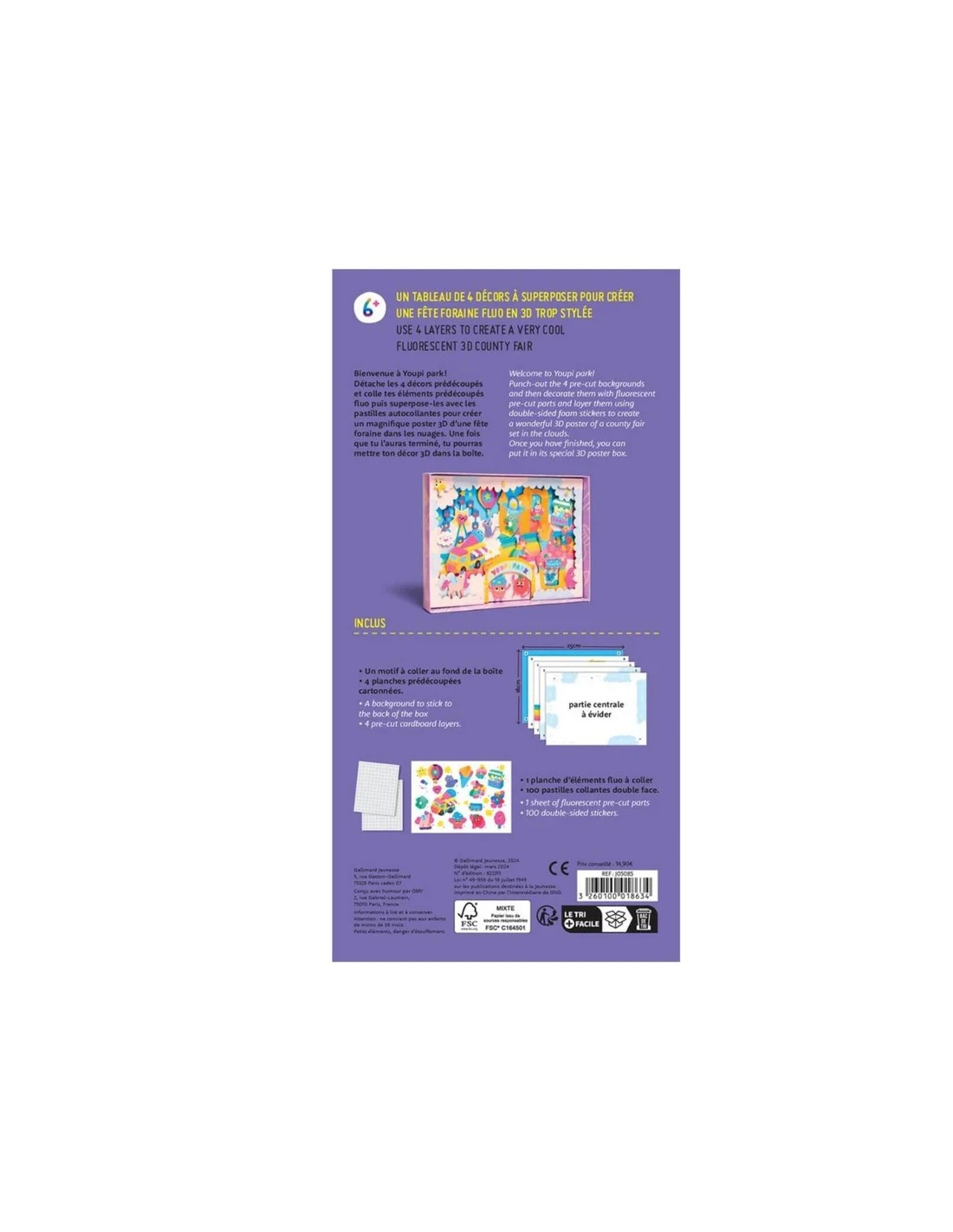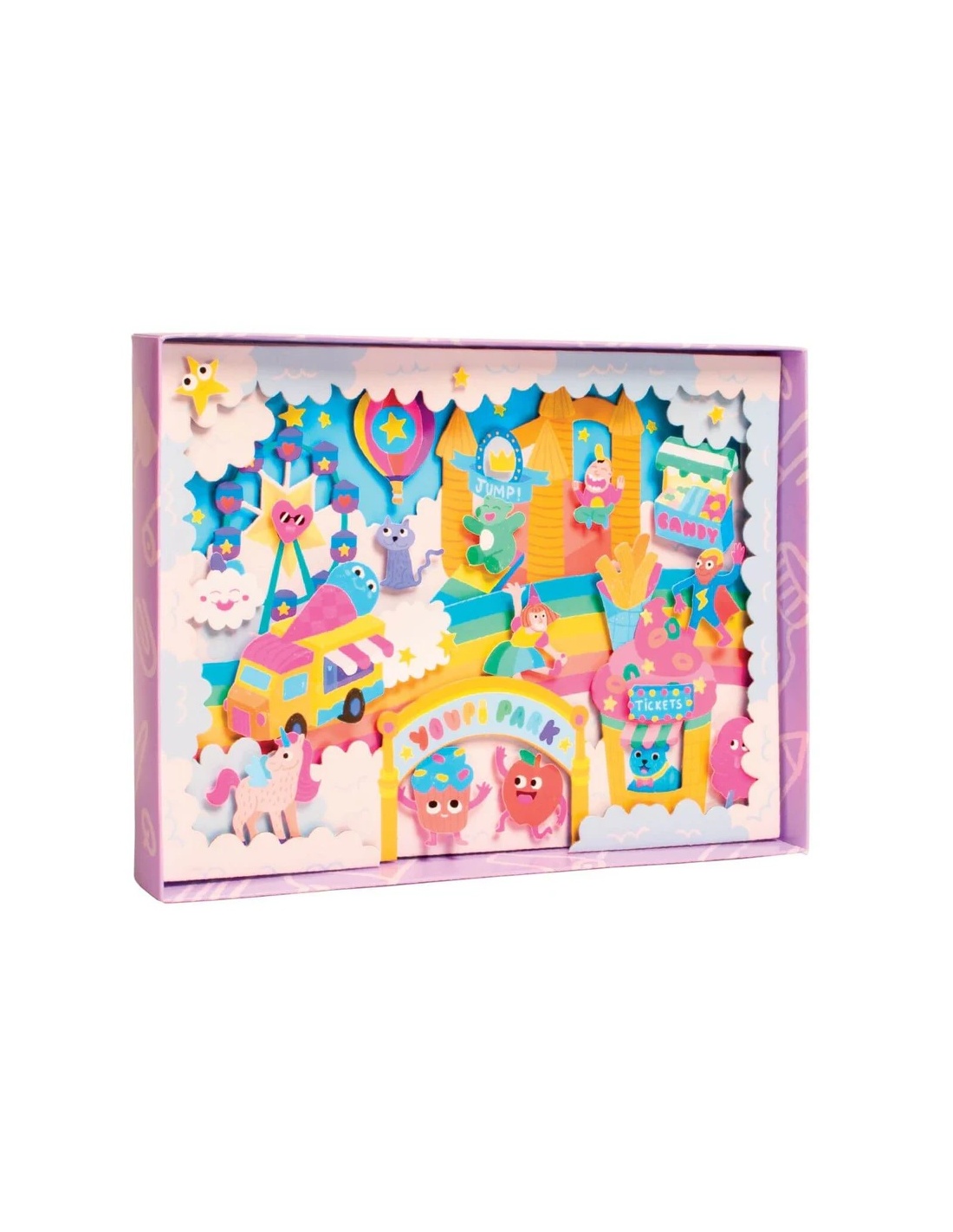 Con formas precortadas, pegatinas fluorescentes y autoadhesivos fáciles de aplicar, los niños y niñas de 3 a 10 años pueden construir su propio parque soñado con carruseles, montañas rusas flotantes, globos aerostáticos y nubes brillantes.