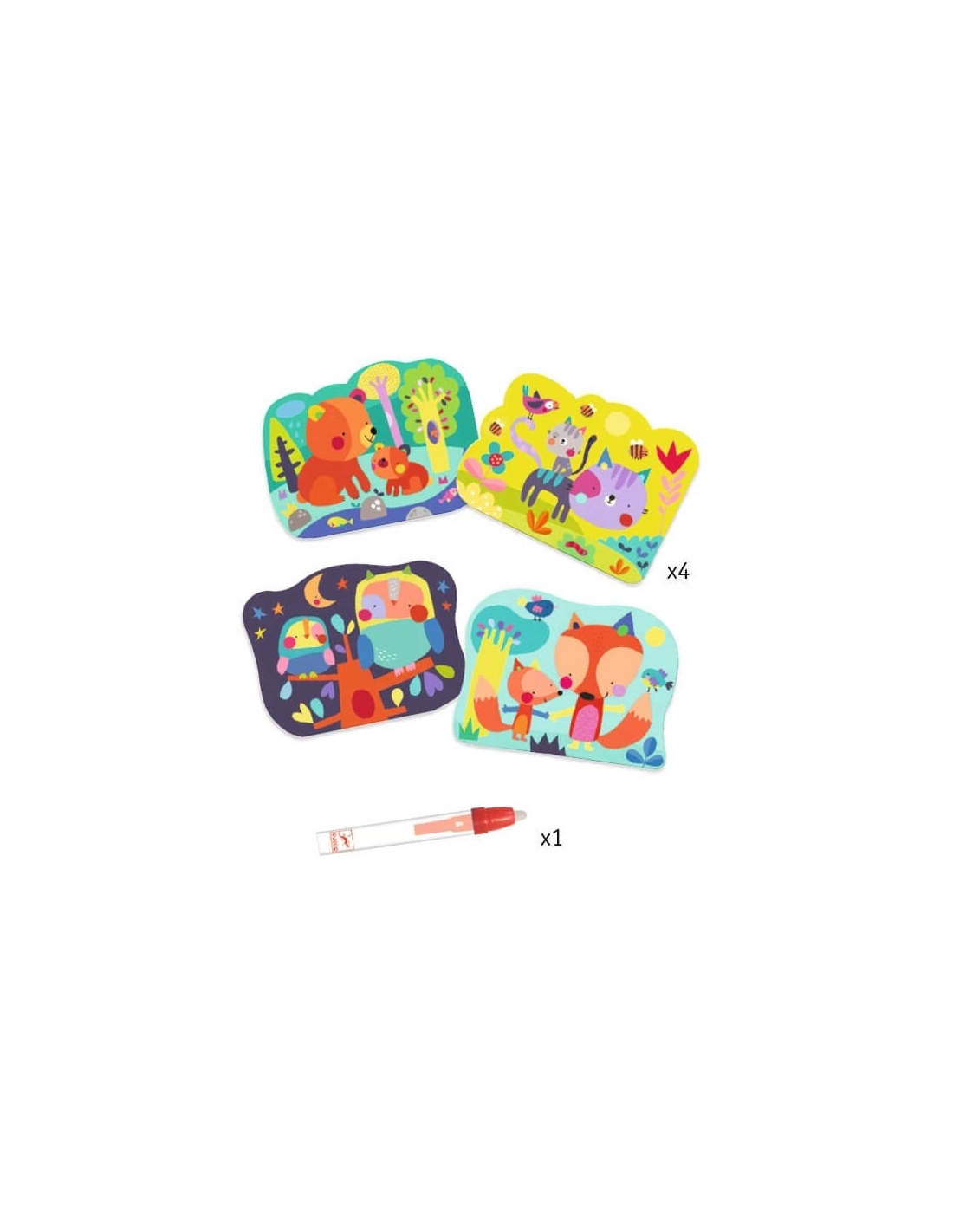 Descubre la magia del color con este adorable pack de acuarelas, especialmente diseñado para niños a partir de 18 meses. Una primera actividad creativa y sin ensuciar, donde los más pequeños pueden colorear las partes blancas de los tableros con un lápiz de agua adaptado a sus manitas. ¡Y la sorpresa es total! Los dibujos ocultos en el cielo aparecen como por arte de magia y cambian de color. Cuando las tablas se secan, todo vuelve a su estado original y pueden empezar de nuevo, tantas veces como quieran. El set incluye una bandeja rígida para sostener los cuatro tableros reutilizables, fabricados en plástico resistente, y una práctica bolsa de almacenamiento que facilita llevar la diversión a todas partes. ¡Una forma mágica y lúdica de estimular la imaginación desde los primeros descubrimientos!