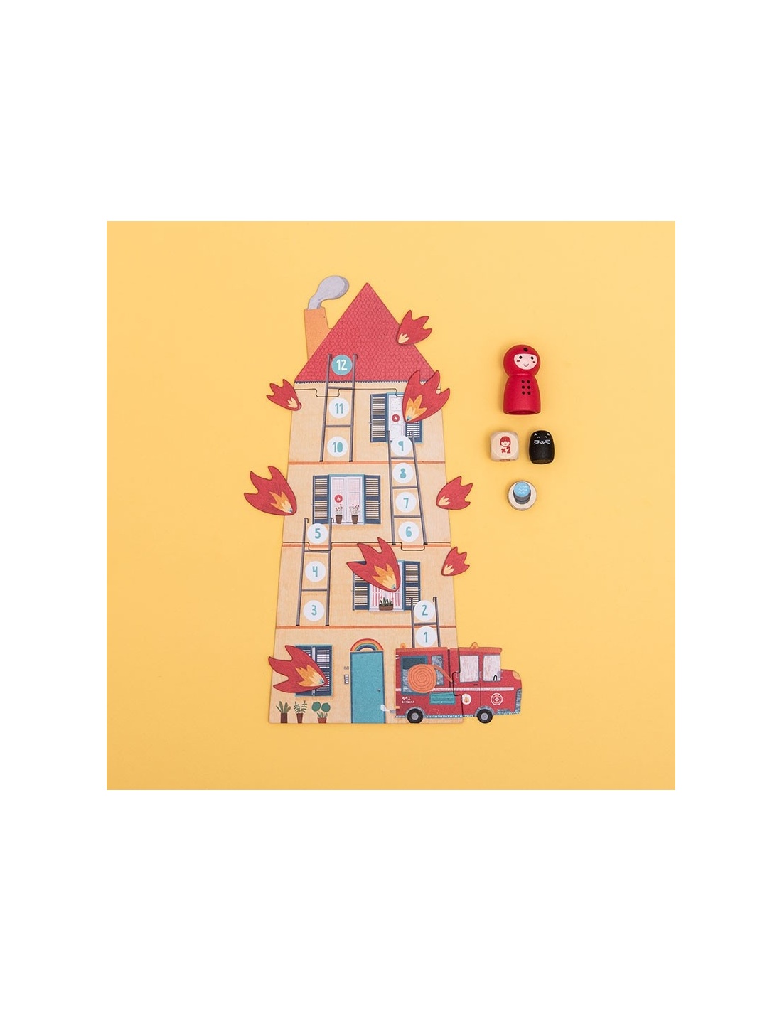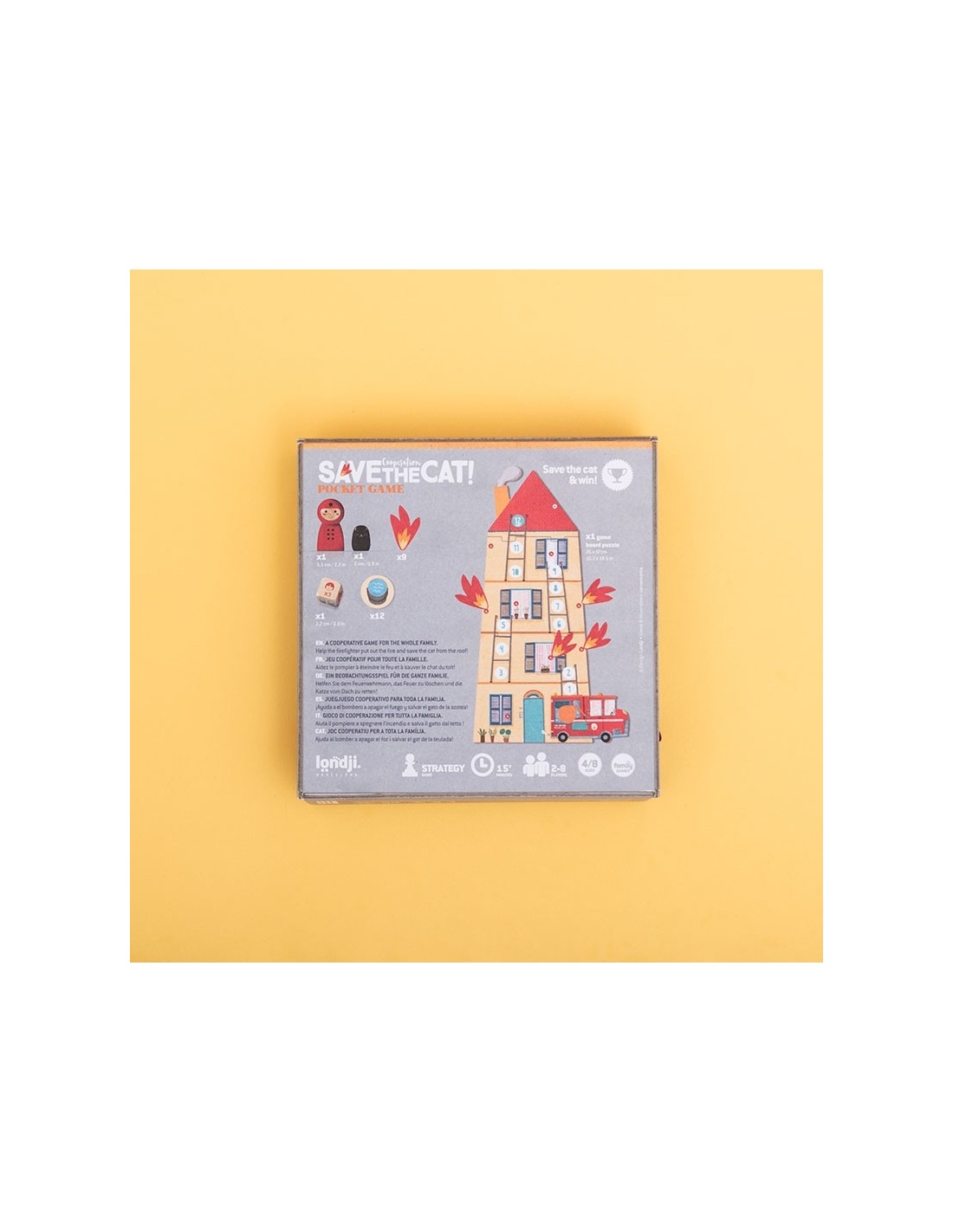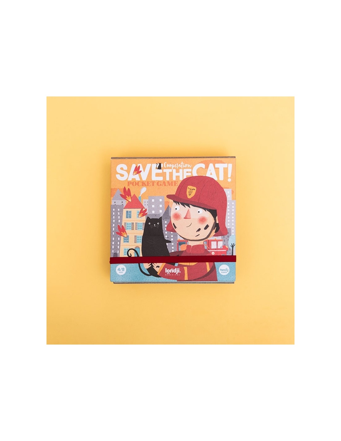 ¡Un juego de mesa cooperativo para niños a partir de los 4 años donde tendremos que ayudar a los bomberos a rescatar a un gatito del fuego! En formato bolsillo para llevar de viaje.