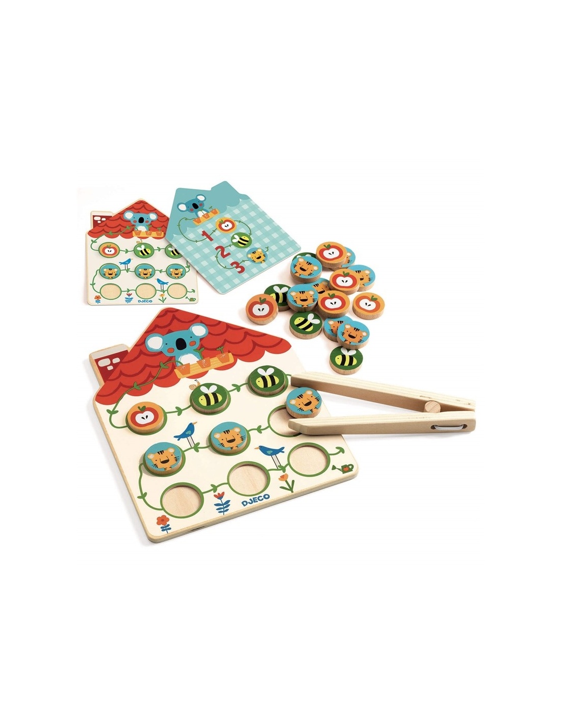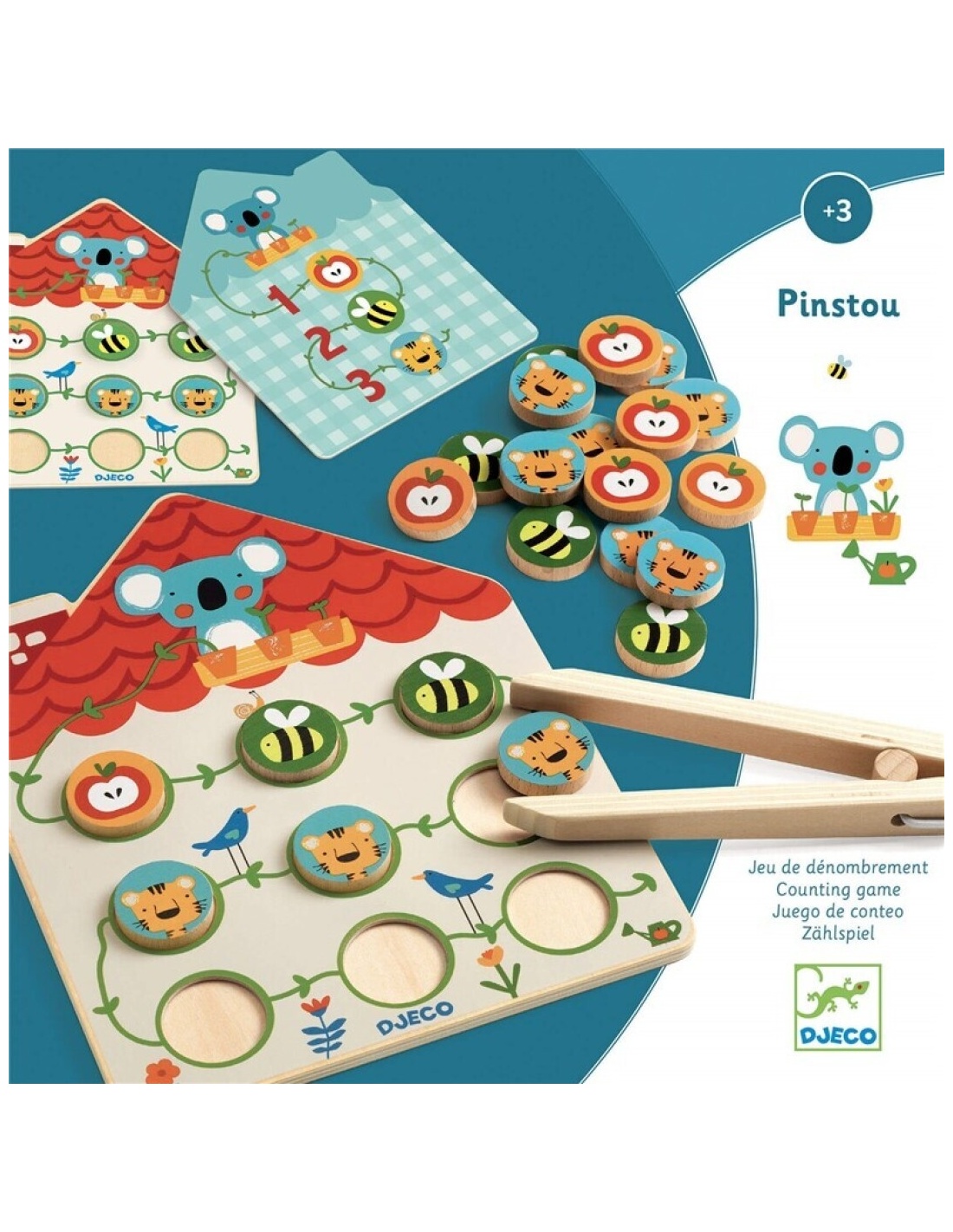 Pinstout es un juego diseñado para contar y desarrollar la destreza manual. El koala da las instrucciones, y el niño debe colocar el número correcto de elementos sobre la base usando una pinza. En el reverso de las tarjetas, encontrará imágenes con las soluciones, lo que facilita el aprendizaje y hace el juego aún más interactivo.