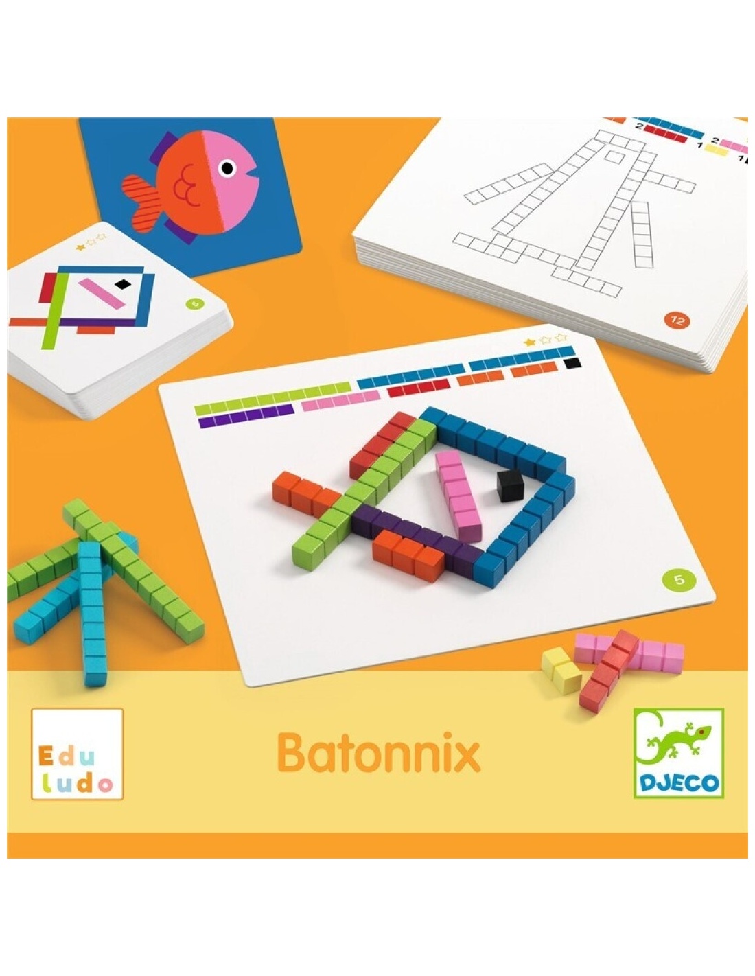 Batonnix de Djeco es un juego educativo ideal para que los niños aprendan conceptos matemáticos básicos mientras se divierten. A través de palitos de madera de distintos tamaños, los pequeños reproducen figuras, desarrollando la observación, la percepción espacial y la comparación de longitudes. Con 18 cartas de distintos niveles y sistema autocorregible, es perfecto para fomentar la autonomía y el aprendizaje a su ritmo, siempre con el encanto y la calidad de Djeco.