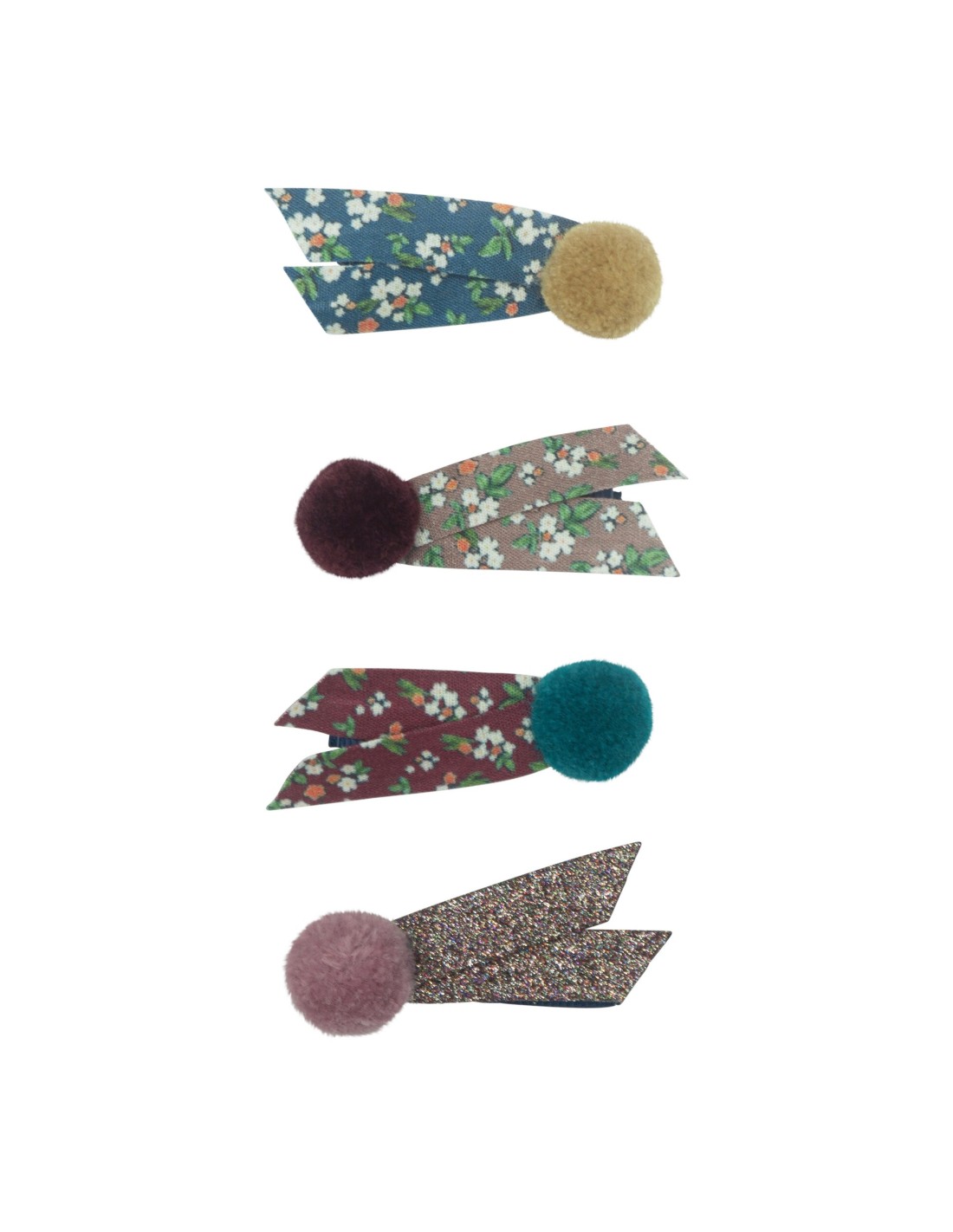 ¡El pack más bonito de clips con pompones con un toque especial! Pompones súper suaves en tonos cálidos y ricos, sujetos de forma segura a cintas de tela con estampado floral delicado y glitter. ¡Perfectos para decorar todo tipo de peinados!