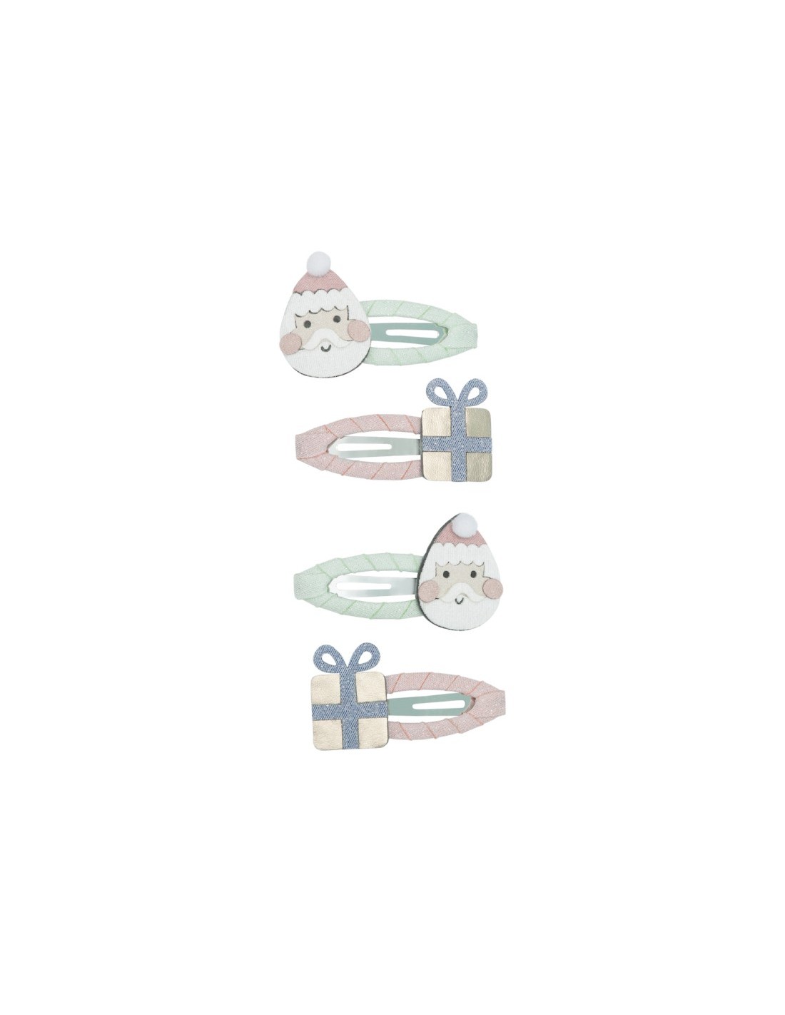 4 Clips clic clac de 5 cm envueltos en cinta metálica en tonos pastel suaves: caras alegres de Santa y regalos de Navidad hechos con telas metálicas, lisas y con purpurina.