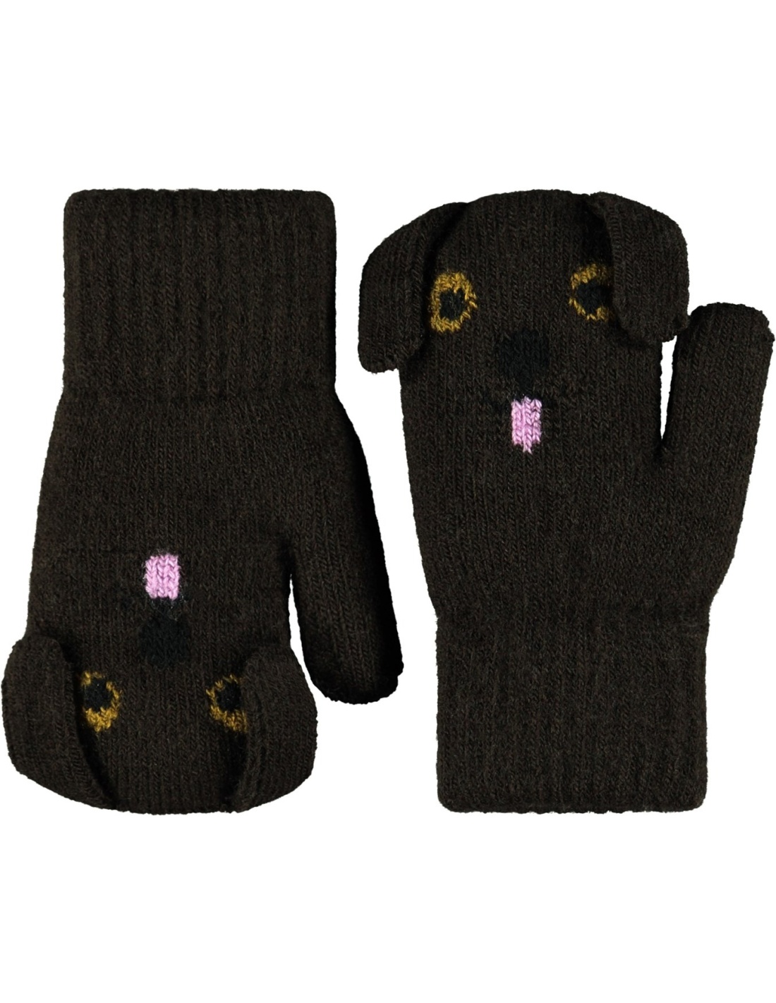 Manoplas de punto en color marrón oscuro para los más pequeños, con una adorable carita de perrito. Tienen un puño acanalado en la muñeca para mantenerlas en su sitio y un forro interior de suave felpa que ayuda a mantener las manos abrigadas.