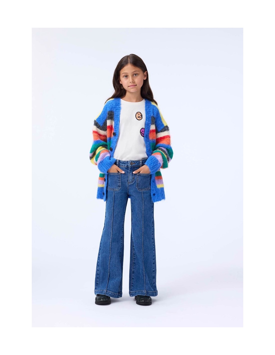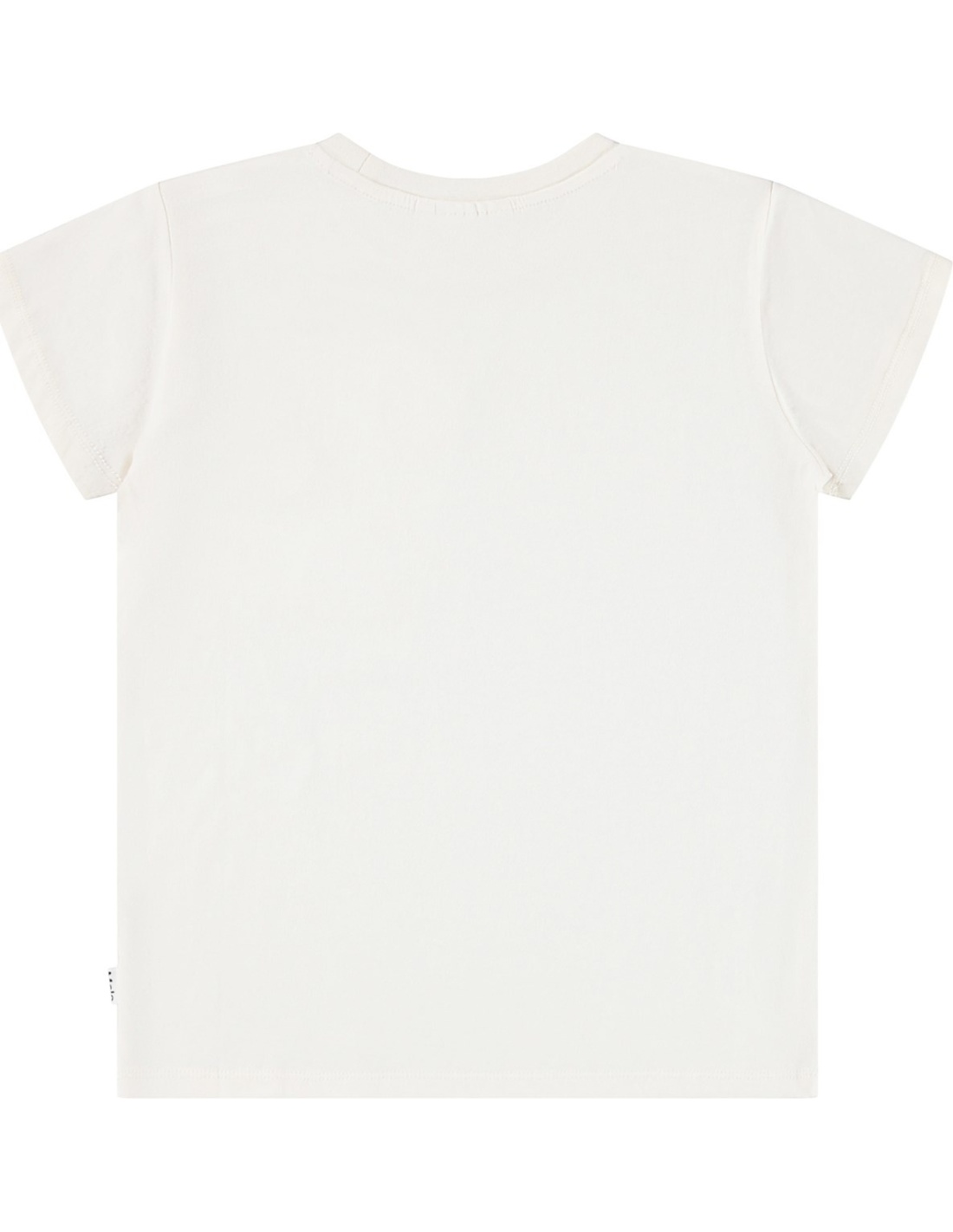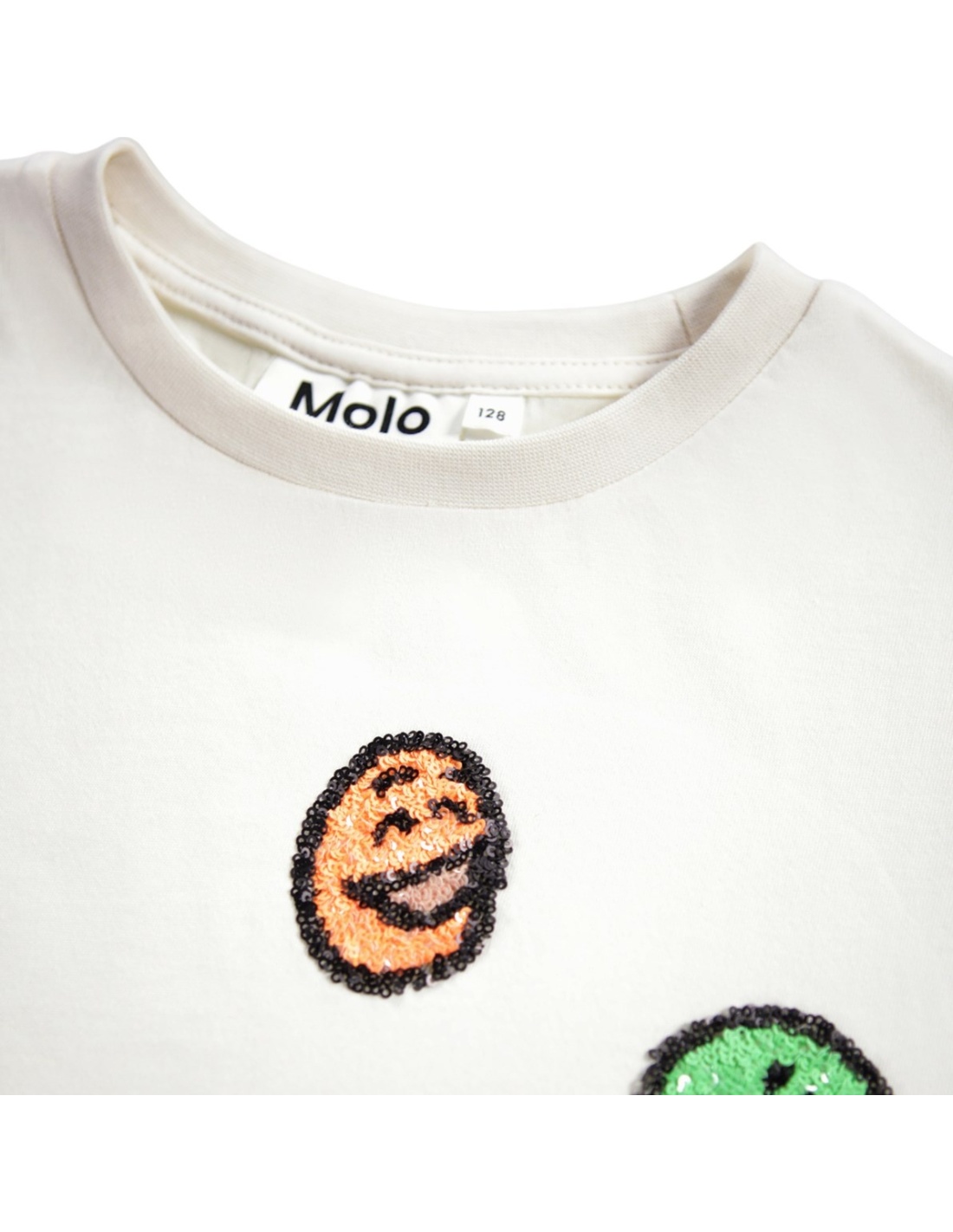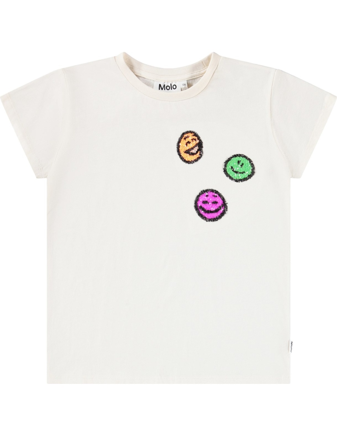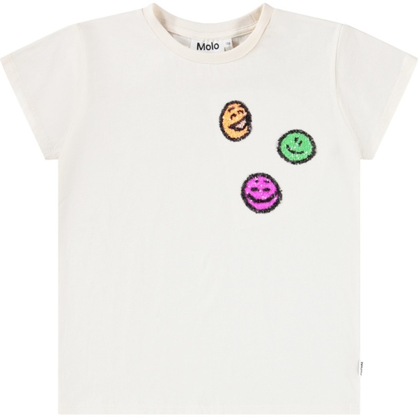 Camiseta de manga corta en color blanco hueso, confeccionada en algodón orgánico con cuello redondo. Tiene un corte regular y destaca por tres caritas sonrientes de lentejuelas de colores en el pecho, que le dan un toque alegre y divertido.